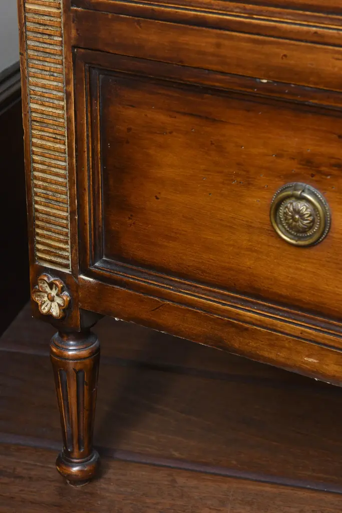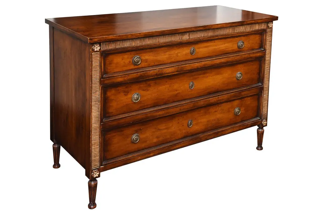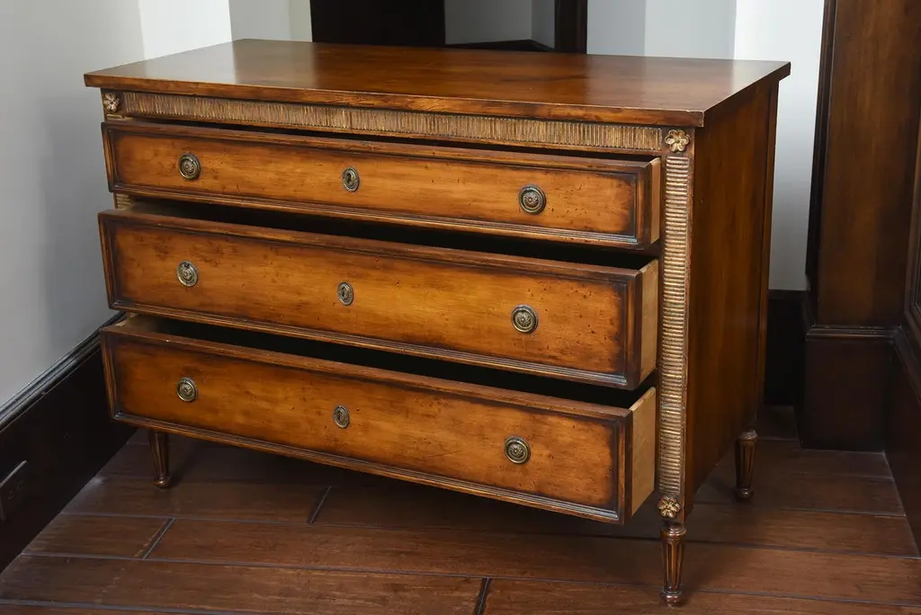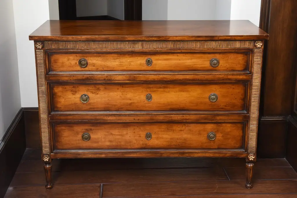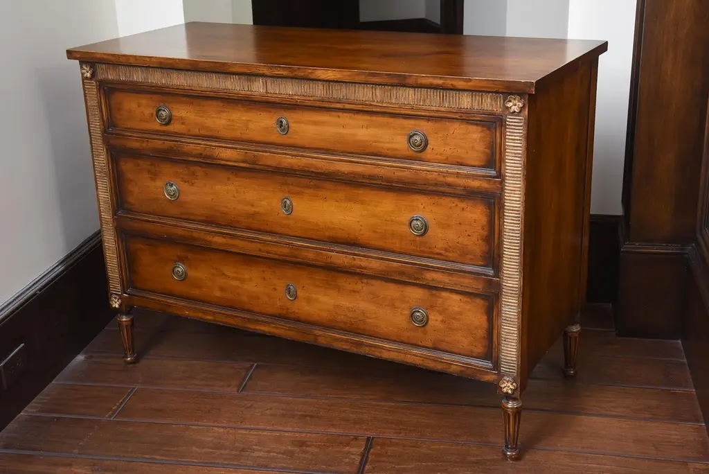 An Italian three-drawer chest with inlay accents, crafted by Bussandri in the early 21st century. This exquisite fruitwood chest features delicate inlay banding outlining the perimeter of the top, drawer fronts, and sides. The rectangular-shaped top sits above a case housing three drawers, each fitted with bronze knobs and decorative escutcheons at their center. The chest is adorned with a gold-gilded elaborated design on the frame, adding a touch of opulence and refinement. It rests on four spade-carved legs, and the drawers are lined with old damask fabric. Recently refinished, this chest combines timeless style with versatility, making it a perfect addition to various interiors.