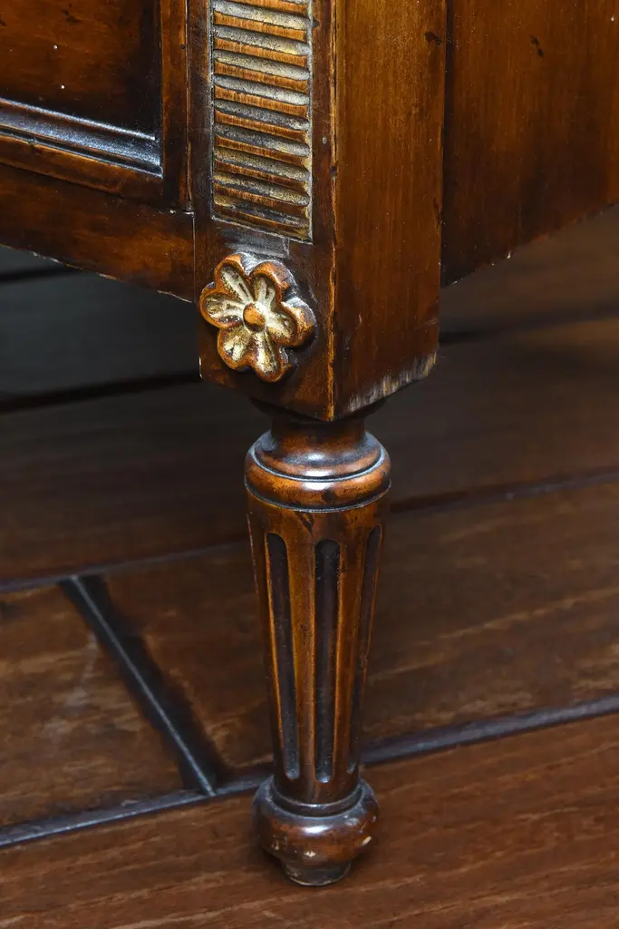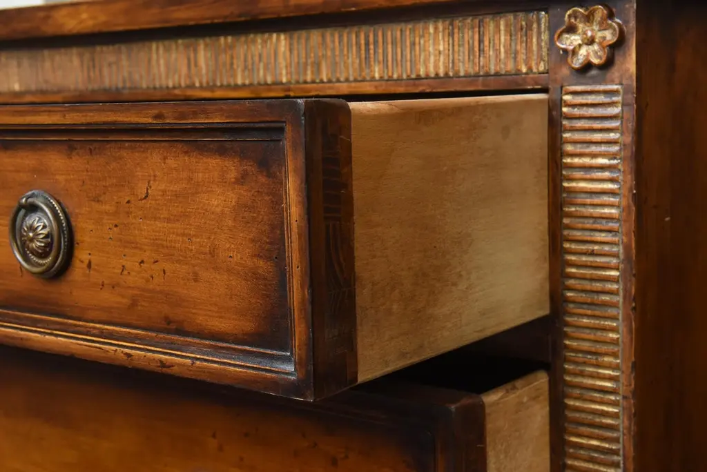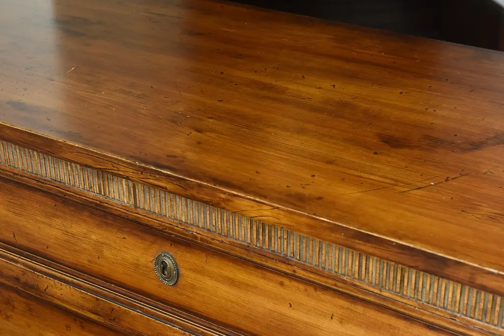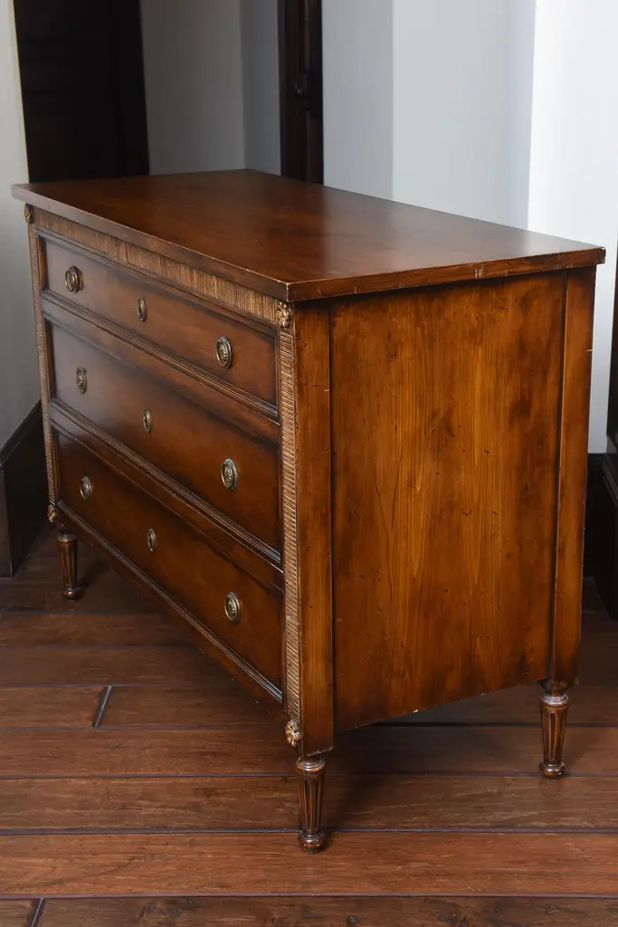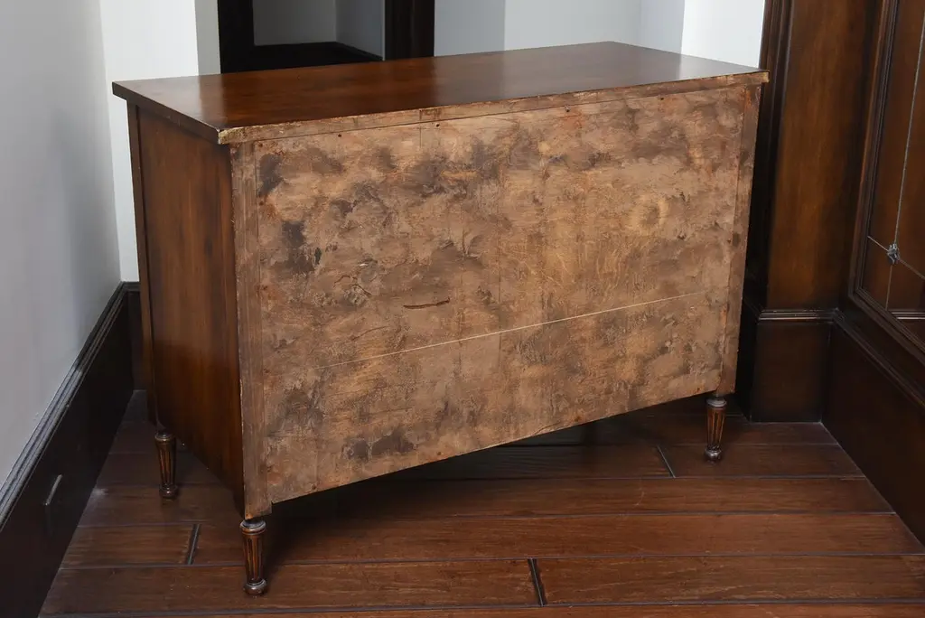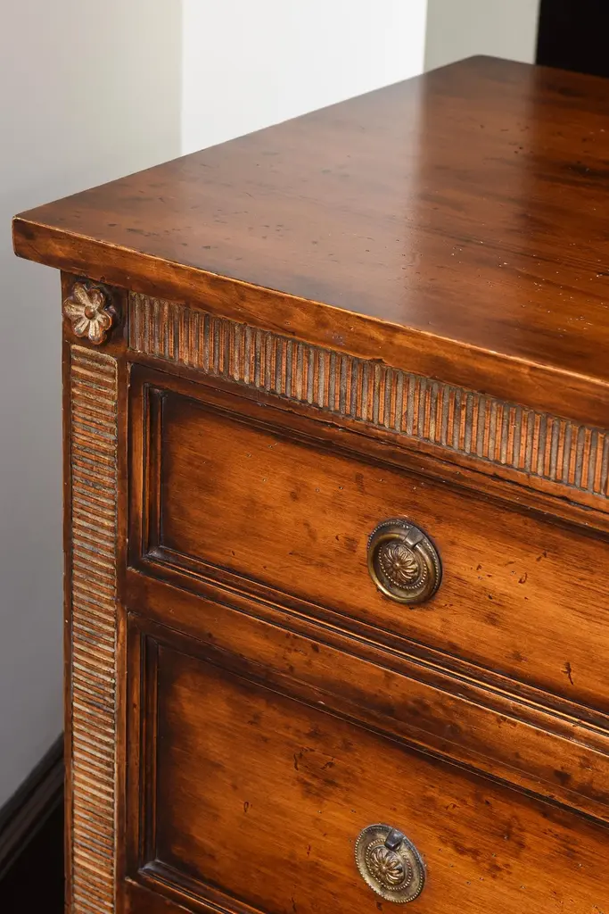An Italian three-drawer chest with inlay accents, crafted by Bussandri in the early 21st century. This exquisite fruitwood chest features delicate inlay banding outlining the perimeter of the top, drawer fronts, and sides. The rectangular-shaped top sits above a case housing three drawers, each fitted with bronze knobs and decorative escutcheons at their center. The chest is adorned with a gold-gilded elaborated design on the frame, adding a touch of opulence and refinement. It rests on four spade-carved legs, and the drawers are lined with old damask fabric. Recently refinished, this chest combines timeless style with versatility, making it a perfect addition to various interiors.