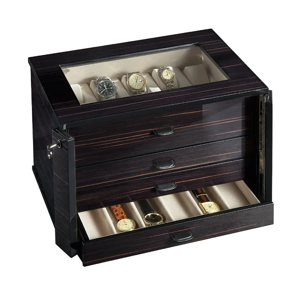 Since 1949, Agresti has crafted the pinnacle of luxury safes, trunks, and jewelry boxes in Florence, using only the finest materials, including full-grain leather, exotic woods, and textures like shagreen. As the premier name in high-end, custom solutions for safeguarding valuables, Agresti integrates cutting-edge security features: biometric access, secret compartments, unique keys, and hidden doorseverything you see in movies, they make real. Favored in multimillion-dollar estates, yachts, and private jets. Contact us to discover more about this exceptional product. Elevate your timepiece collection with the Agresti Il Mio Tempo 28-Holder Watch Chest. This polished ebony chest stores up to 28 watches, keeping them secure and beautifully displayed on holders or laying down. Add an exclusive touch to your collection and safeguard your luxury watches with this lockable chest.