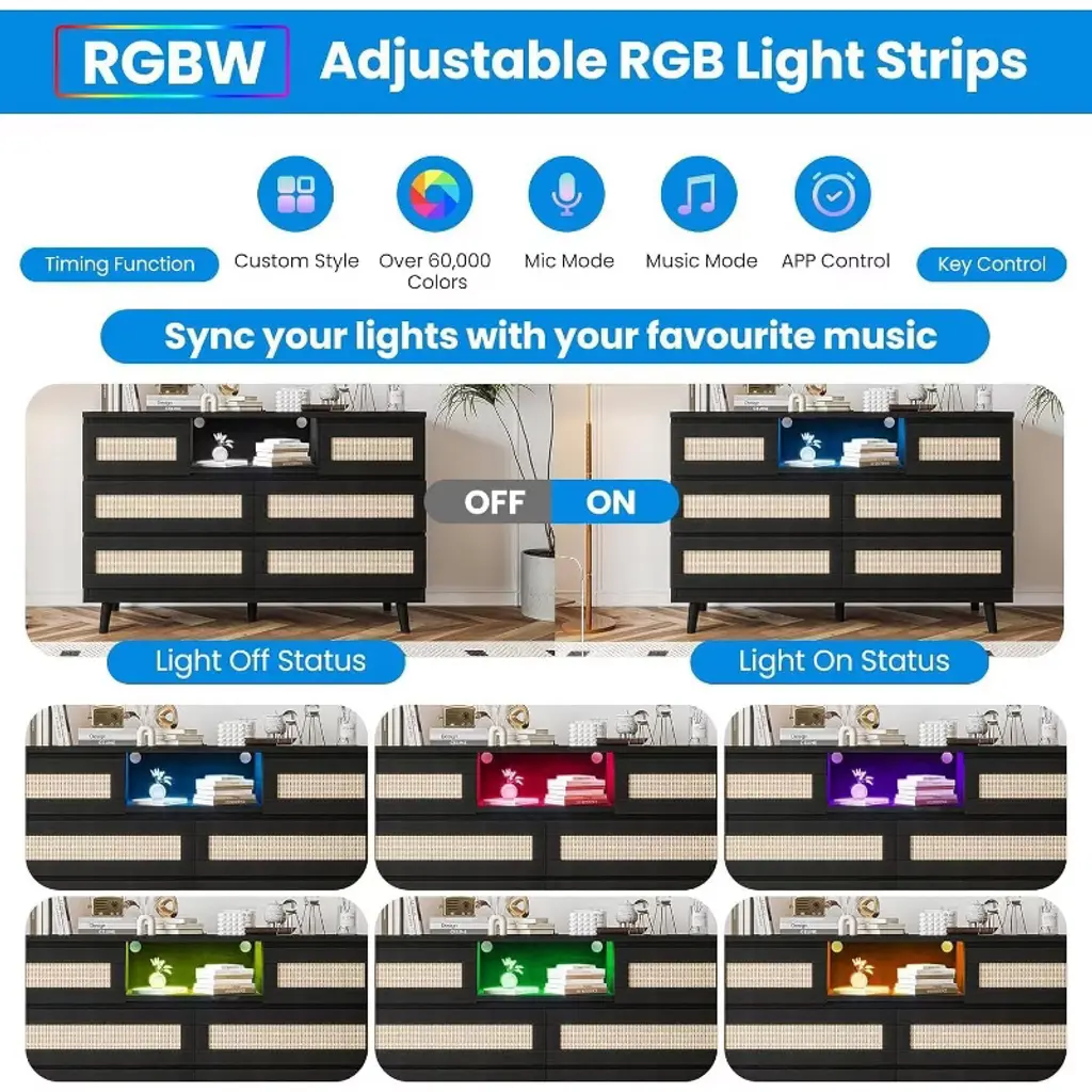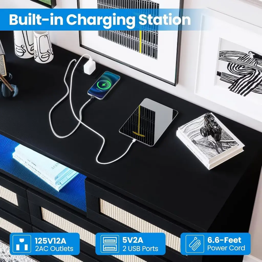 47" Rattan Wooden Dresser With 6 Drawers, Charging Station & Led Lights, Modern Dresser With Open Shelves For Bedroom & Living Room