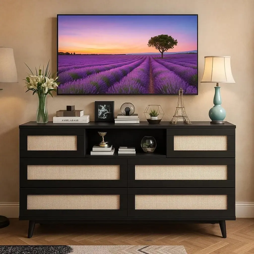 This 47-inch rattan wooden dresser features 6 spacious drawers, a built-in charging station, and LED lights, combining modern design with practical functionality. Open shelves provide additional storage for books, decor, or electronics. Ideal for bedrooms, living rooms, hallways, or entryways, it helps keep spaces organized while adding style. Crafted from durable wood, this dresser ensures long-lasting use and enhances home decor.
