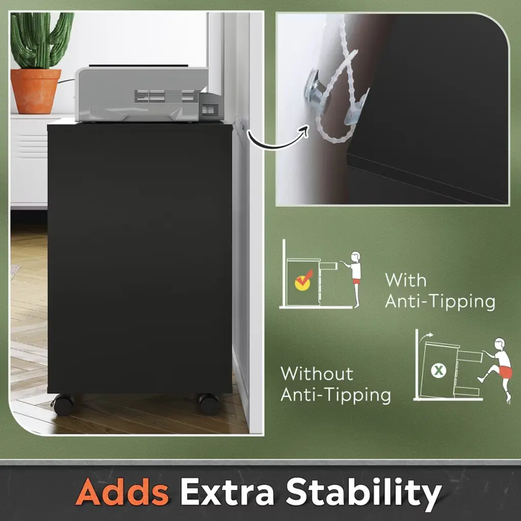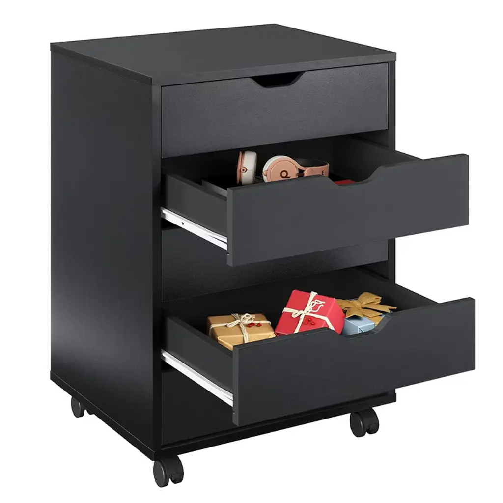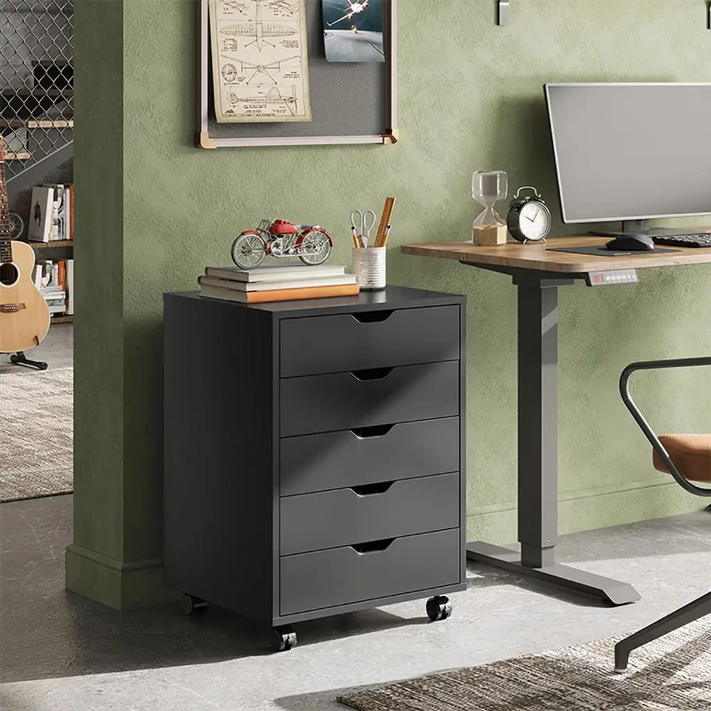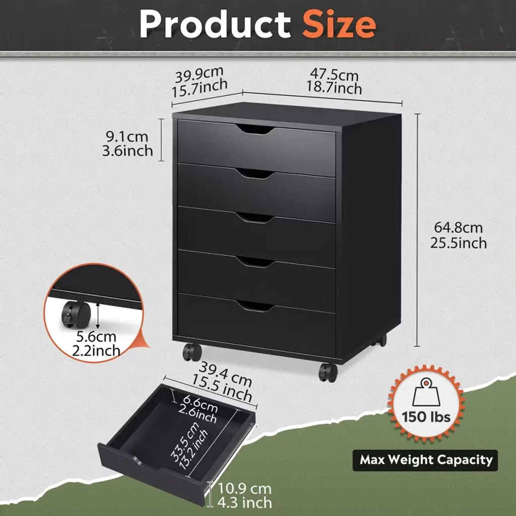 5-drawer Chest, Wood Storage File Cabinet For Home Office Or Study, Mobile Design With Wheels, Black