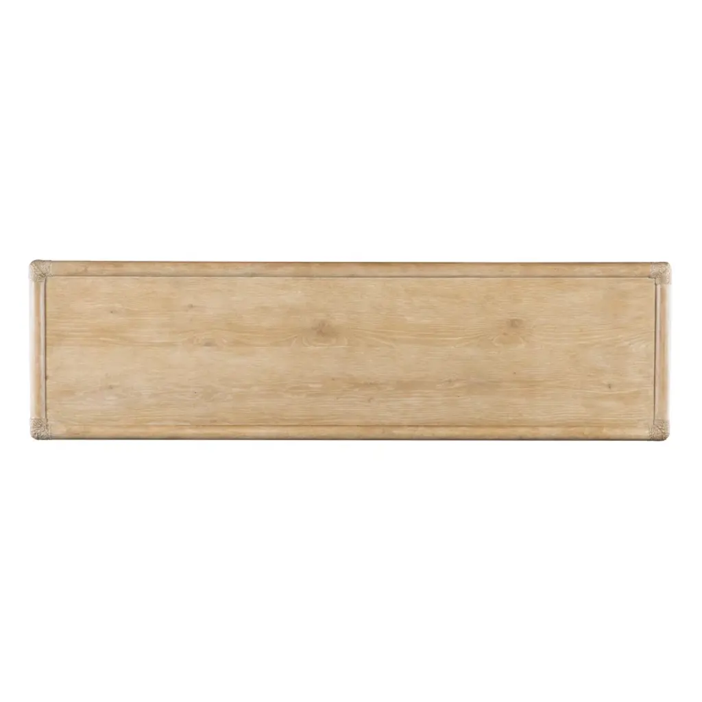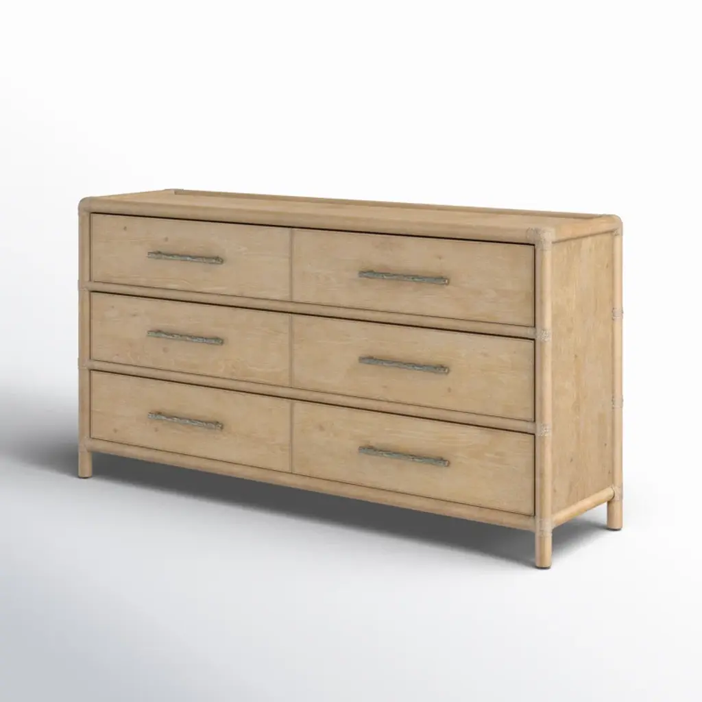 Inspired by tropical getaways, the Isla pole rattan dresser is a blend of natural materials in a laid-back, versatile design. Crafted of oak and maple veneers with rope accents, the dresser is finished in black sand, transparent by design to reveal the unique grain patterns in the wood veneer. Offering six self-closing drawers, the top left drawer has a removable felt liner and the top right drawer has a removable felt liner. The bottom two drawers are cedar-lined. The textured, pewter-colored bar pulls add a look of natural elegance.