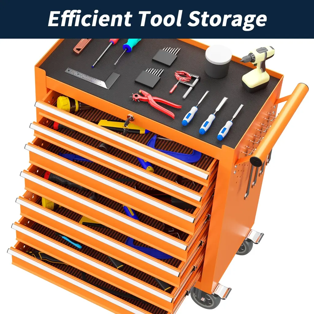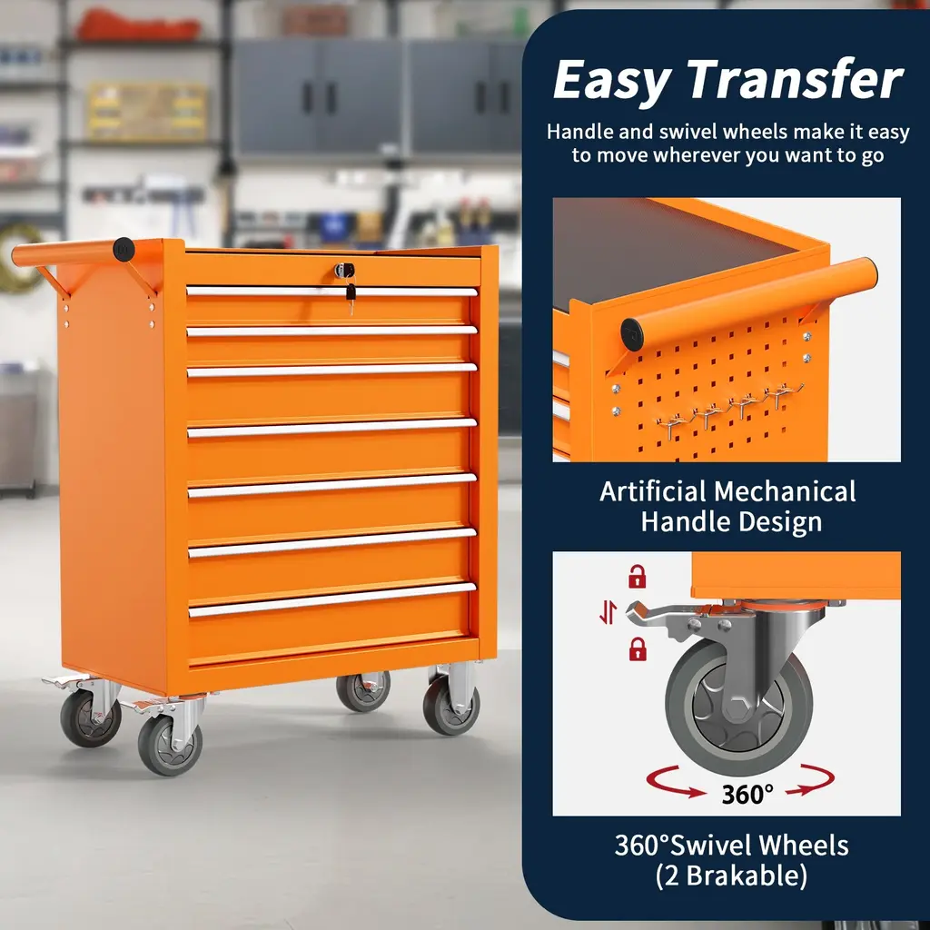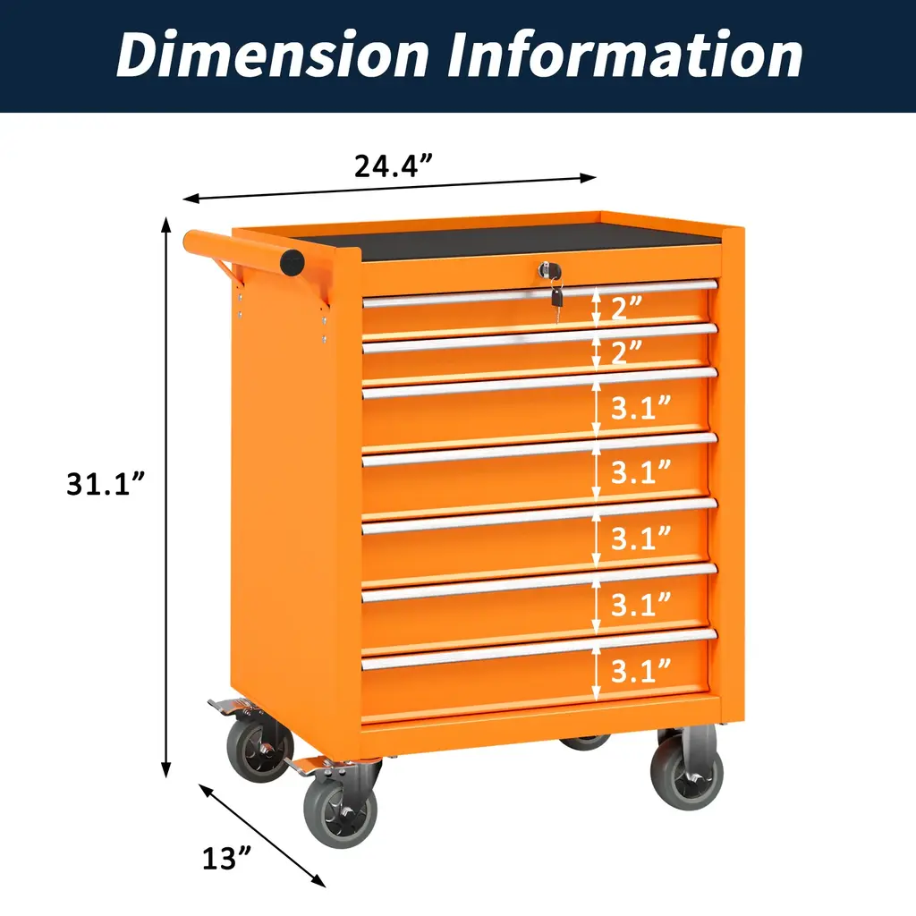 【High Quality Material】Our tool chest is made from durable cold-rolled steel, designed for long-lasting performance. The surface is coated with a corrosion- and rust-resistant finish, ensuring the toolbox withstands harsh conditions and remains in top shape over time. 【Spacious Storage Capacity】This rolling tool box offers seven drawers, providing ample storage for all your tools. The multiple drawers help you efficiently categorize tools, ensuring everything has a place, making your workspace more organized. 【Smooth Mobility Upgrade】Move your rolling tool chest effortlessly with upgraded 4-inch wheels, designed for smooth rolling across different surfaces.The two brake wheels ensure stability, allowing you to lock the toolbox securely in place wherever you want, preventing any unwanted movement. 【Streamlined Tool Access】This tool chest with wheels is designed for easy access to your tools, featuring drawers with different heights to accommodate various tool sizes. The smooth-gliding drawers let you quickly grab what you need, while the varied heights ensure that both small and large tools are stored efficiently in the right space. 【Easy to Assemble & Multi-Purpose】 This tool box is easy to assemble with detailed instructions. Its sturdy construction and ample storage make it perfect for garages, workshops, repair shops, and other workspaces. The tool chest with wheels is a reliable and versatile storage solution for any professional or DIY enthusiast.