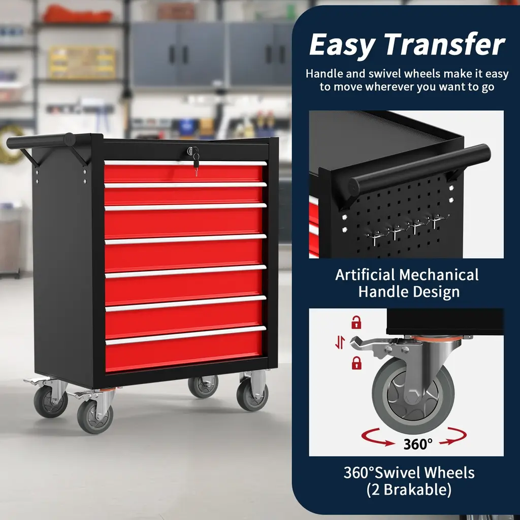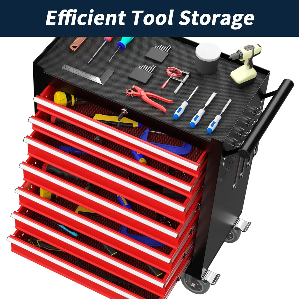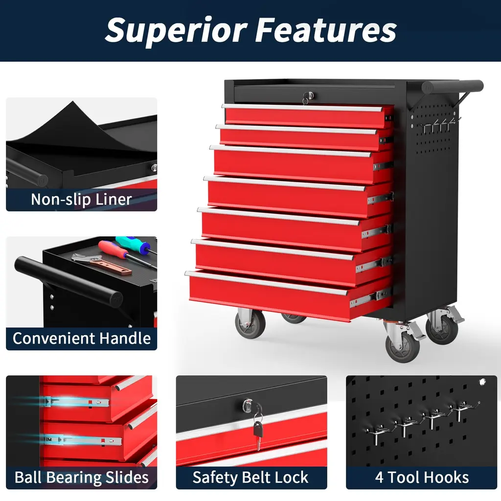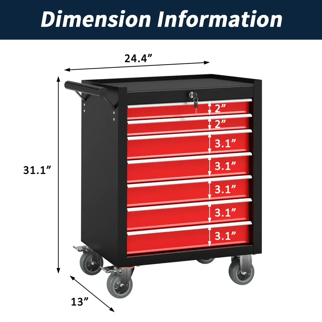 【High Quality Material】Our tool chest is made from durable cold-rolled steel, designed for long-lasting performance. The surface is coated with a corrosion- and rust-resistant finish, ensuring the toolbox withstands harsh conditions and remains in top shape over time. 【Spacious Storage Capacity】This rolling tool box offers seven drawers, providing ample storage for all your tools. The multiple drawers help you efficiently categorize tools, ensuring everything has a place, making your workspace more organized. 【Smooth Mobility Upgrade】Move your rolling tool chest effortlessly with upgraded 4-inch wheels, designed for smooth rolling across different surfaces.The two brake wheels ensure stability, allowing you to lock the toolbox securely in place wherever you want, preventing any unwanted movement. 【Streamlined Tool Access】This tool chest with wheels is designed for easy access to your tools, featuring drawers with different heights to accommodate various tool sizes. The smooth-gliding drawers let you quickly grab what you need, while the varied heights ensure that both small and large tools are stored efficiently in the right space. 【Easy to Assemble & Multi-Purpose】 This tool box is easy to assemble with detailed instructions. Its sturdy construction and ample storage make it perfect for garages, workshops, repair shops, and other workspaces. The tool chest with wheels is a reliable and versatile storage solution for any professional or DIY enthusiast.