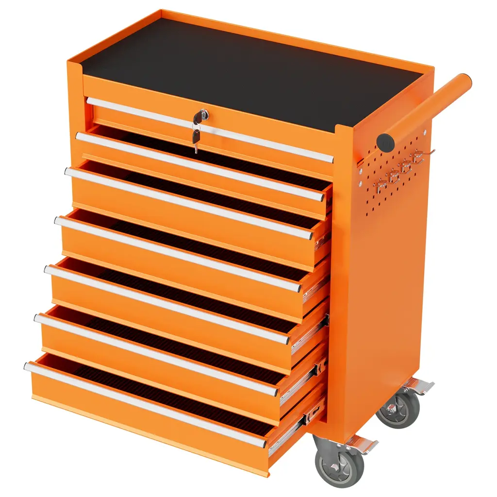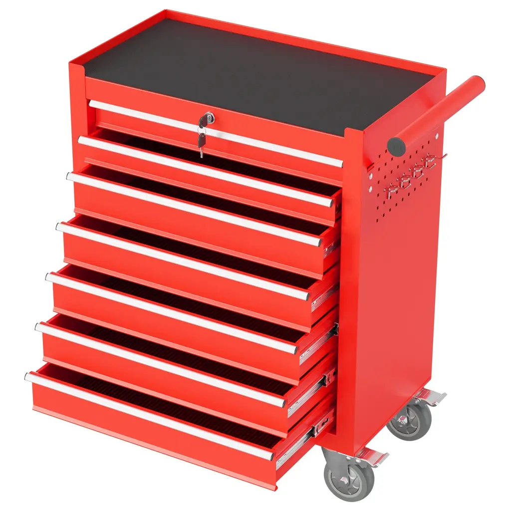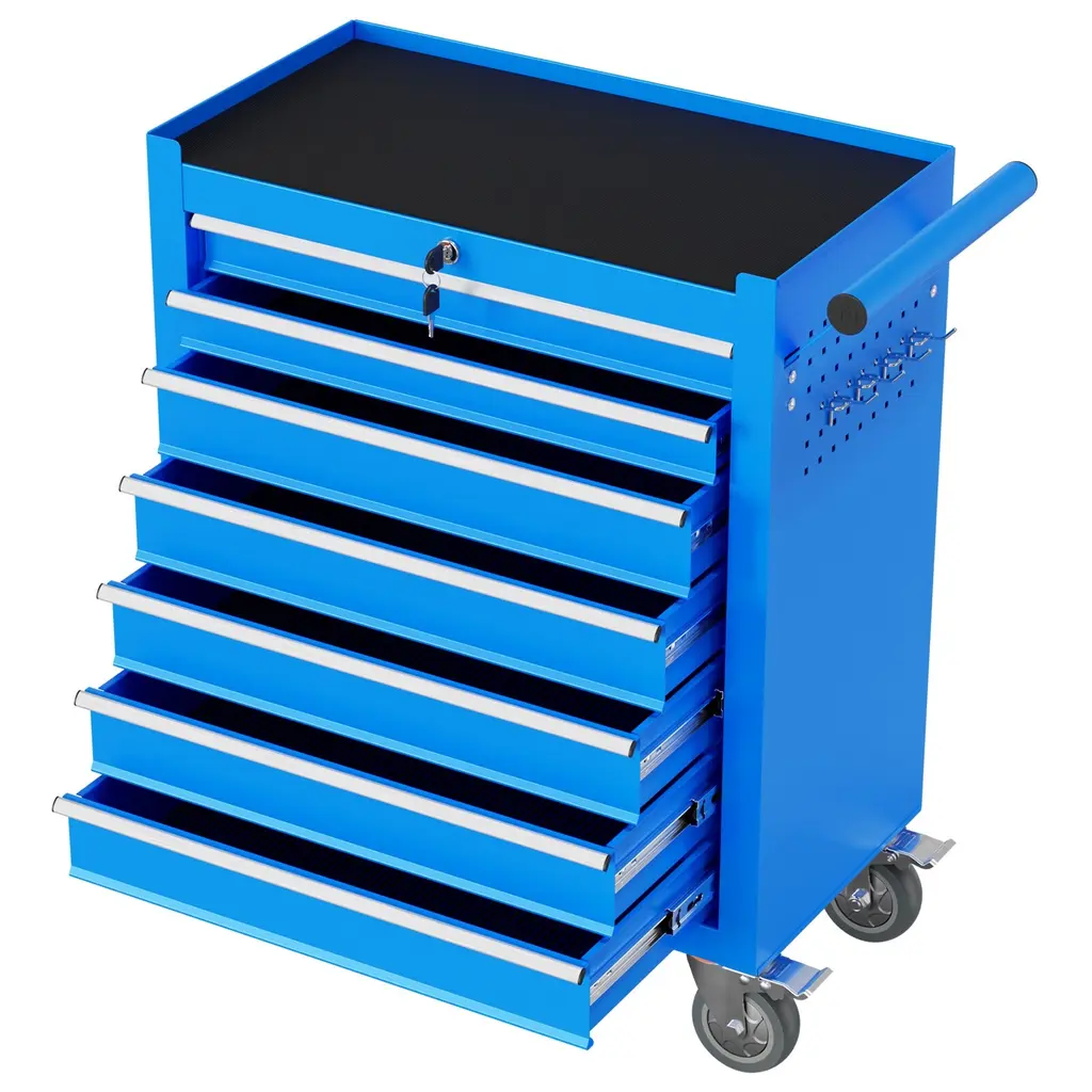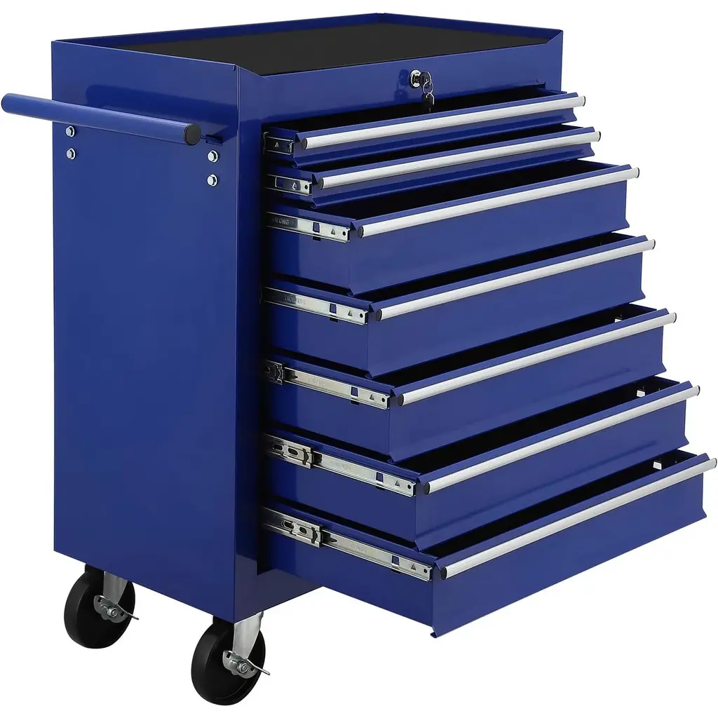 【High Quality Material】Our tool chest is made from durable cold-rolled steel, designed for long-lasting performance. The surface is coated with a corrosion- and rust-resistant finish, ensuring the toolbox withstands harsh conditions and remains in top shape over time. 【Spacious Storage Capacity】This rolling tool box offers seven drawers, providing ample storage for all your tools. The multiple drawers help you efficiently categorize tools, ensuring everything has a place, making your workspace more organized. 【Smooth Mobility Upgrade】Move your rolling tool chest effortlessly with upgraded 4-inch wheels, designed for smooth rolling across different surfaces.The two brake wheels ensure stability, allowing you to lock the toolbox securely in place wherever you want, preventing any unwanted movement. 【Streamlined Tool Access】This tool chest with wheels is designed for easy access to your tools, featuring drawers with different heights to accommodate various tool sizes. The smooth-gliding drawers let you quickly grab what you need, while the varied heights ensure that both small and large tools are stored efficiently in the right space. 【Easy to Assemble & Multi-Purpose】 This tool box is easy to assemble with detailed instructions. Its sturdy construction and ample storage make it perfect for garages, workshops, repair shops, and other workspaces. The tool chest with wheels is a reliable and versatile storage solution for any professional or DIY enthusiast.