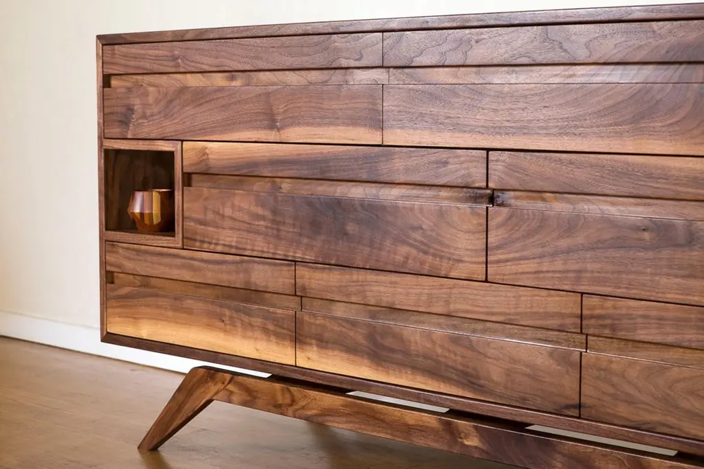 This dresser is an original design, inspired by the modern, minimal, clean aesthetic of midcentury/ Danish modern. It has seven drawers that glide on soft-close hardware for the utmost in smooth operation, and the two cubbie openings are there to be filled by your imagination.The dresser is 60" wide, 23" deep and 30" tall. It is built from walnut and incorporates mortise and tennon joinery (i.e. strong joints that will last forever). It is has a hand-rubbed oil finish that leaves a beautiful lustre (without being super shiny).The drawers are built from Baltic birch with dovetail joinery.The dresser is built entirely by hand right here in Southern California.
