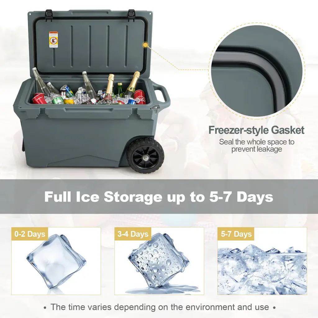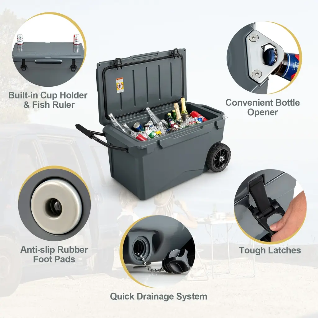 Specifications:Key Features:● Fully Insulated Design: This wheeled cooler is designed with a freezer-style gasket and tough latches that seal the whole space to prevent leakage. So, it boasts unmatched insulation and satisfies your different requirements. The rotomolded ice chest can keep cold for 5-7 days, keep fresh for 5-7 days and keep warm for 2-3 days.● Reliable Construction: Made of thick and durable LLDPE and polyurethane, this insulated cooler will accompany you for years. Besides, the rotomolded construction ensures overall sturdiness. And the anti-slip rubber foot pads prevent sliding to keep the cooler box in place.● Worry-free Transport: Thanks to the aluminum tow handle with soft foam and heavy-duty wheels, you can easily move the insulated ice chest anywhere you desire. More importantly, the practical side handle as well as integrated grips provides more carrying options.● Considerate Details: The built-in cup holders offer places for your cups. Moreover, the fish ruler allows you to measure the catches instantly. With a convenient bottle opener on the side, you are able to have access to cool drinks simply. Furthermore, the quick drainage system ensures easy draining.● Wide Application: In addition to picnic, this portable cooler on wheels is suitable for camping, party, fishing, road trip. When getting tired, you can close the lid to have a seat and take a rest. Also, the rolling wheeled ice chest can be used as a picnic table if required.Overview: