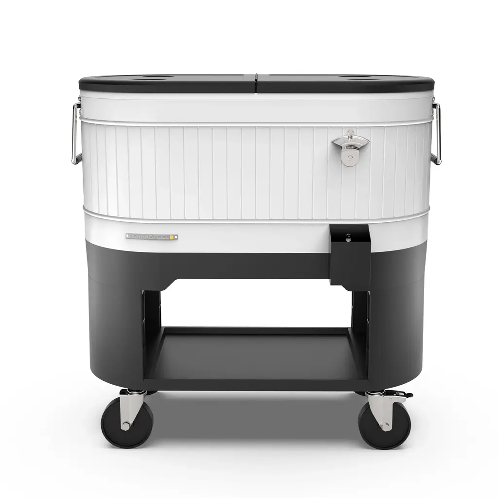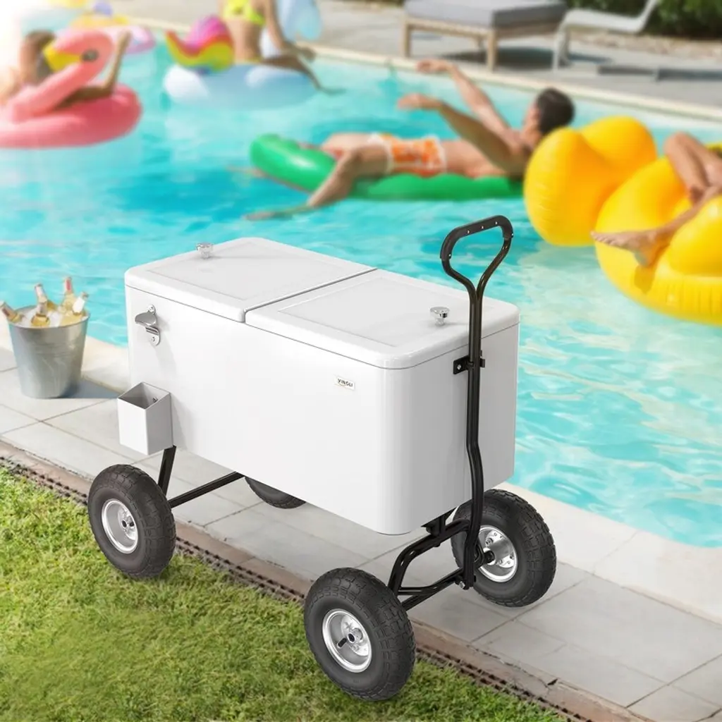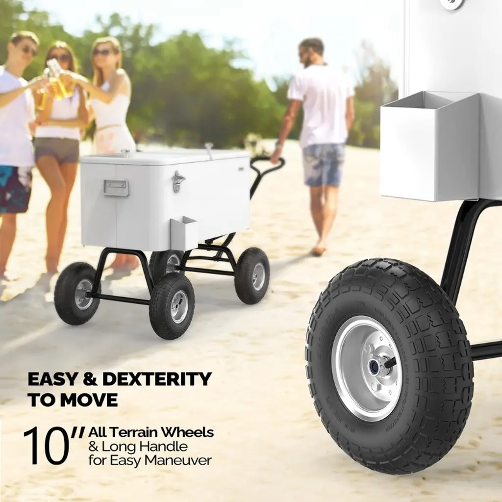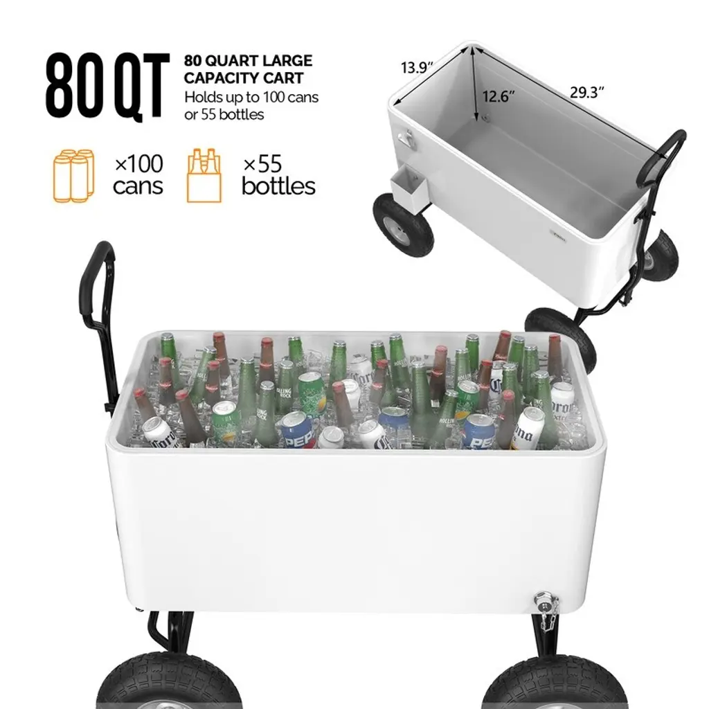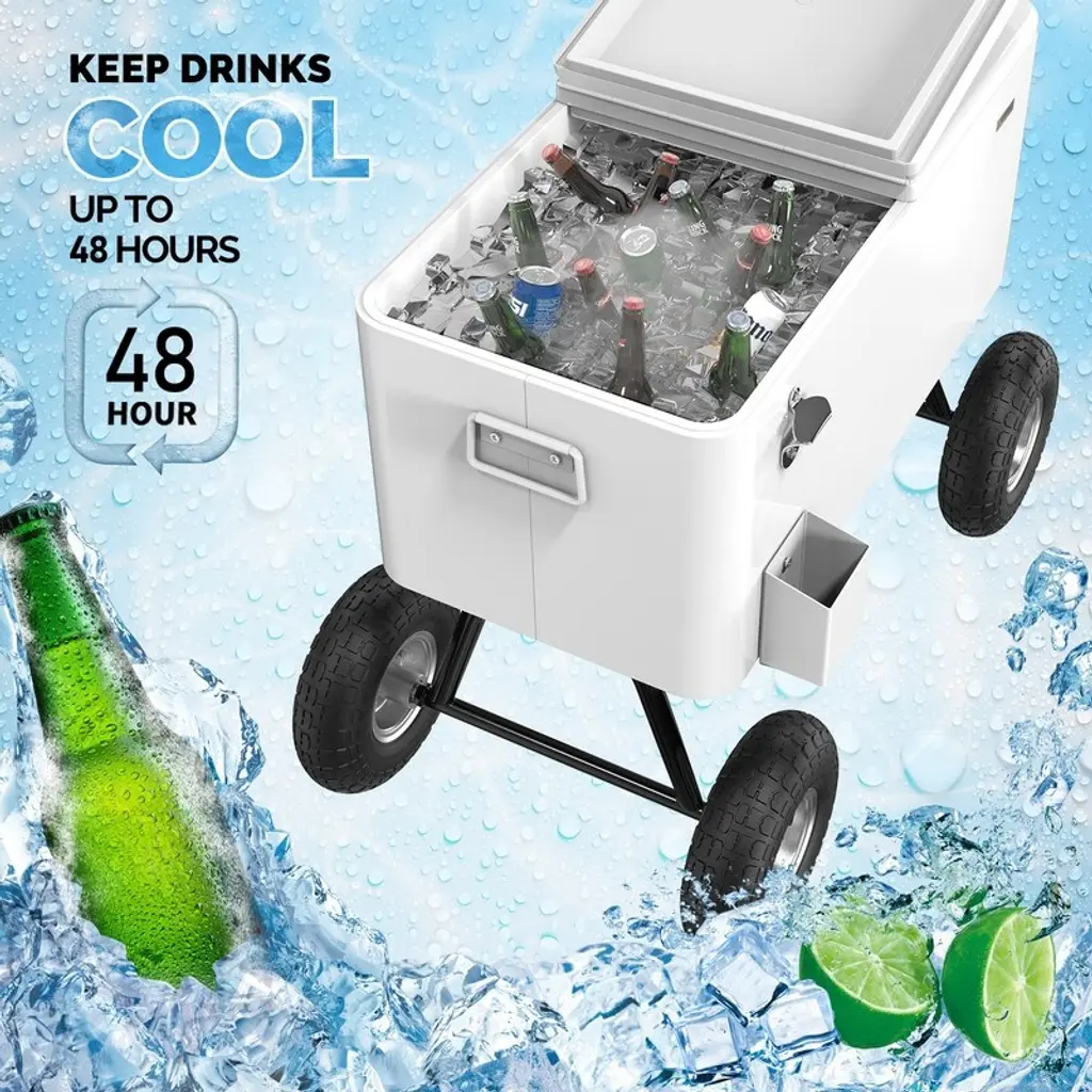 80 Quart Outdoor Wagon Rolling Cooler Ice Chest With Handle And 10" Wheels - White