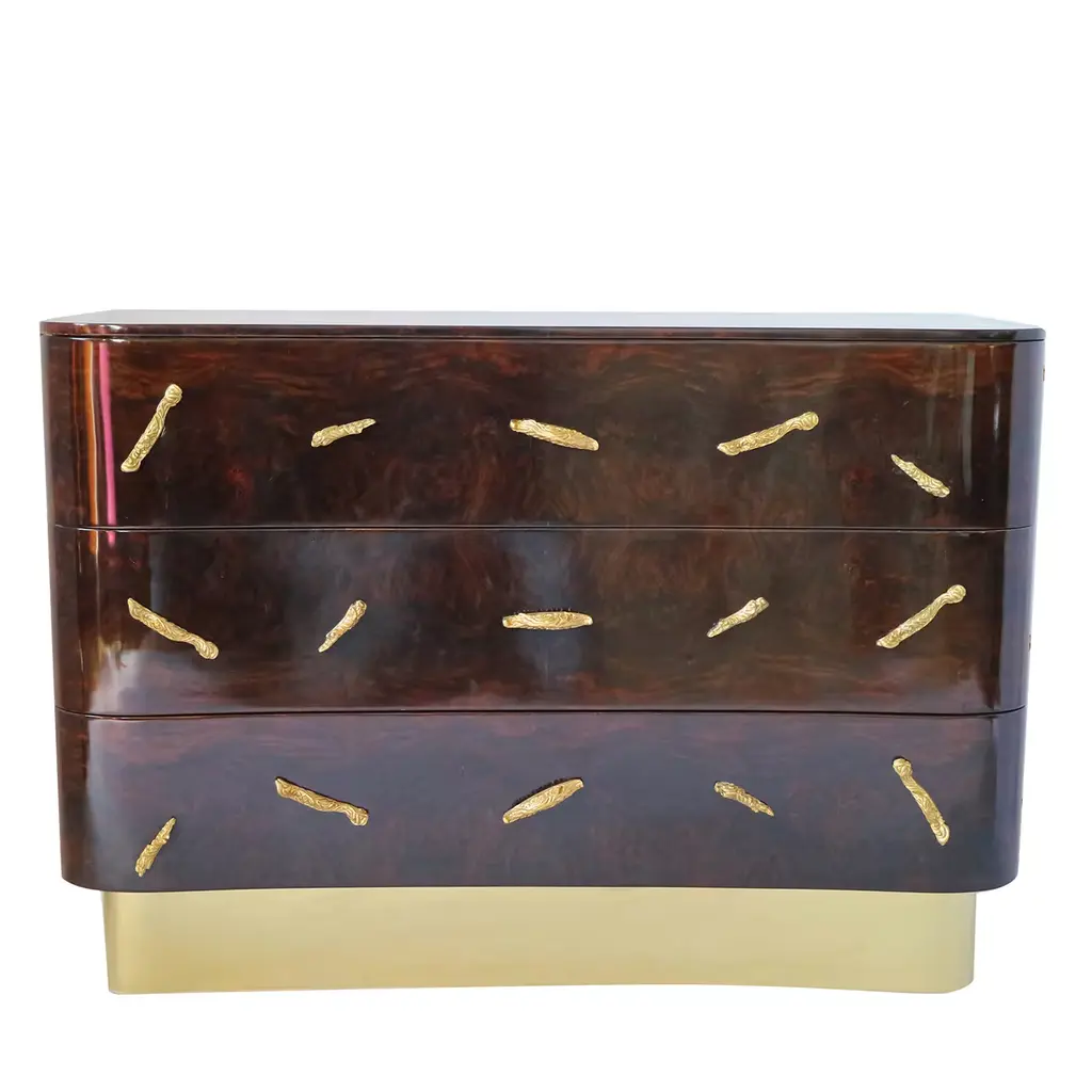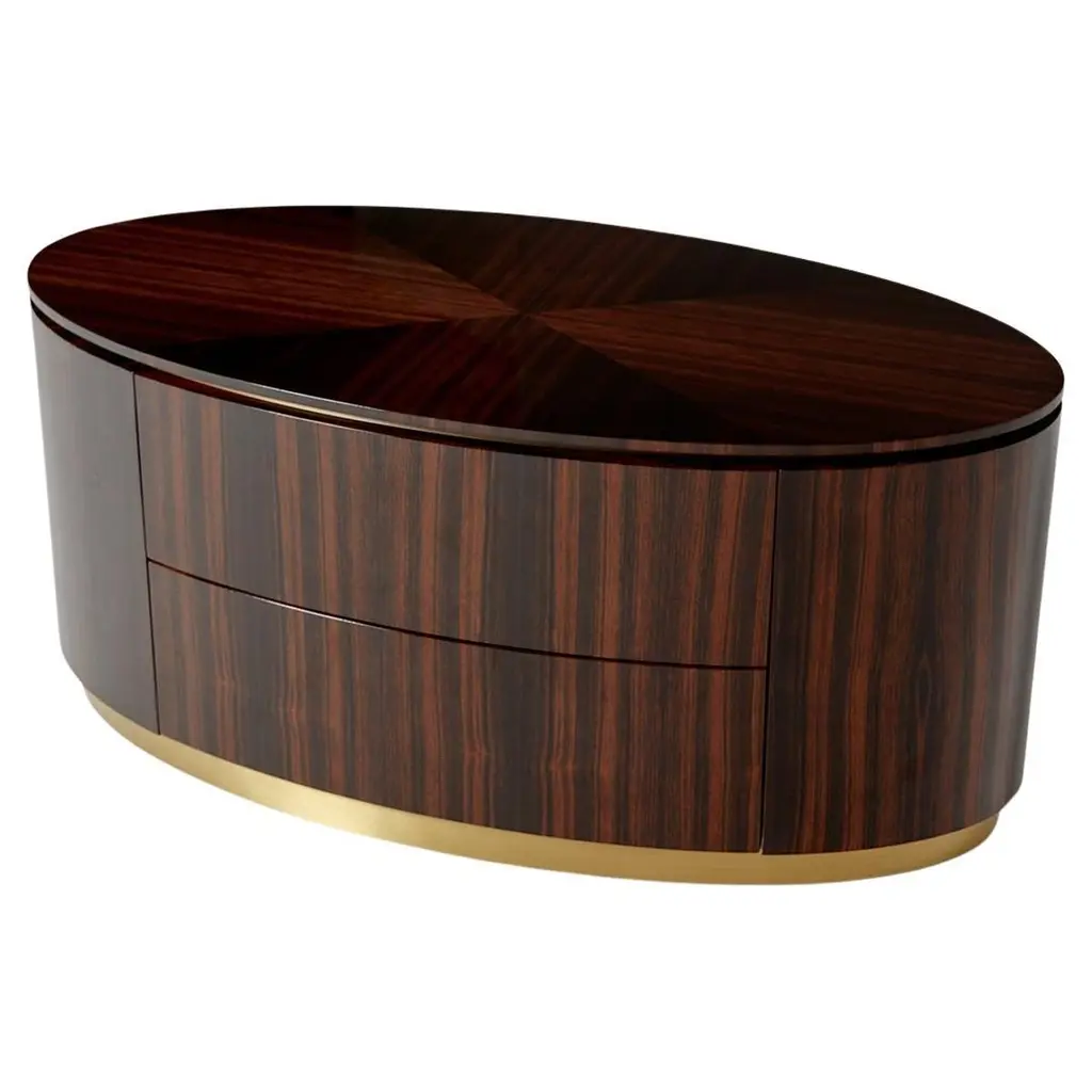 Combining the dark elegance of ebony with the strikingly large grain of the ziricote wood, this oval chest of drawers is a stunning piece of functional decor that will enrich the look of any bedroom. The bold structure rests on a base in brass, which occurs also in the metal details and in the handles of the drawers. The base boasts inserts of Corteccia marble for a luxurious final effect. Matching night tables available.