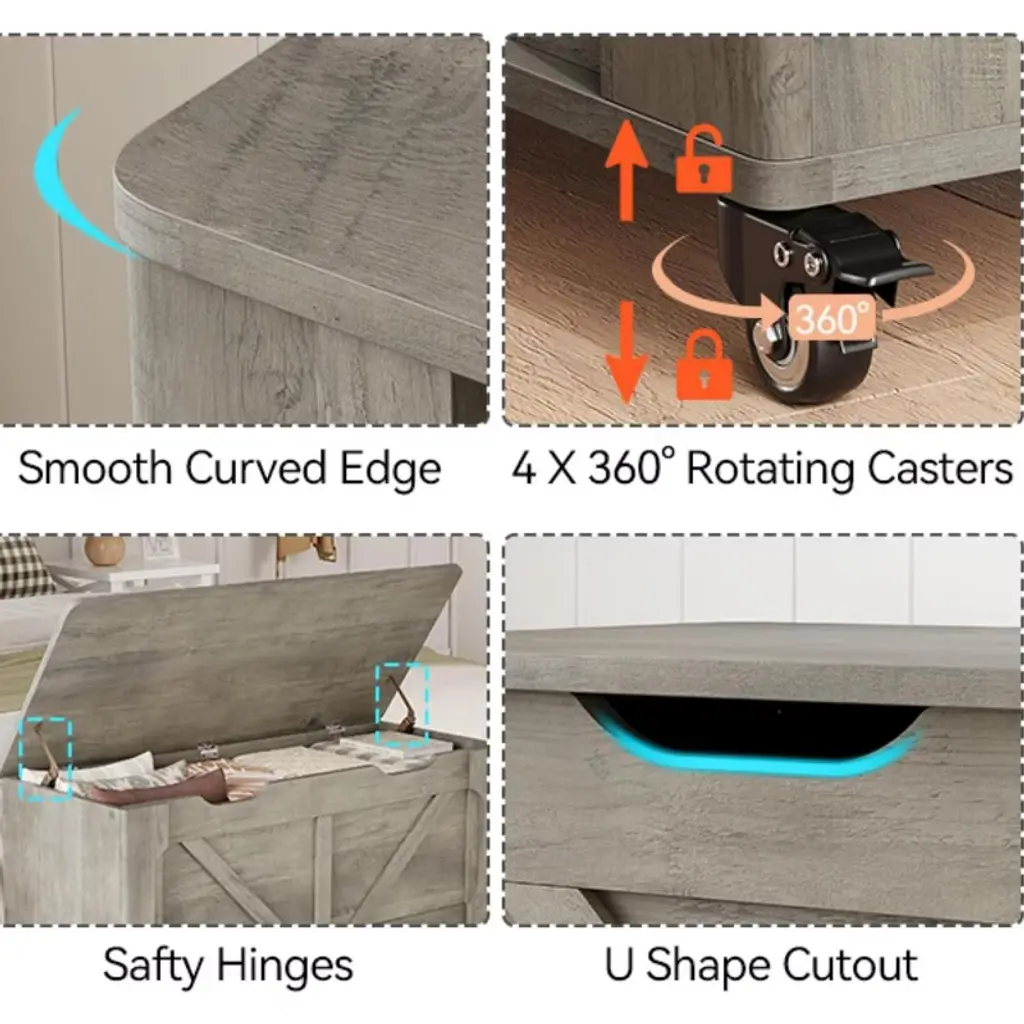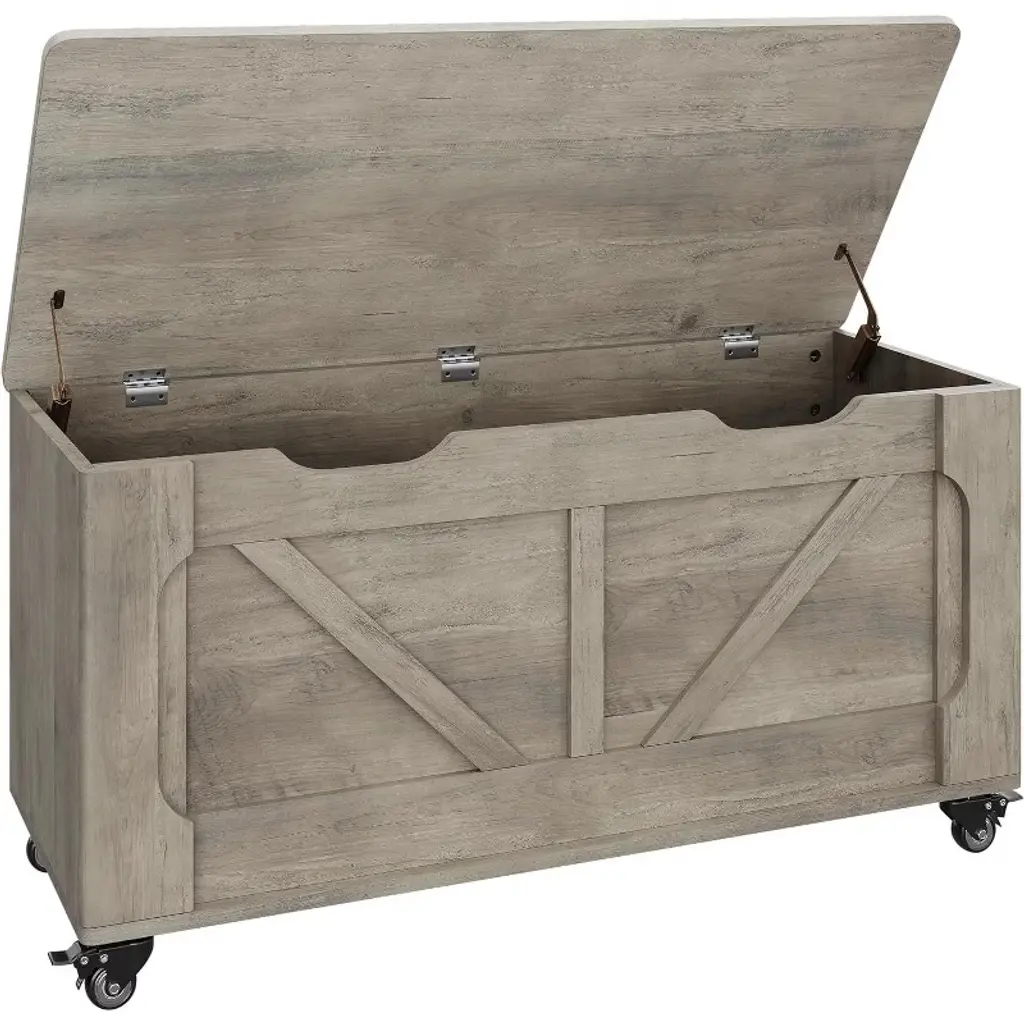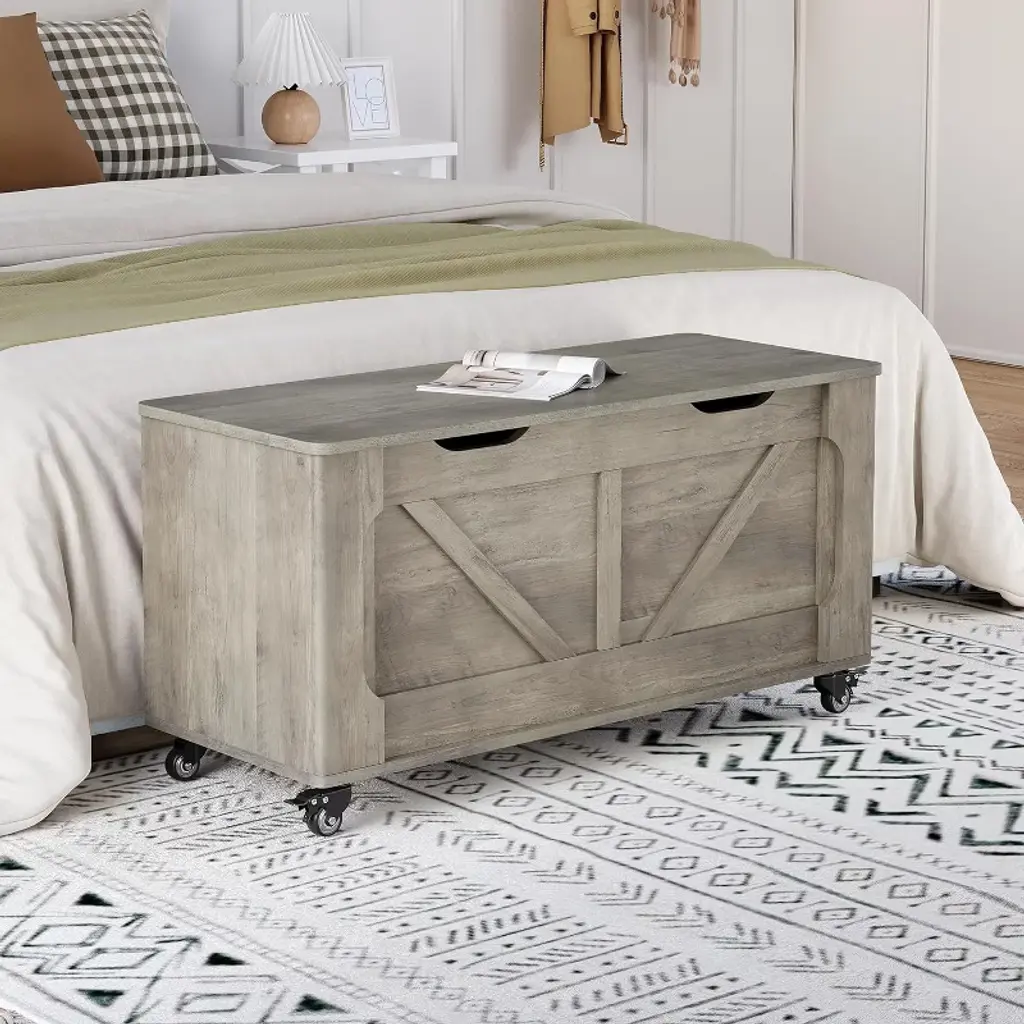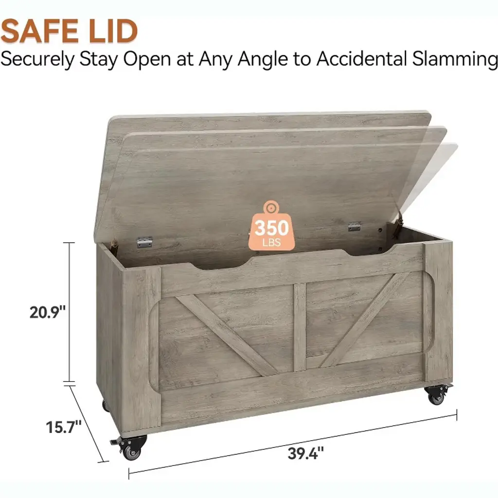 Acekool Storage Chest With Wheels, Wooden Trunk Bench 39.4" With Safety Hinges, 350 Lb Support, Rounded Corners, Entryway, Living Room, Gray