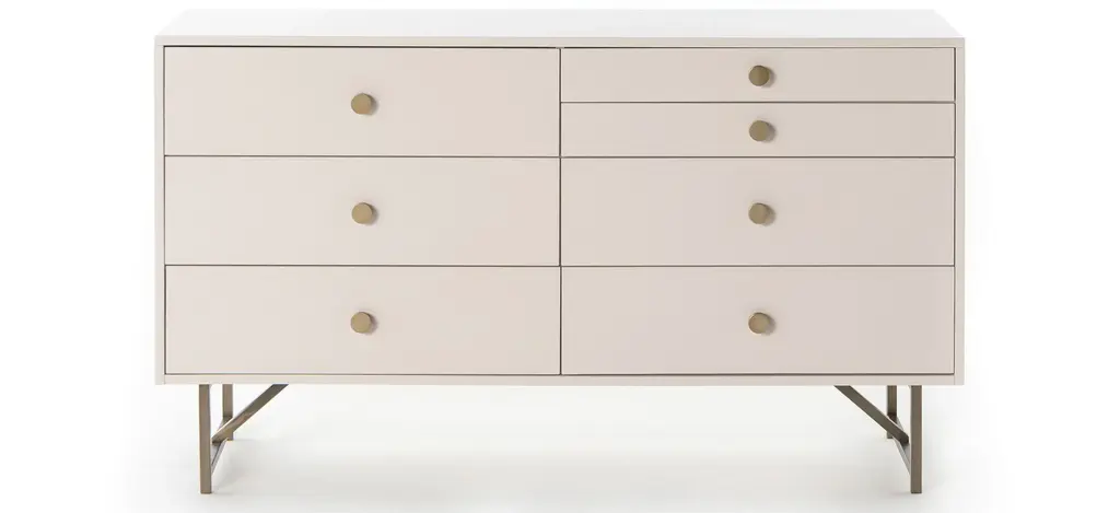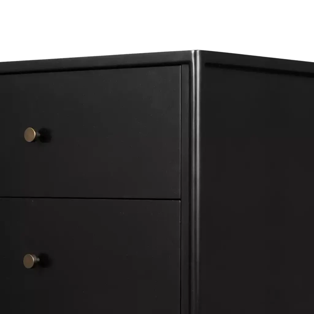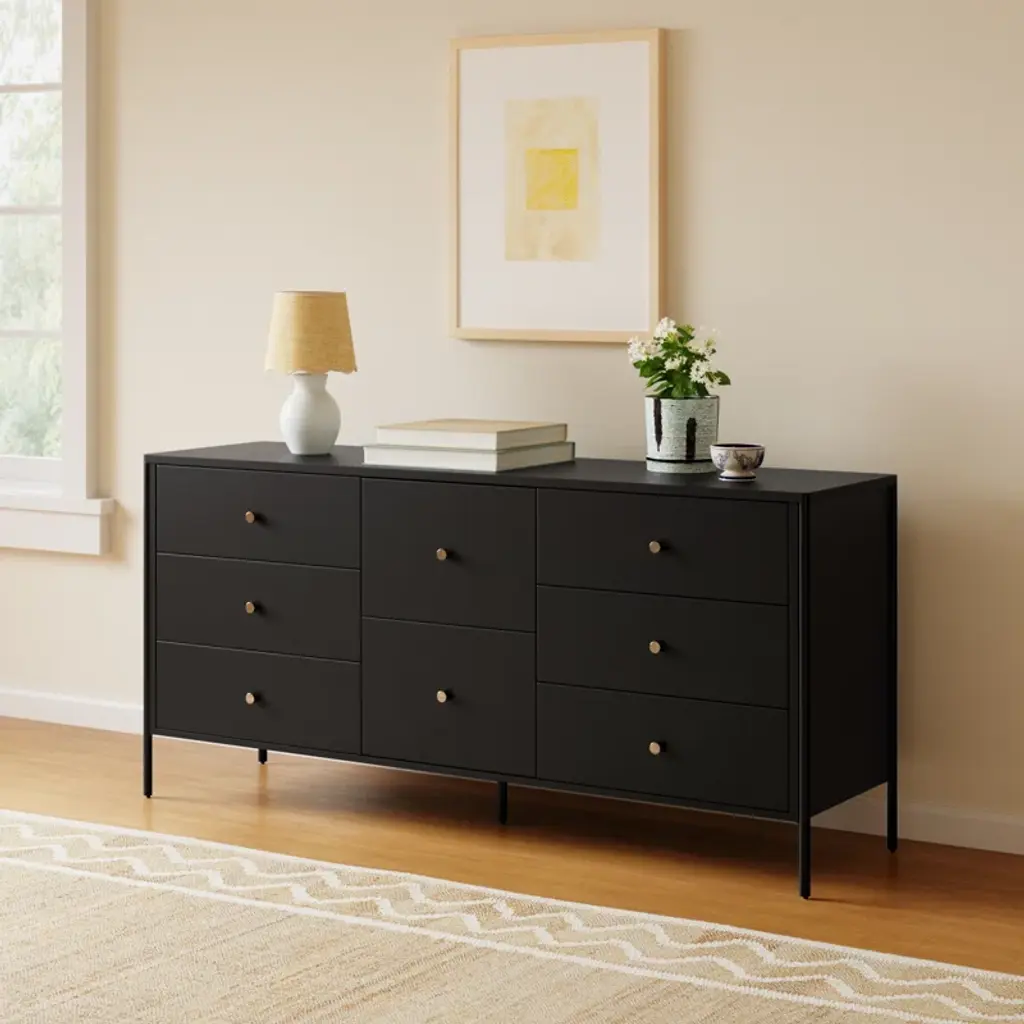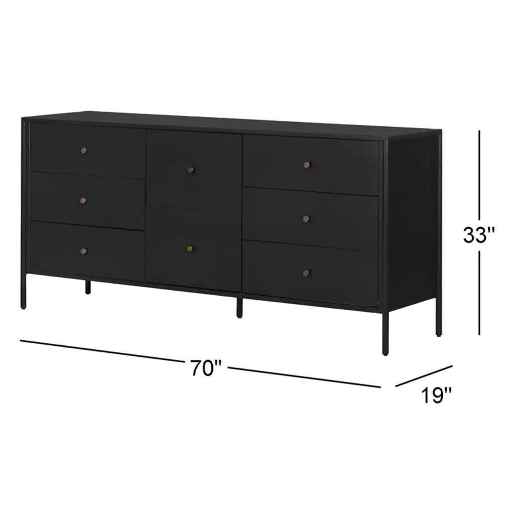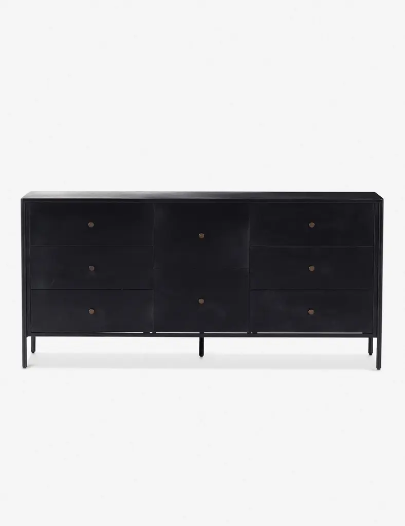 Bring a clean, beautifully industrial look to the bedroom with a spacious eight-drawer dresser made from black-finished iron, featuring bronzed iron hardware.