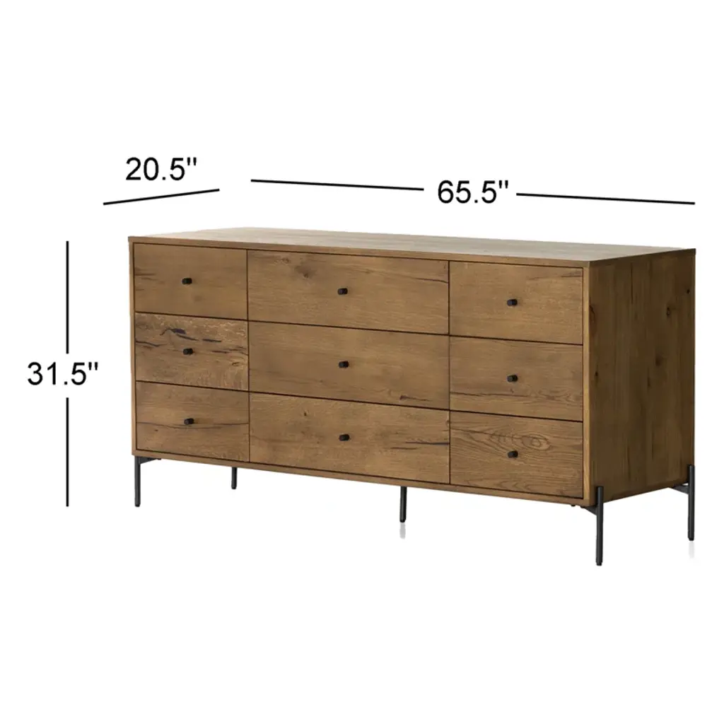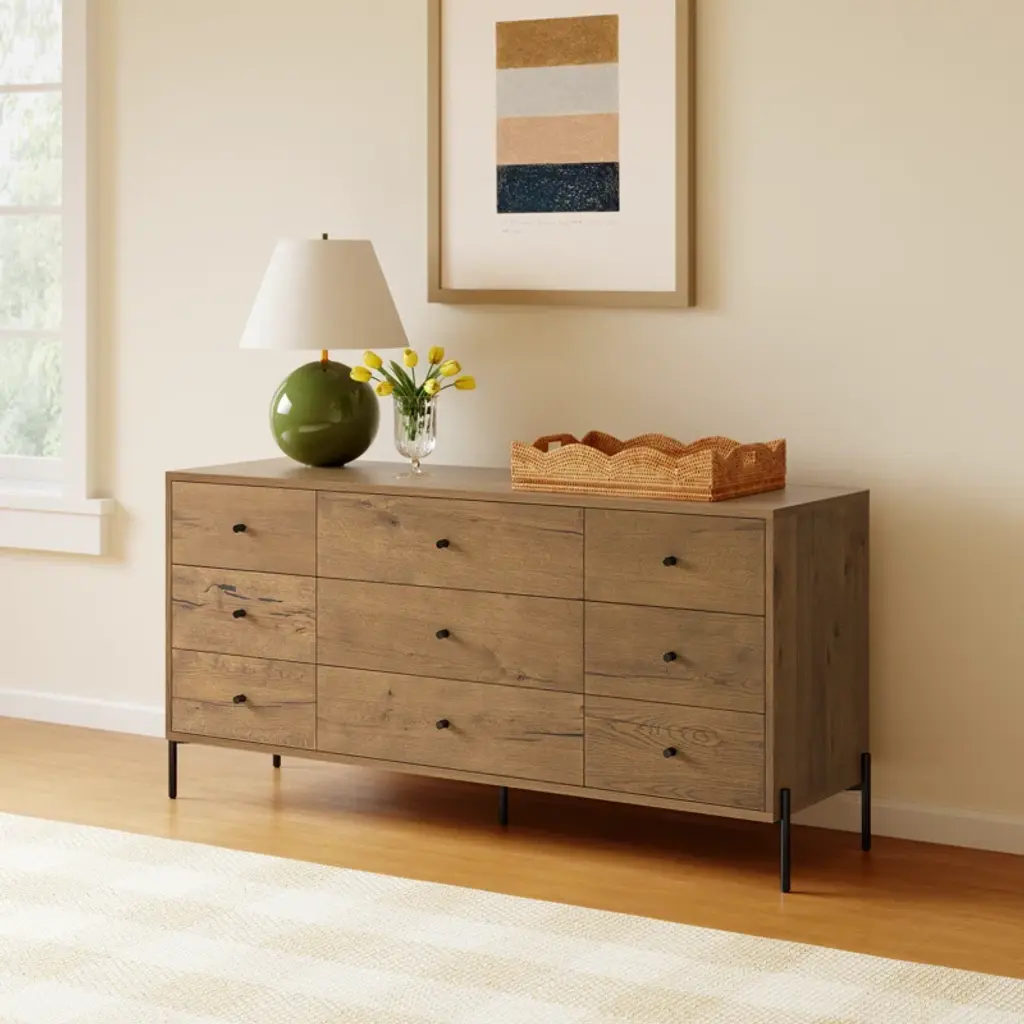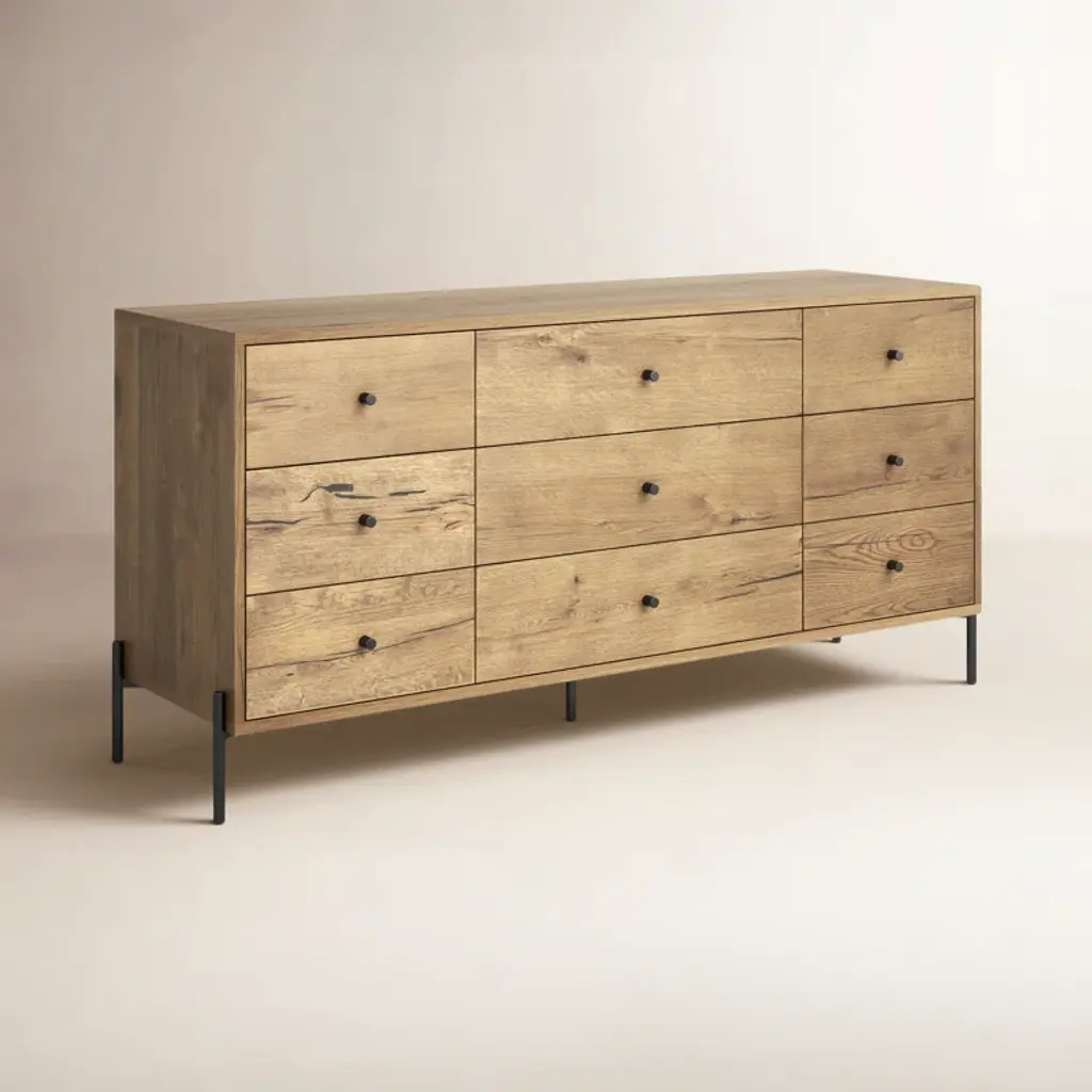 Wire brushing brings added texture to light, mixed woods, and rich oak veneers, with architectural details and iron hardware fusing for a uniquely modern take on simply styled, organic-leaning looks for the bedroom, office, and living space.