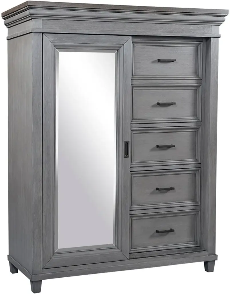 Solve your extra storage needs with the Acorn Hill door chest. There's a cedar-lined bottom drawer, a hanging rod behind the panel door, three open shelves and a drawer for frequently worn items. This beautiful chest bridges the gap between traditional and modern design, with a sophisticated craftsman influence and a warm brown finish. This quality piece is reinforced with corner blocks as well as heavy-duty metal fasteners, screws and glue for added strength. The drawers feature English dovetail construction and full-extension ball-bearing glides. This door chest is constructed of kiln-dried oak solids and veneers with selected Asian hardwoods, and finished with pewter-colored hardware.