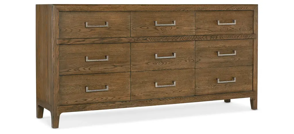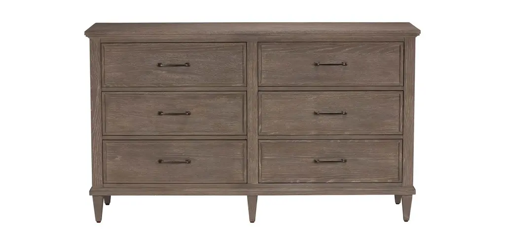The Acorn Hill dresser bridges the gap between traditional and modern design, with a sophisticated craftsman influence. Nice extras include cedar lining in the bottom drawers to keep your clothes fresh and safe from pests, a cord management cutout in one of the top drawers and a removable felt-lined jewelry tray. All drawers feature English dovetail construction and full-extension ball-bearing glides for smooth operation. Constructed of kiln-dried oak solids and veneers with selected Asian hardwoods, the frame joinery is reinforced with corner blocks as well as heavy-duty metal fasteners, screws and glue for added strength. Pewter-colored hardware adds the finishing touch.