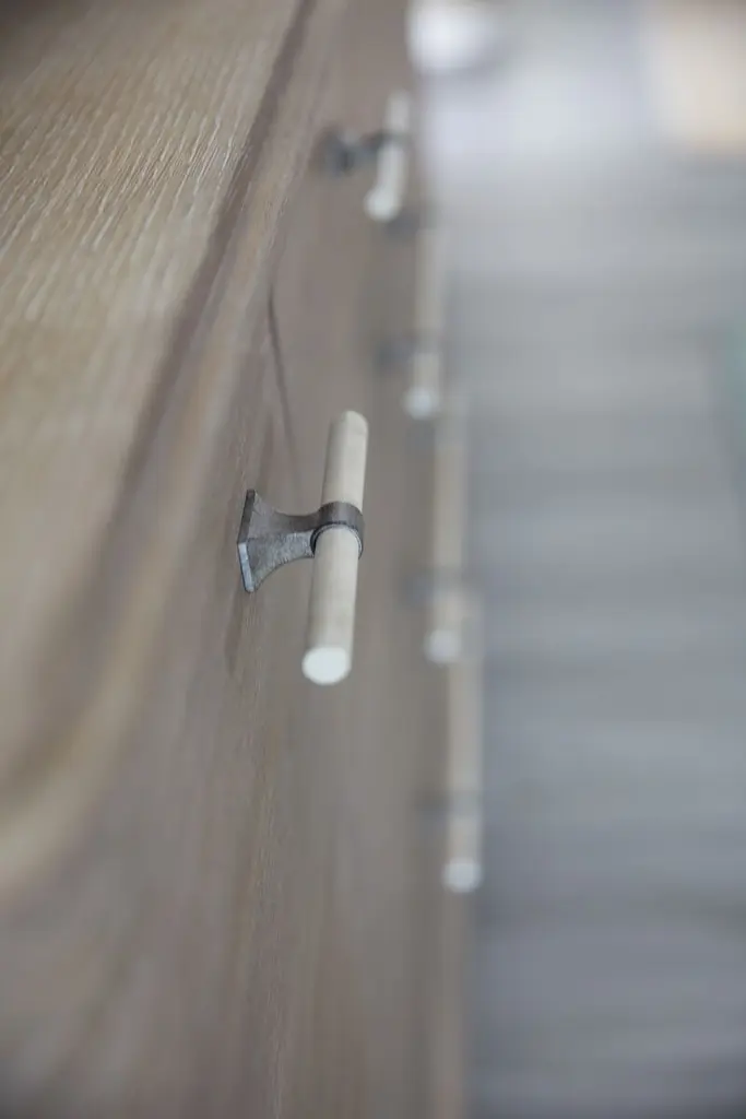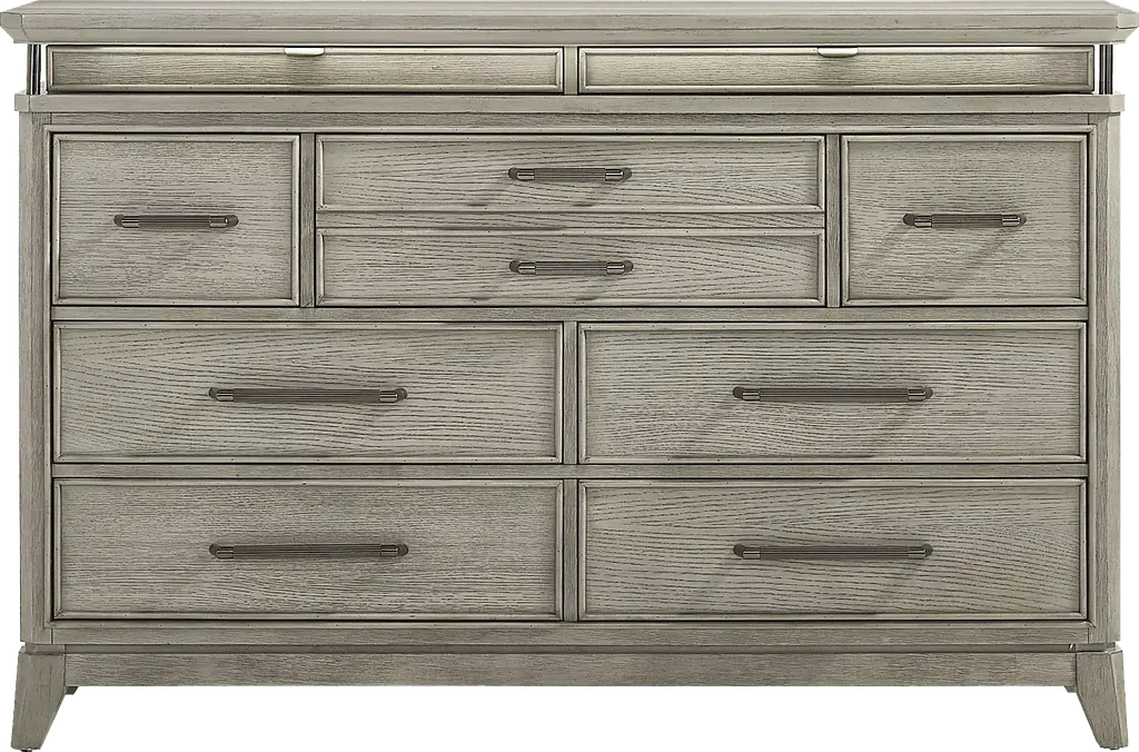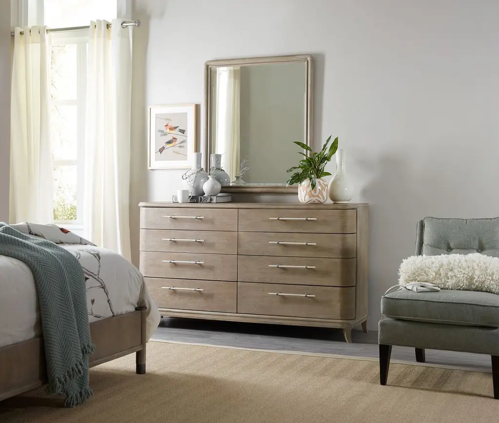 Serene and stylish with simple, clean lines, the Affinity Dresser combines a soft rounded silhouette to create an inviting transitional look. Bar pulls add intrigue. Offering 8 drawers, the top drawers have a drop-in felt liner and the right top drawer has a drop-in jewelry tray that sits on a wooden support at the top of the drawer to allow for extra storage underneath.