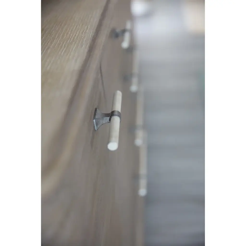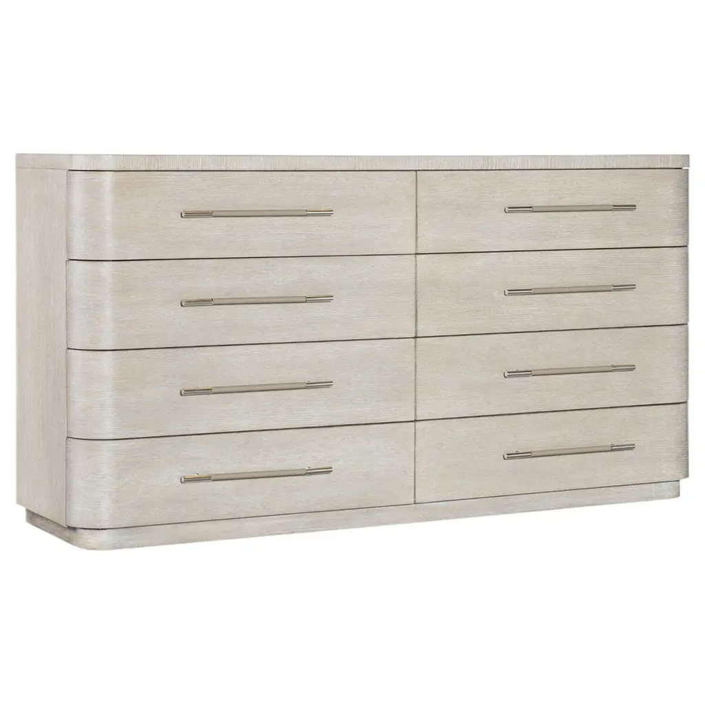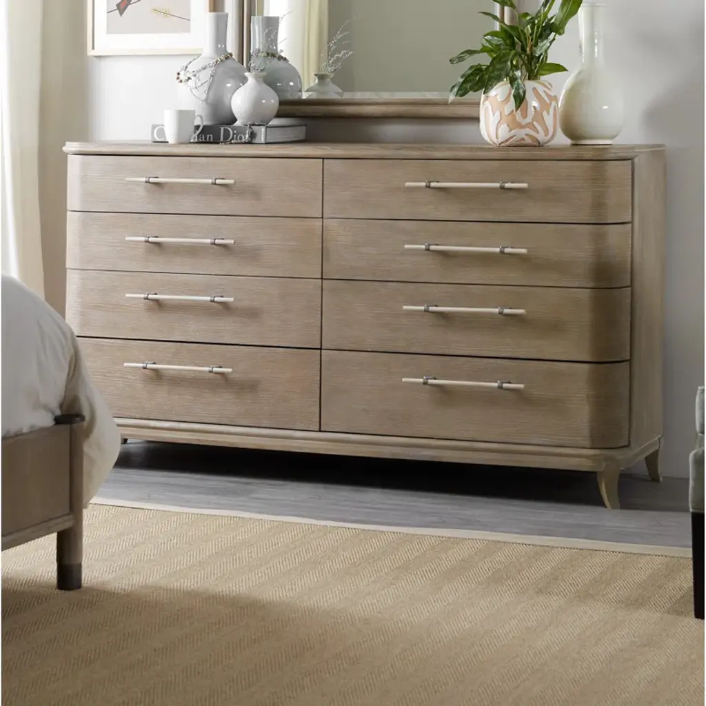 Serene and stylish with simple, clean lines, the Affinity dresser combines a softly rounded silhouette with a wire-brushed greige and antique white finish to create an inviting transitional look. Pewter and antique white bar pull add intrigue. Offering 8 drawers, the top drawers have a drop-in felt liner and the right top drawer has a drop-in jewelry tray that sits on wooden support at the top of the drawer to allow for extra storage underneath. The top drawers have a drop-in felt liner. Soft, rounded forms combine with sand-blasted greige and antique white finishes to create an inviting transitional boutique collection in Affinity. The main finish for the 20-piece collection of bedroom, dining room, occasional, accents and home entertainment is a wire-brushed greige (gray/beige) on quartered white oak. Pewter and antique white hardware and soft linen fabrics add intrigue.