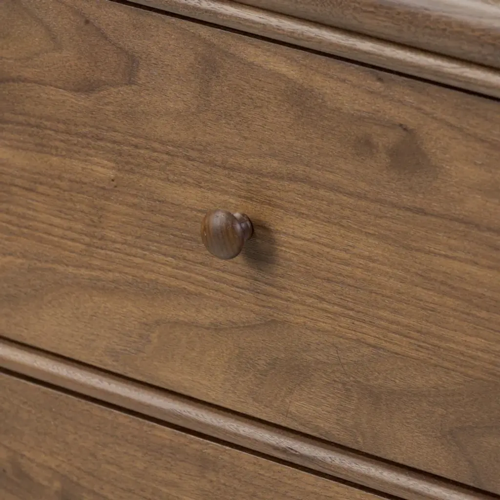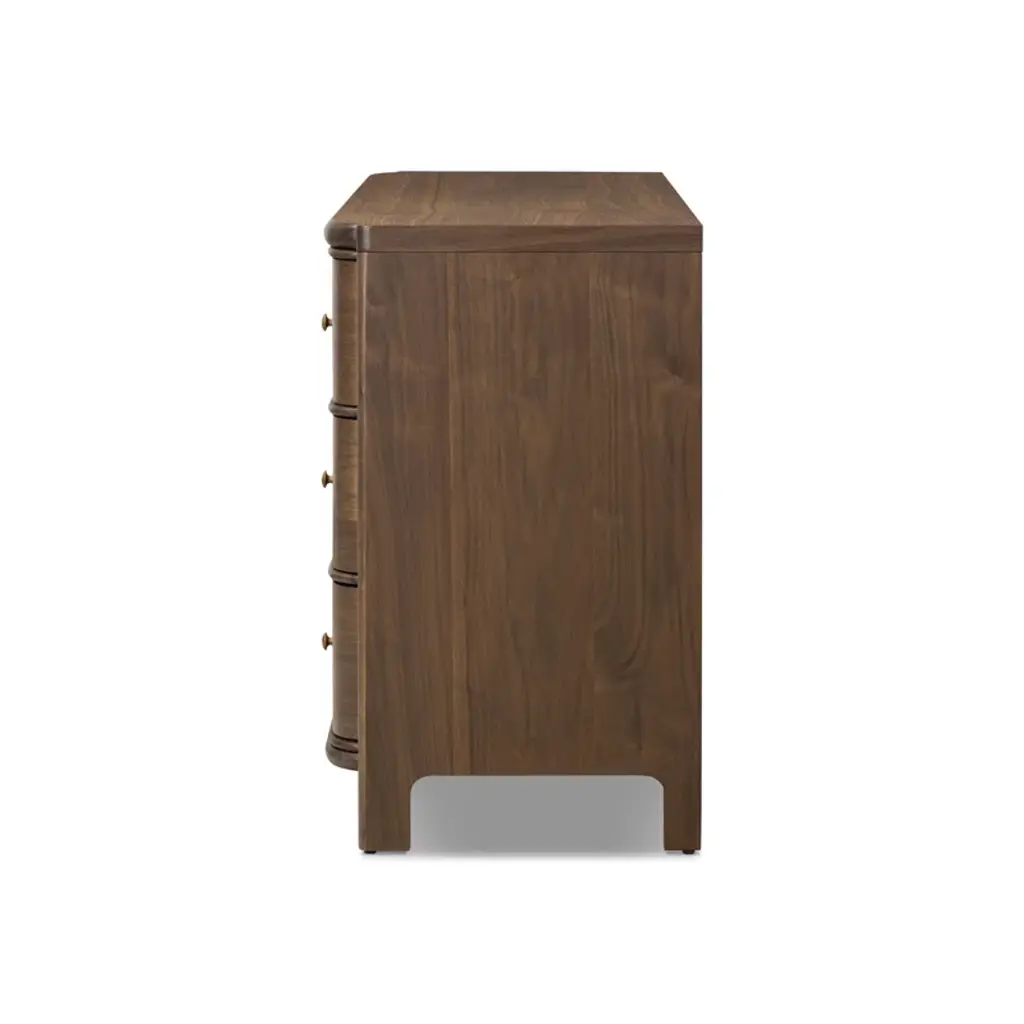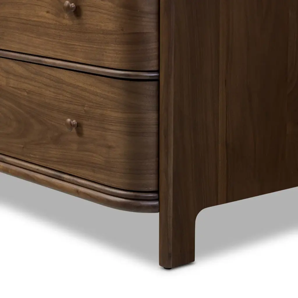 A design collaboration by Amber Lewis and Four Hands. Bring warmth, character, and extra storage to a room with this quiet stunner. Crafted from rich, dark brown walnut, this spacious dresser features curved front drawers for extra movement throughout. Finished with wooden knobs and paddle leg detailing.