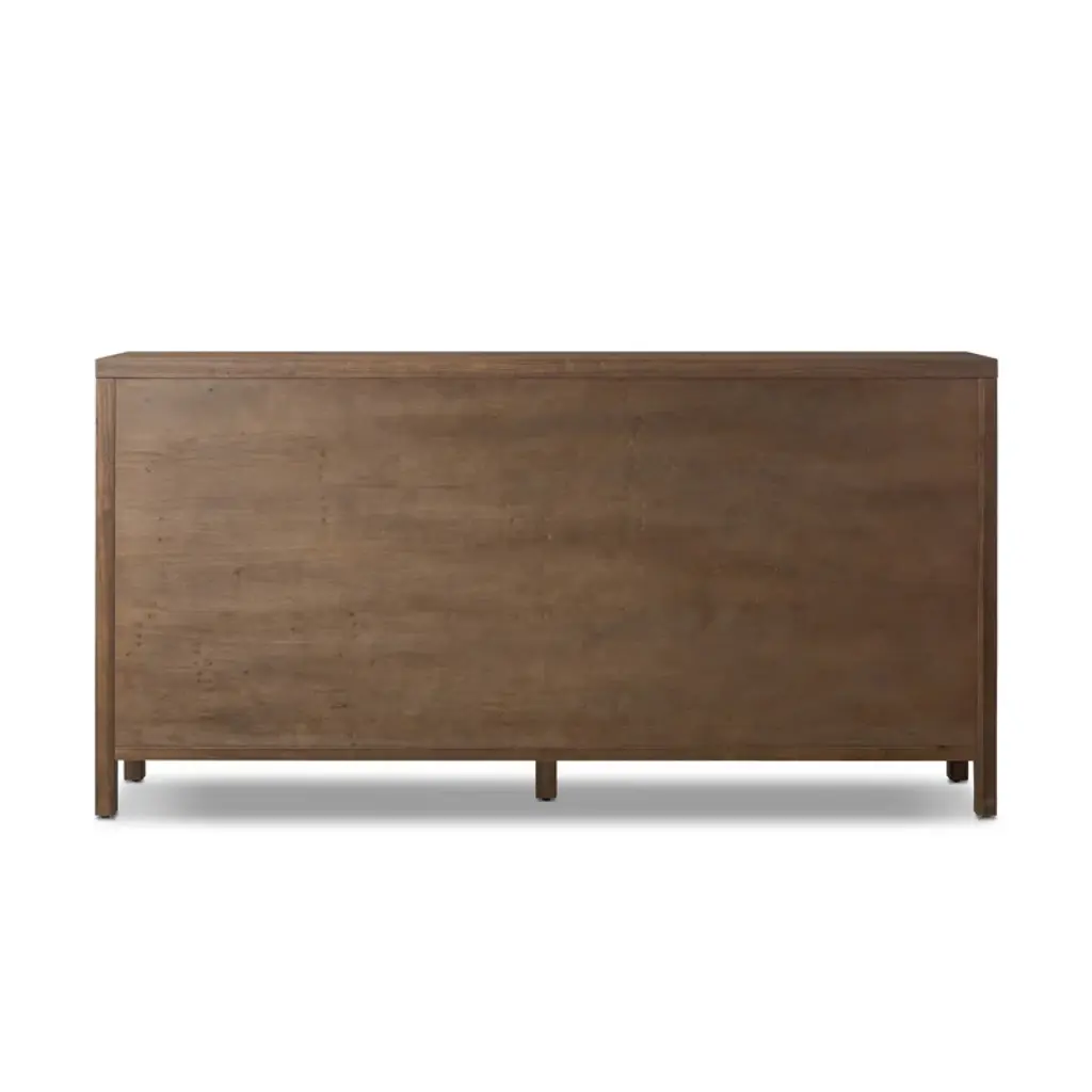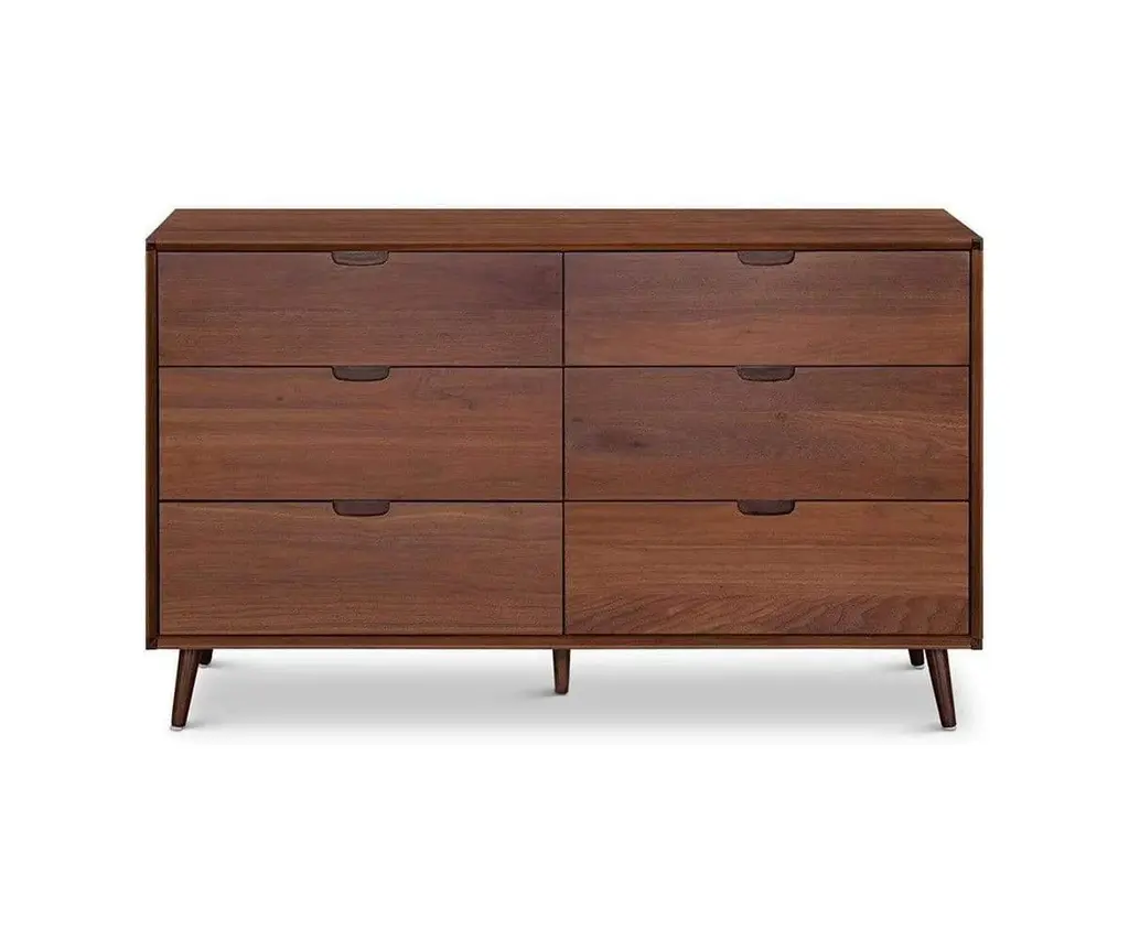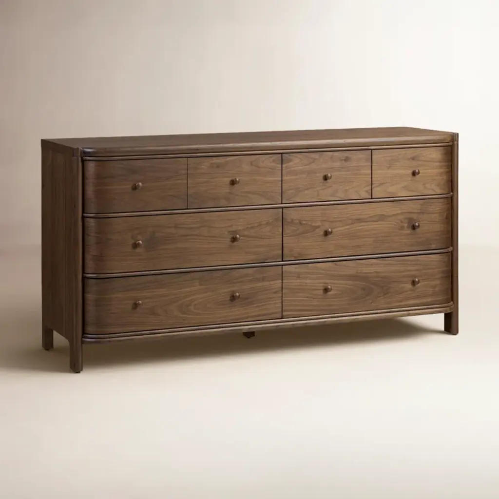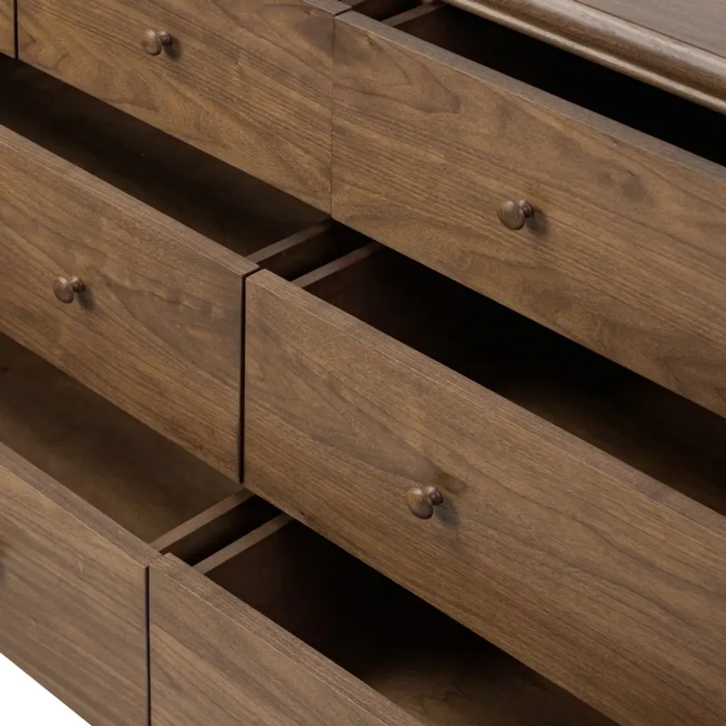A design collaboration by Amber Lewis and Four Hands. Bring warmth, character, and extra storage to a room with this quiet stunner. Crafted from rich, dark brown walnut, this spacious dresser features curved front drawers for extra movement throughout. Finished with wooden knobs and paddle leg detailing.