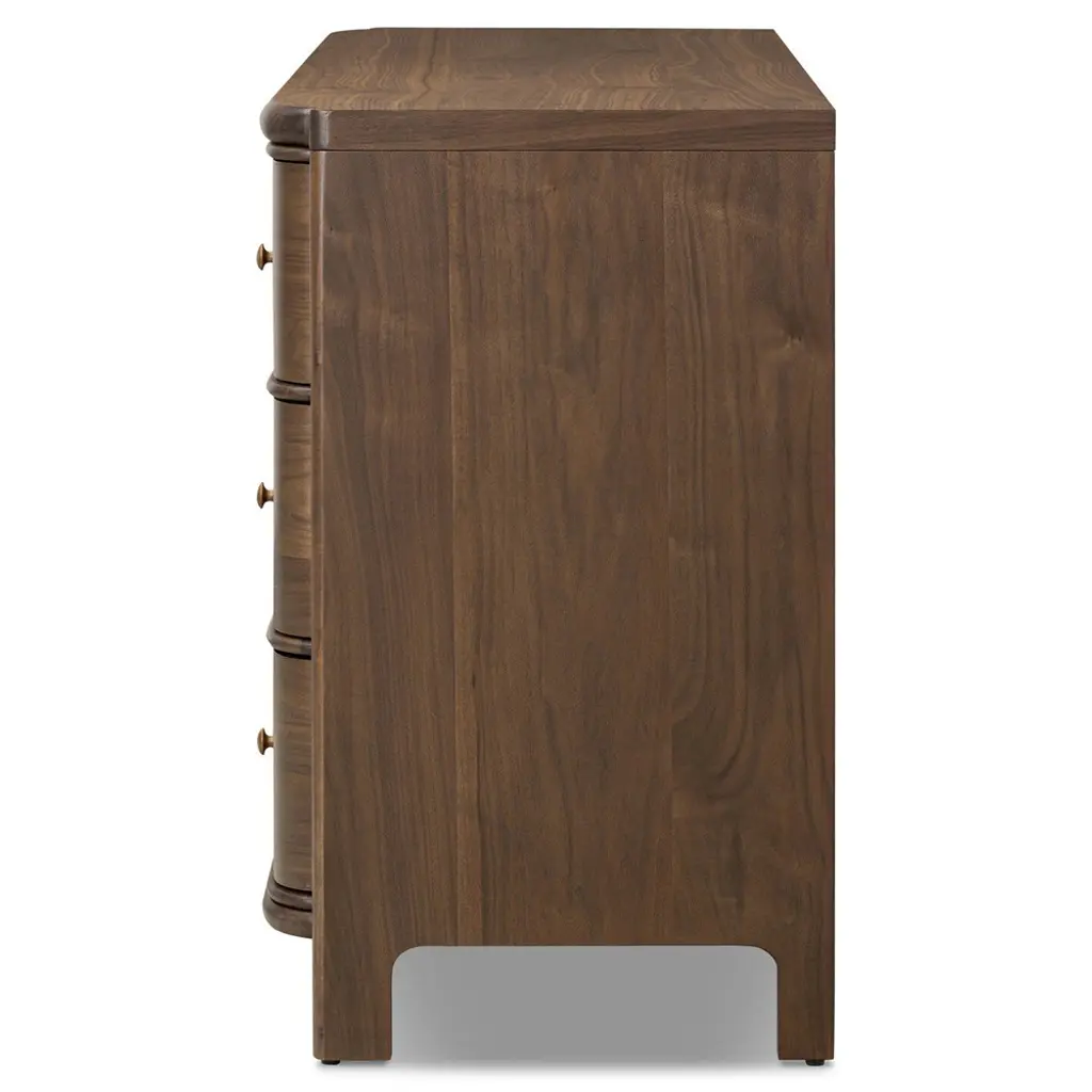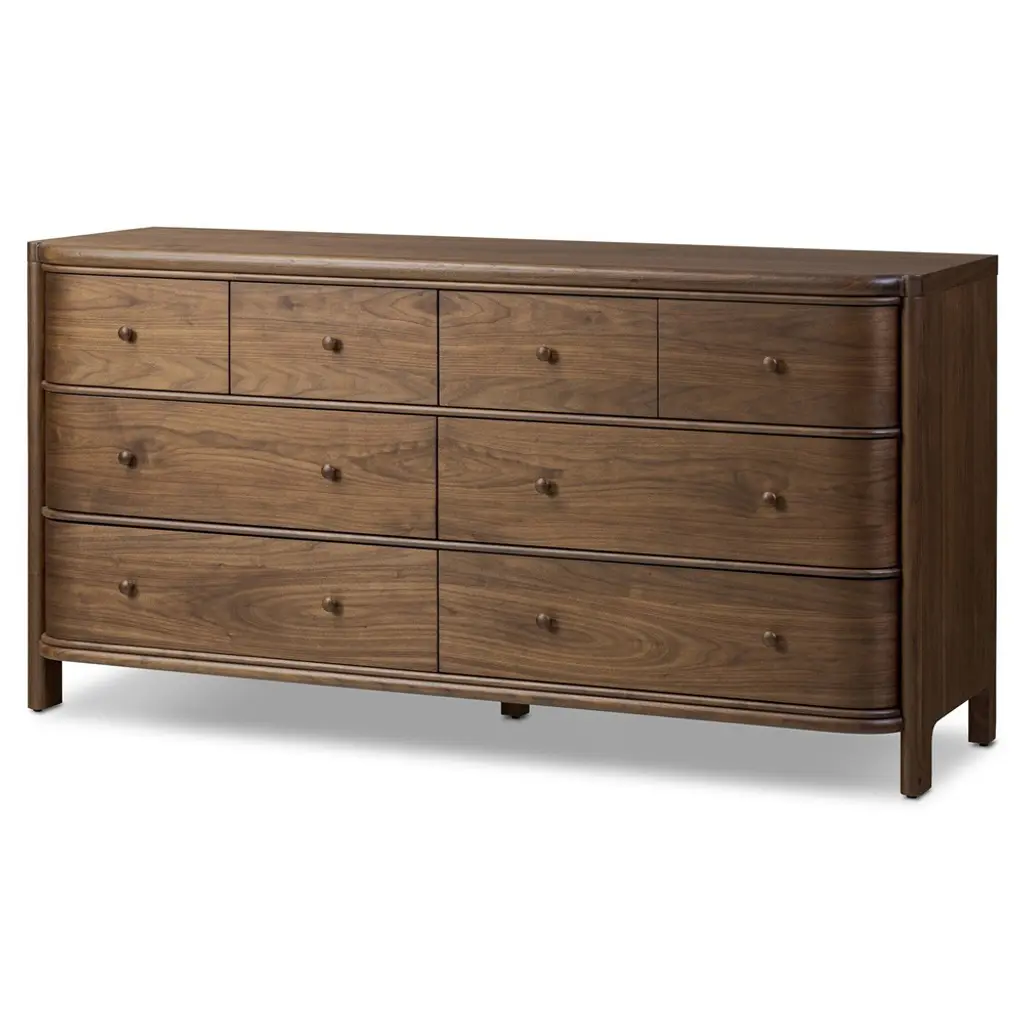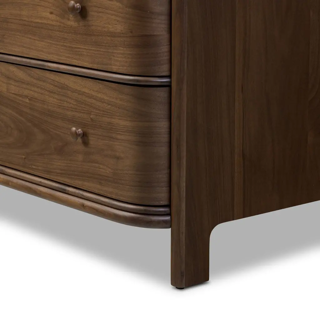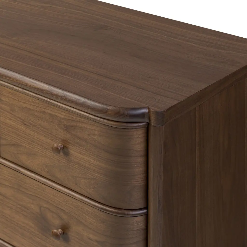 A design collaboration by Amber Lewis and Four Hands. Bring warmth, character and extra storage to a room with this quiet stunner. Crafted from rich, dark brown walnut, this spacious dresser features curved front drawers for extra movement throughout. Finished with wooden knobs and paddle leg detailing.