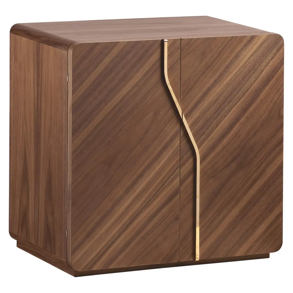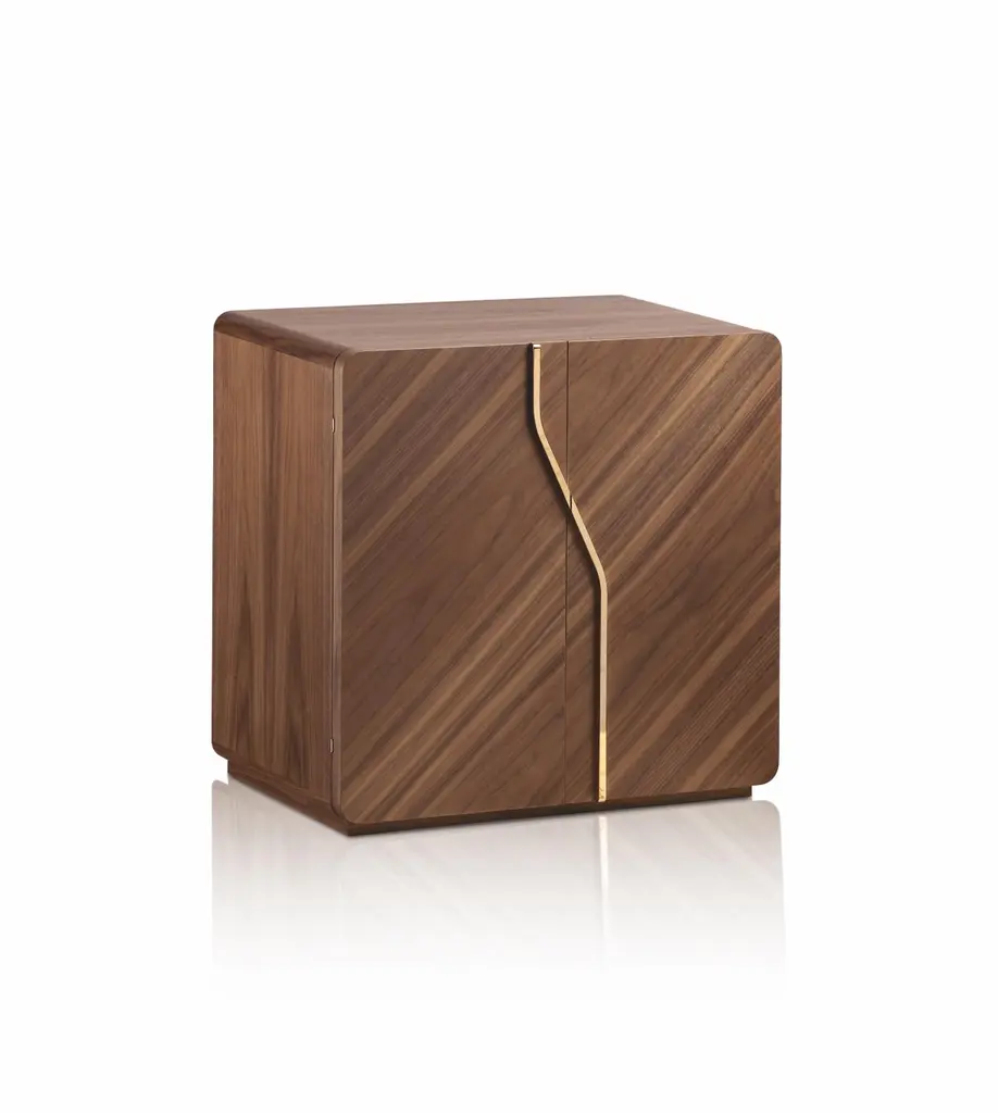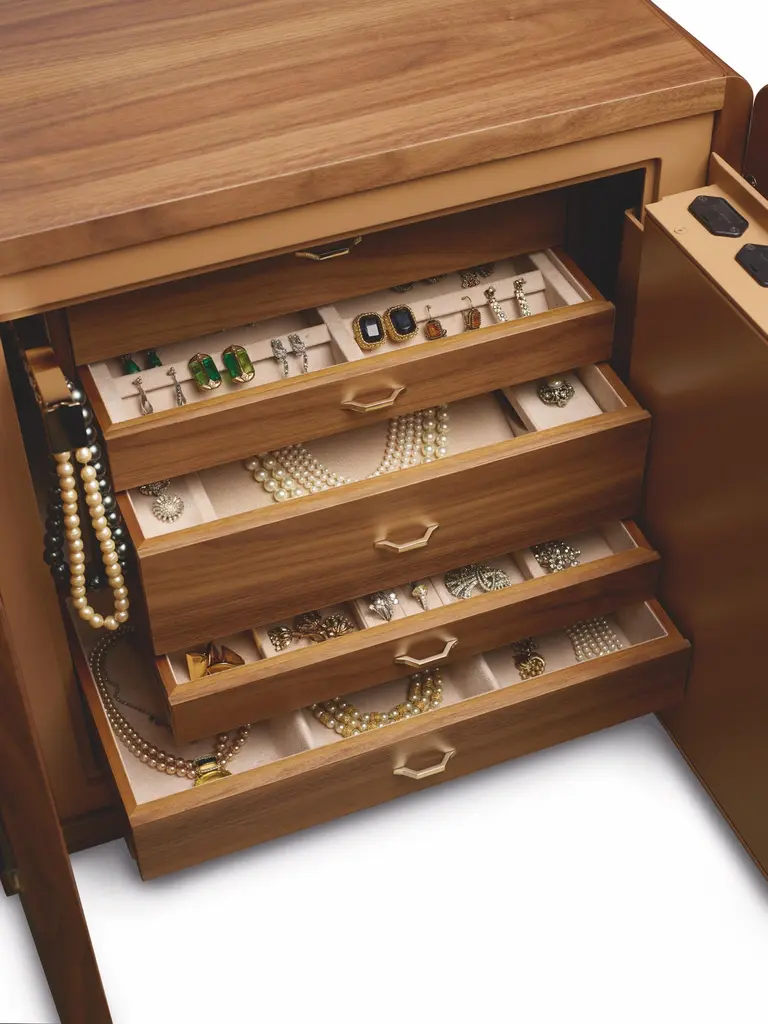 Polished white bird’s eye maple or polished walnut matte finish armored chest, 24-karat gold plated accessories. Round handle with biometric opening device and emergency key integrated. Inside pull out necklace holder and drawers lined for jewelry.