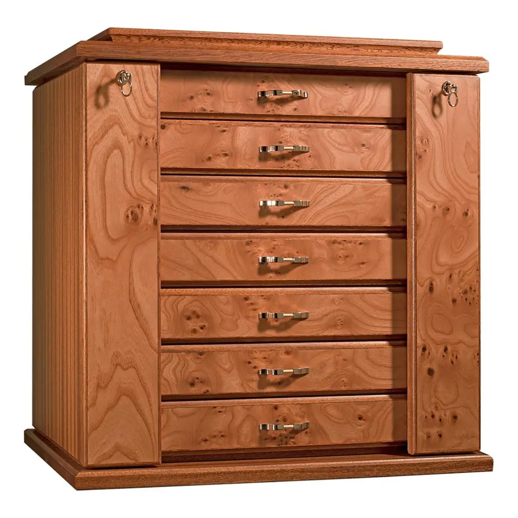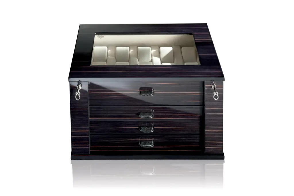 Lockable chest for 28 watches on holders and laying down. Available in briar or polished ebony.