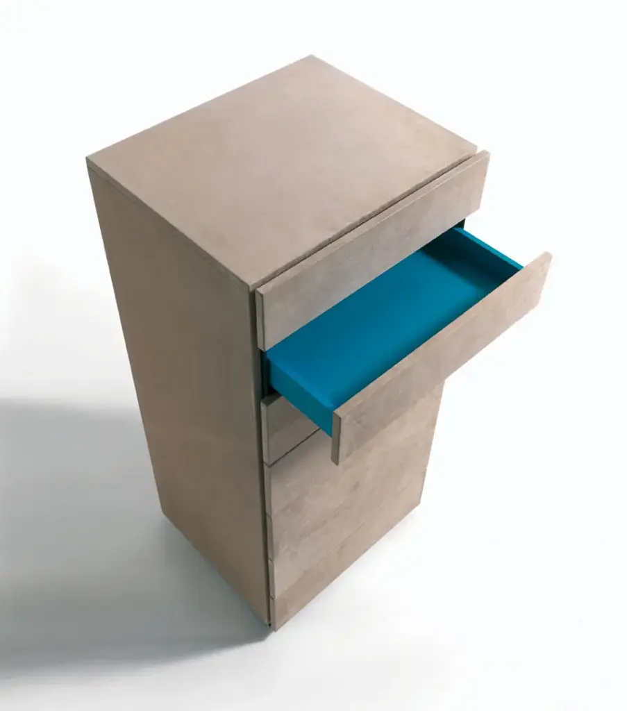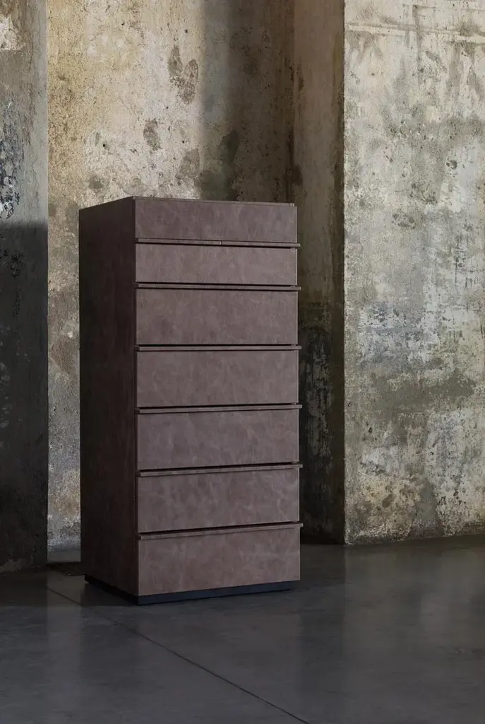Chest of drawers AKI 7 drawers, mat lacquered wood structure and nubuck leather covering.Size:L 131.5 H 60 W 52 cmAki is a family of containers with drawers. The linearity of the design is characterized by an handle which enhances the horizontal lines of the volumes.FINISHINGSStructure: mat lacquered in our selected colours.Top: mat lacquered in our selected colours, covered with regenerated hard leather available in 4 colours (white, black, dark brown, ivory) or in glossy lacquered glass in our selected colours.
