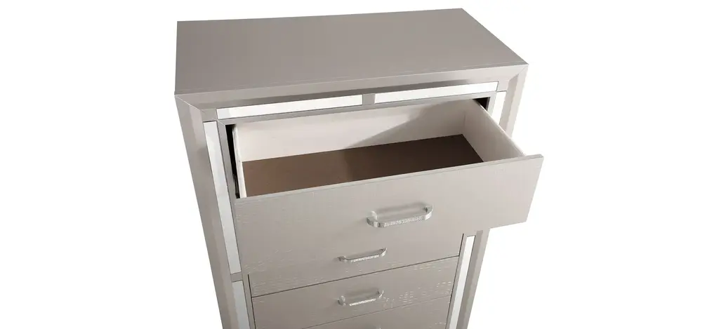 Mirror accents and croc finish are featured on this Alana chest. Large scale design and deep drawers add to this piece.