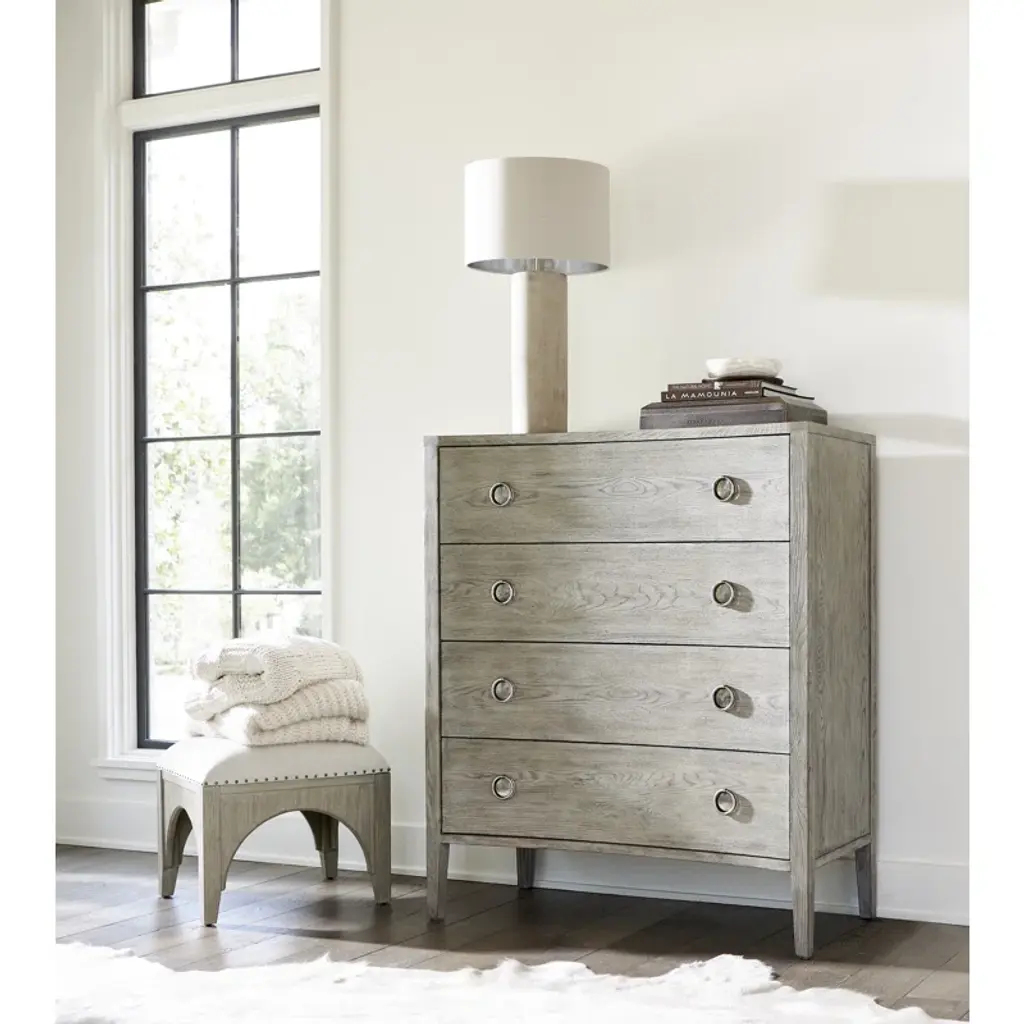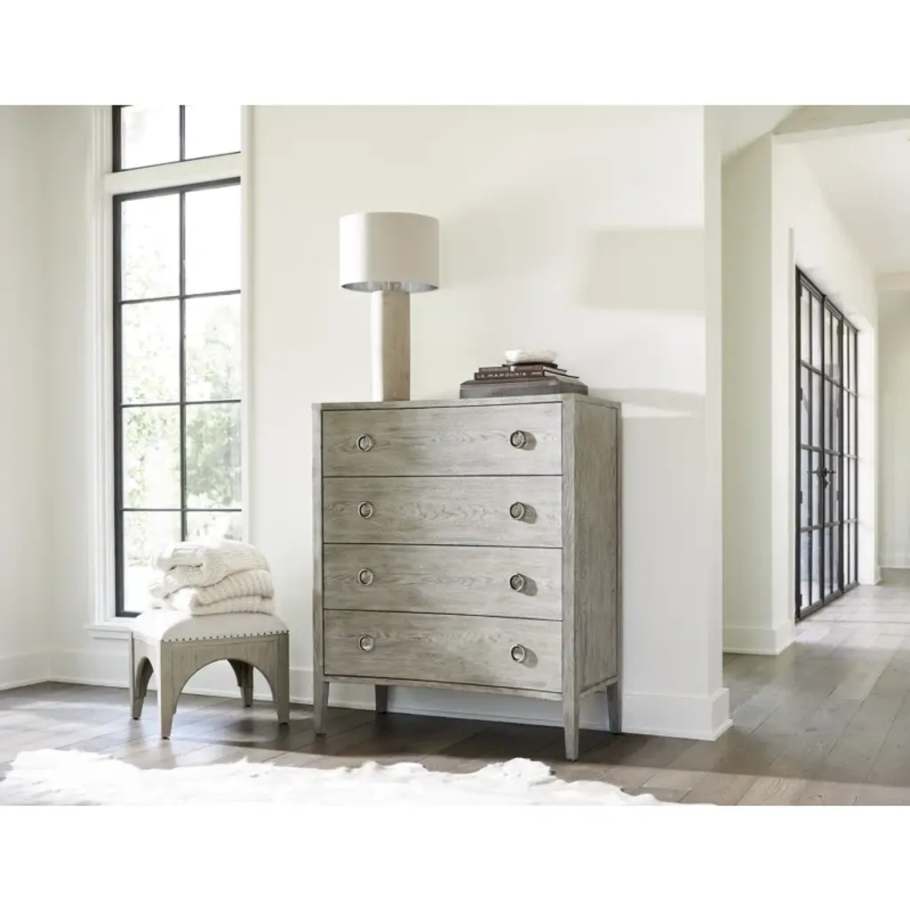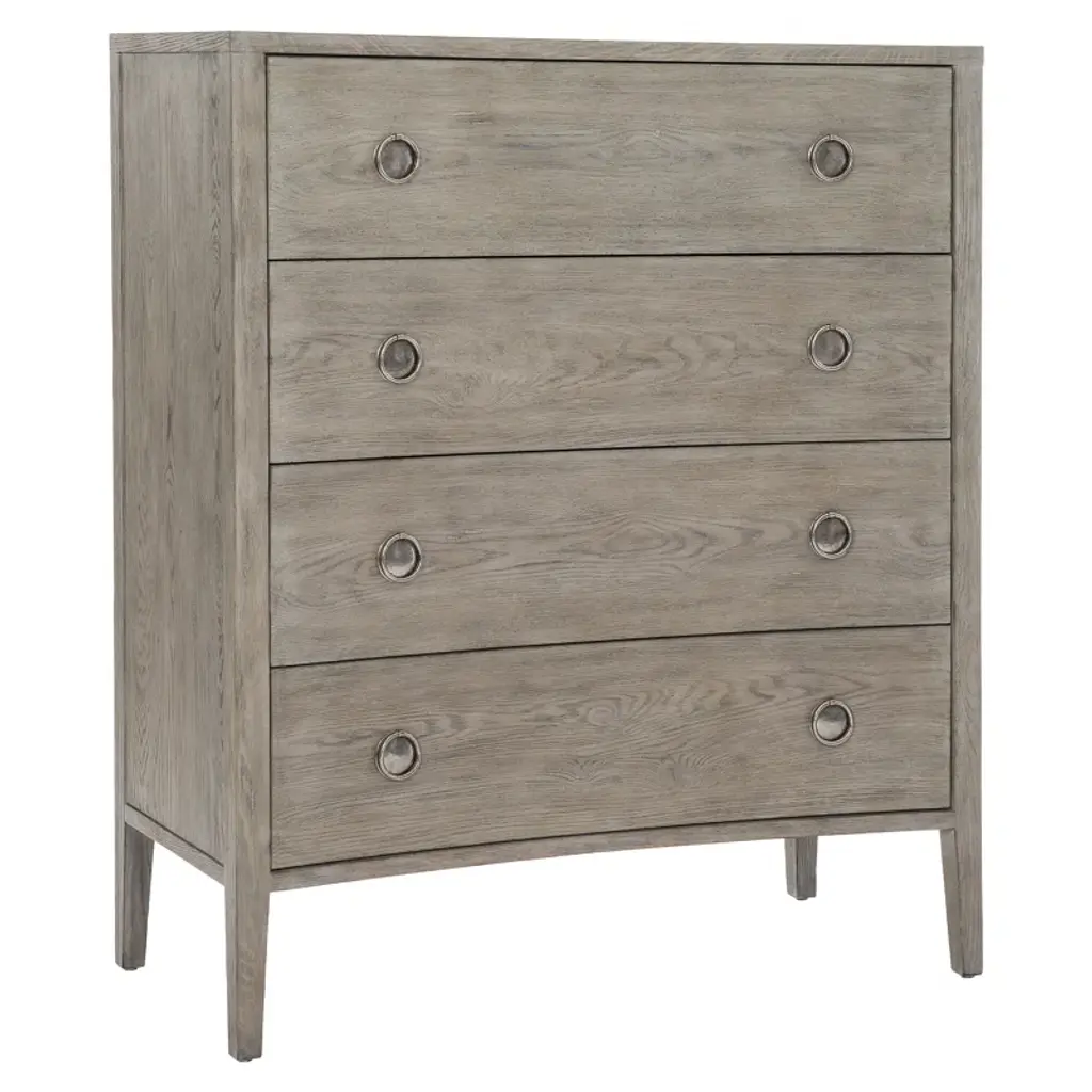 Standing just over four feet, the Albion tall drawer chest offers the look of a bygone era. Straight lines give way to a concave curve along the front, where four soft-closing drawers offer sleek storage. Casual sophistication is showcased in brushed white oak with a subtle rustic finish, tapered legs, and simple, elegant hardware.