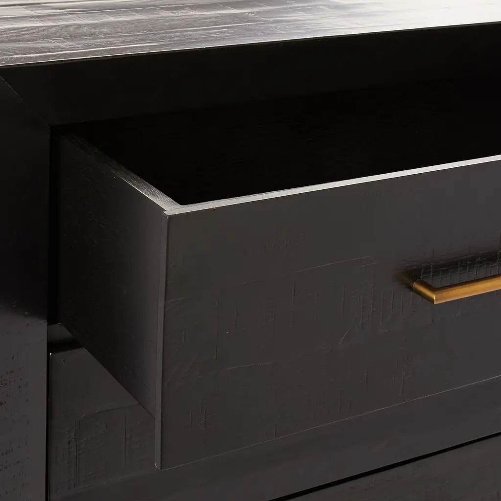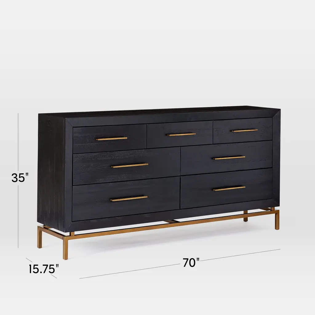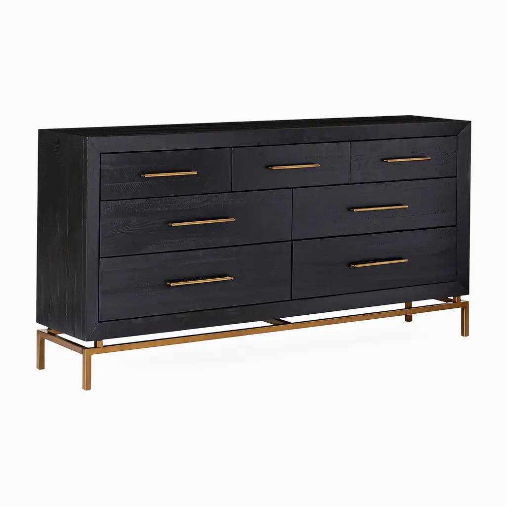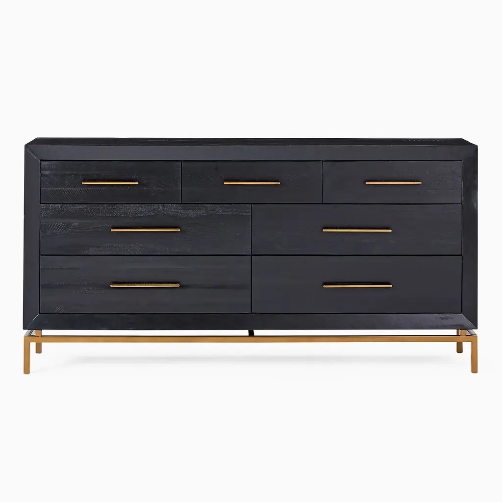 Its rustic yet modern look. The dark finish highlights the rich woodgrain. Seven drawers provide ample storage for your clothes and bedroom essentials. Brass-finished pulls add contrast.