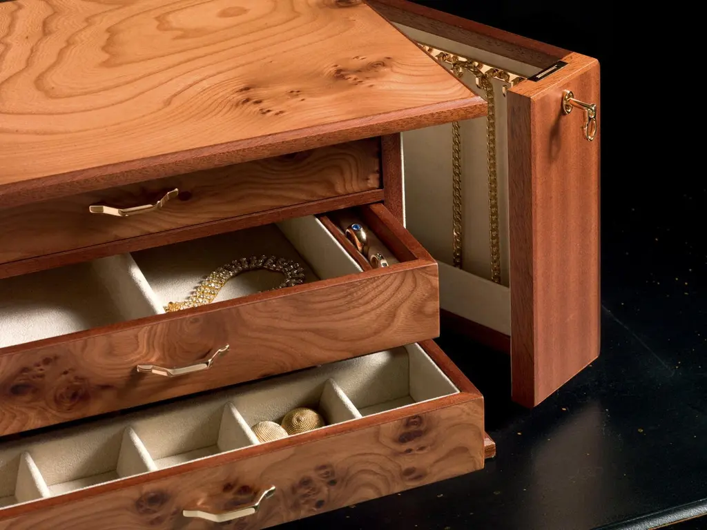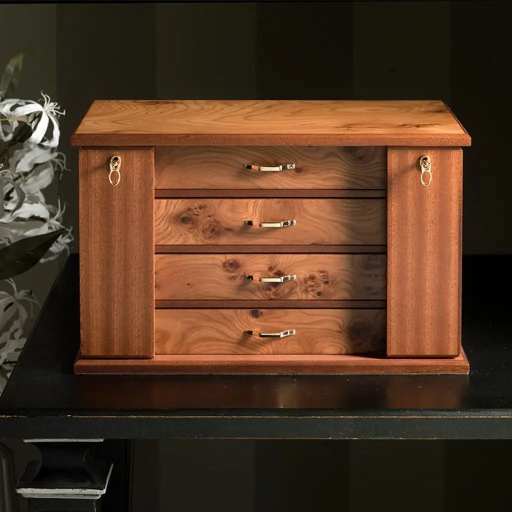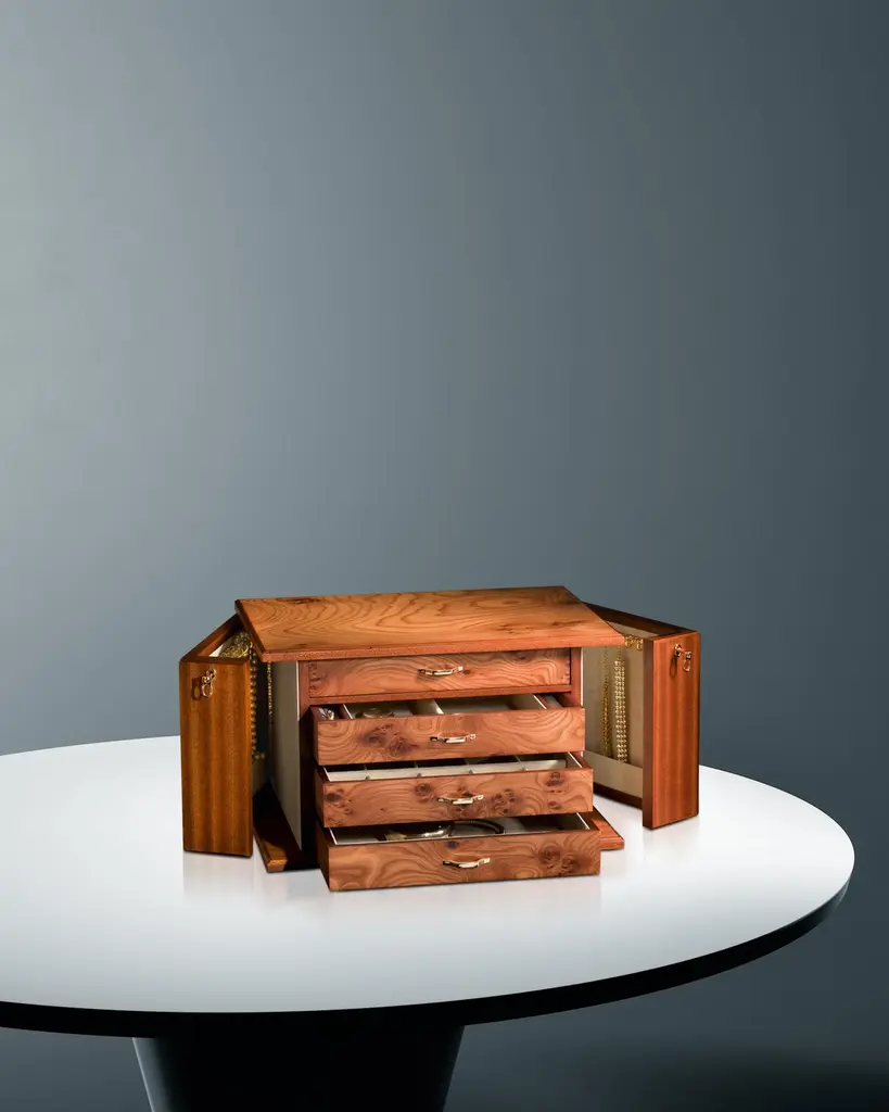 Jewelry chest in briar and mahogany, matte finish, ultra suede lining. 24-karat gold-plated brass accessories. With 4 drawers. Two lockable doors with necklace bars.