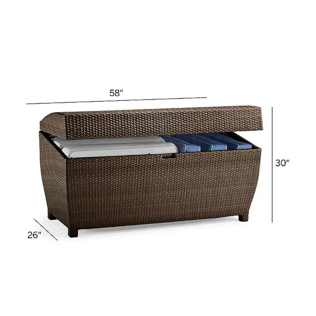 Our All-weather Wicker Storage Chest is both durable and functional. Use it to store outdoor furniture cushions, garden necessities, and more in high style. Oversized trunk features a curved top that allows moisture to run off Inner liner helps keep cushions or beach equipment dry and mildew-freeConstructed of all-weather, UV-resistant wicker in bronzeHandwoven over an aluminum framePneumatic hinges allow for smooth operationView storage capacityA Frontgate exclusive To prevent injuries or damage to item, recommended team lift (two or more people) for furniture placement Note: Not recommended for use with items that have been exposed to chlorine or other chemicals. At Frontgate, our primary focus is quality. We guarantee that every product we sell will stand up to the supreme test – our customers' satisfaction. To learn more about our policies, visit our Shipping & Processing, Returns & Exchanges and Warranty & Price Guarantee pages.