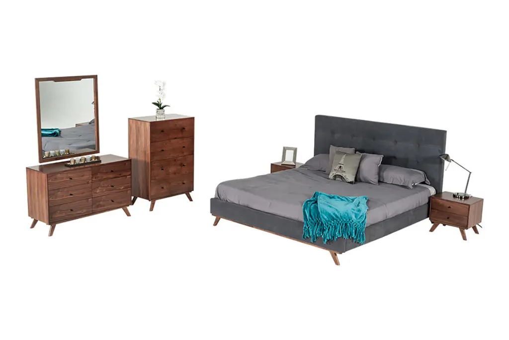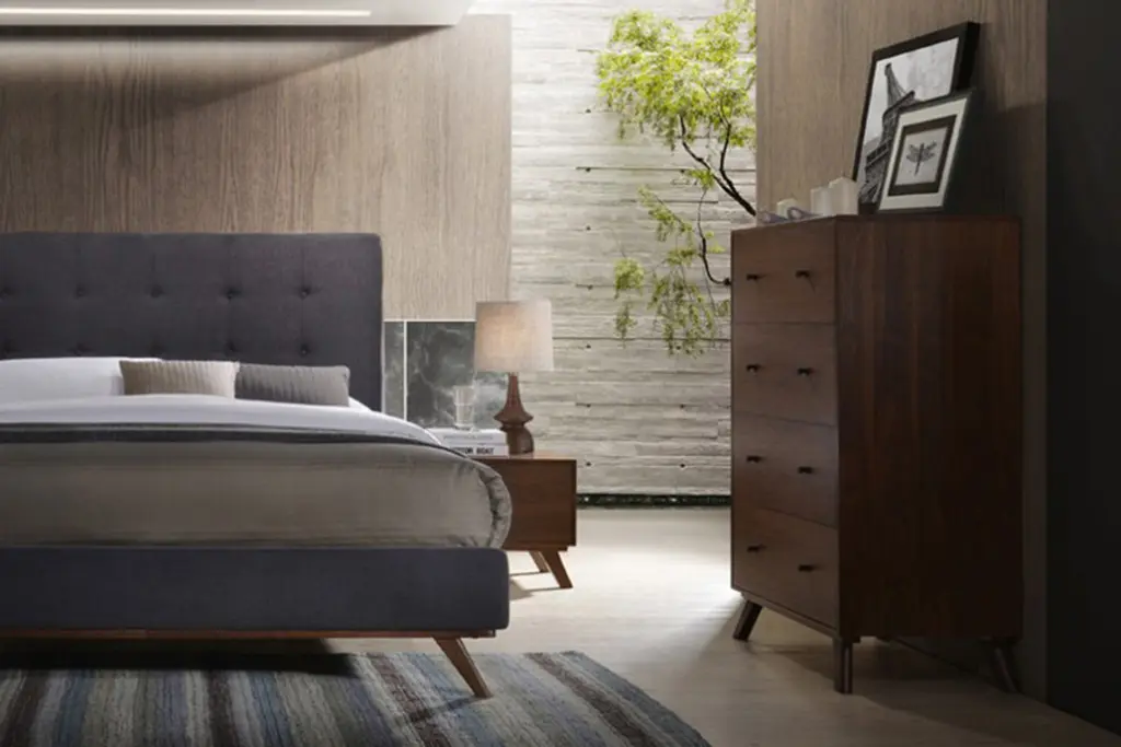 This chest provides a simple but elegant look to your bedroom. This beautiful 4 drawer chest features walnut wood veneer finish and walnut stained Rubberwood legs to give it a rustic appearance. Pair it with other members of the Allyson bedroom collection (sold separately) to create a designer look.