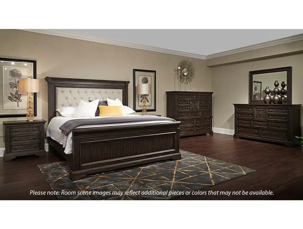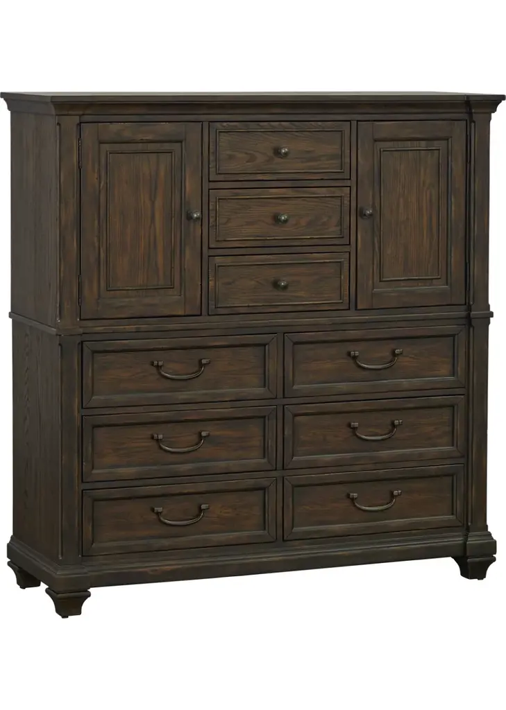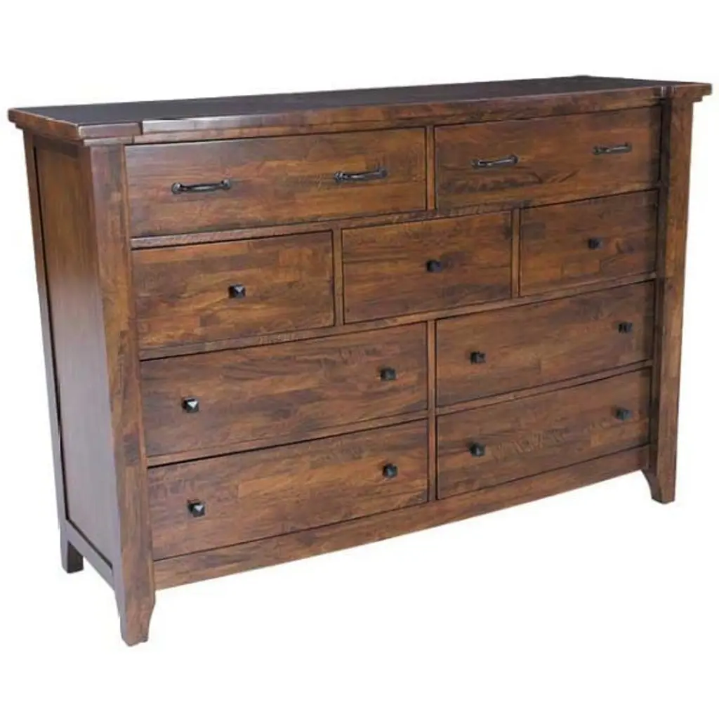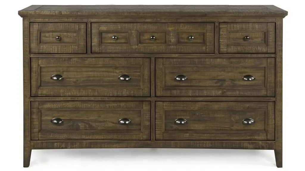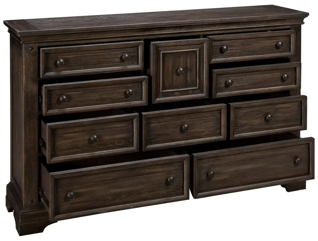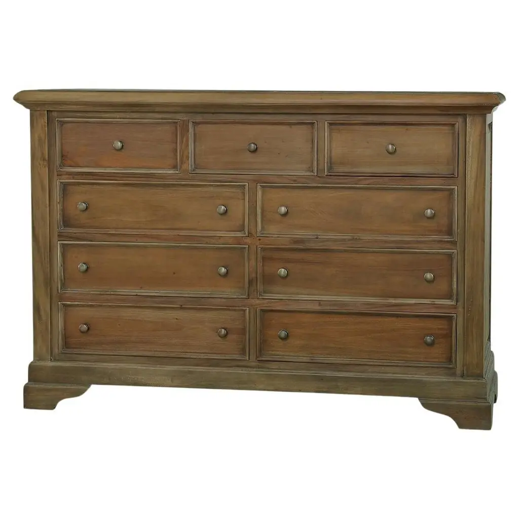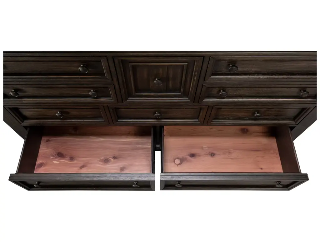 The Altavista 10 Drawer Dresser will complete your bedroom with its rich weathered brown finish. Elegant carvings and moldings add a regal touch along with bracket feet. This contemporary-style dresser features ten paneled drawers, including two cedar-lined bottom drawers, all with pewter-finish knobs.