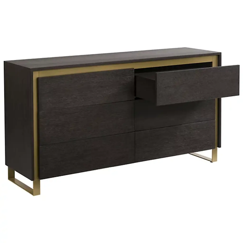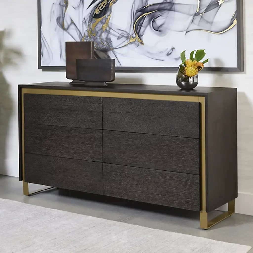 The Alvaro Dresser from Sunpan enhances the elegance of your bedroom with a refined, classic style. Crafted from solid grey oak wood and wood veneer, it boasts a timeless design that effortlessly enhances any space. The dresser features six push-to-open drawers, offering seamless functionality without compromising style. The rustic bronze-finished steel legs provide a sturdy foundation while adding a touch of industrial charm. Perfectly paired with the Alvaro nightstand and bed, this dresser is a sophisticated addition to any bedroom ensemble.