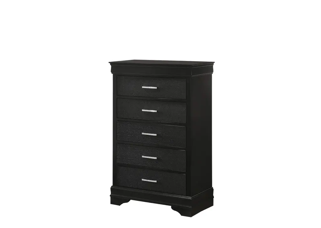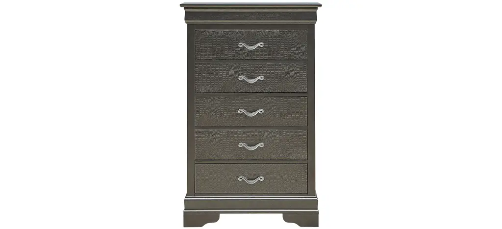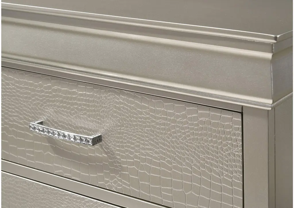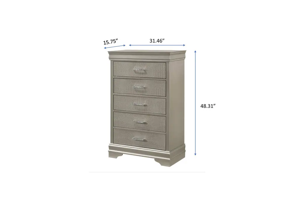 This bedroom set embodies a refined elegance with its soft silver hue and luxurious textures, perfect for creating a serene and sophisticated sanctuary. The centerpiece is a sumptuous bed framed by a headboard with diamond-tufted detailing, offering a touch of opulence. The accompanying pieces, including a dresser with a gracefully matching mirror, tall chest, and nightstand, all feature a textured finish that adds depth and character to the suite. Weight 105.600 lbs. (47.52kgs.)
