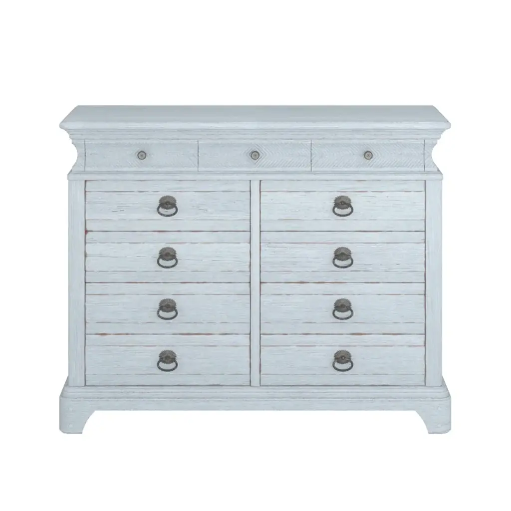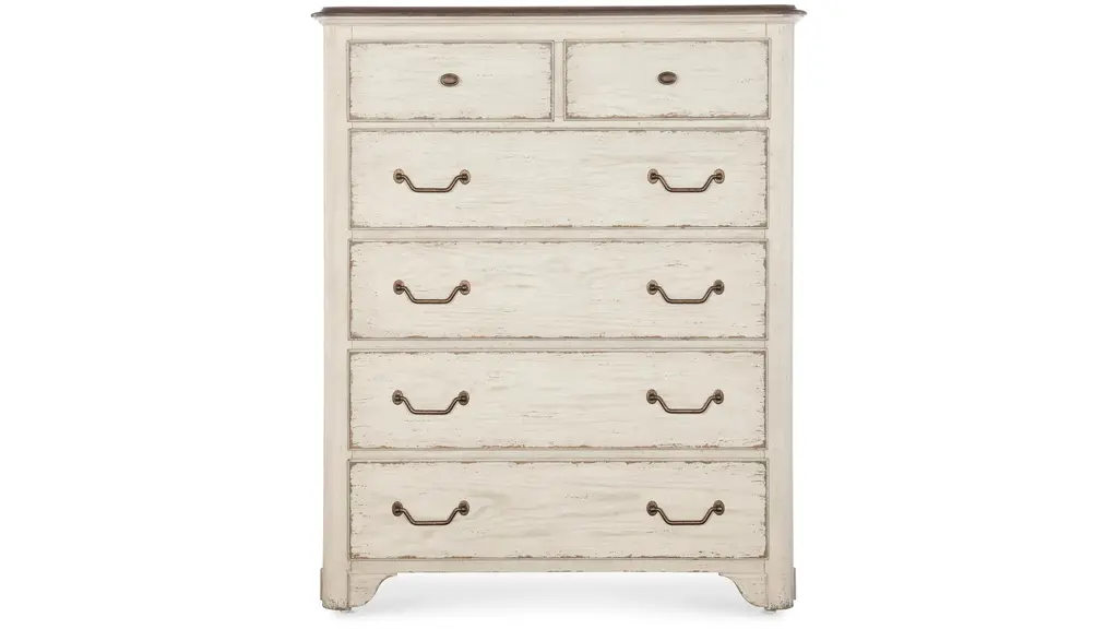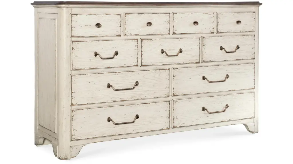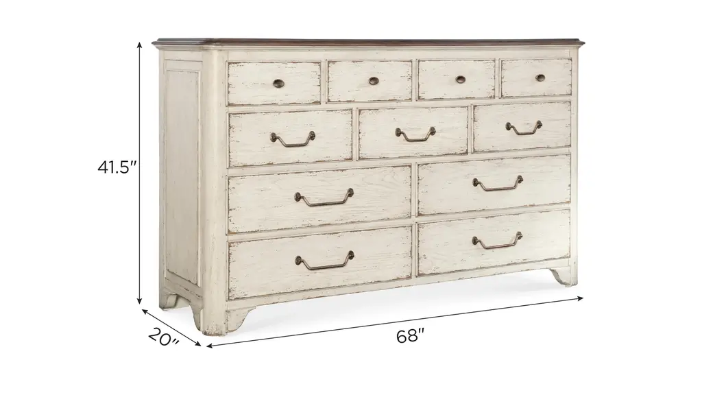 In a two-tone finish with the time-worn daisy on the base and the warm honey on the top, the Americana 11-Drawer Dresser is a classic, charming design with a nostalgic flair. There are 11 self-closing drawers, and all 4 top drawers have black removable felt liners. The second left drawer has black removable felt-lined jewelry storage, and the bottom two drawers are cedar-lined. All drawers have the honey finish inside. Crafted of oak veneers with cedar on the bottom drawers with metal alloy pulls in an antique bronze finish.
