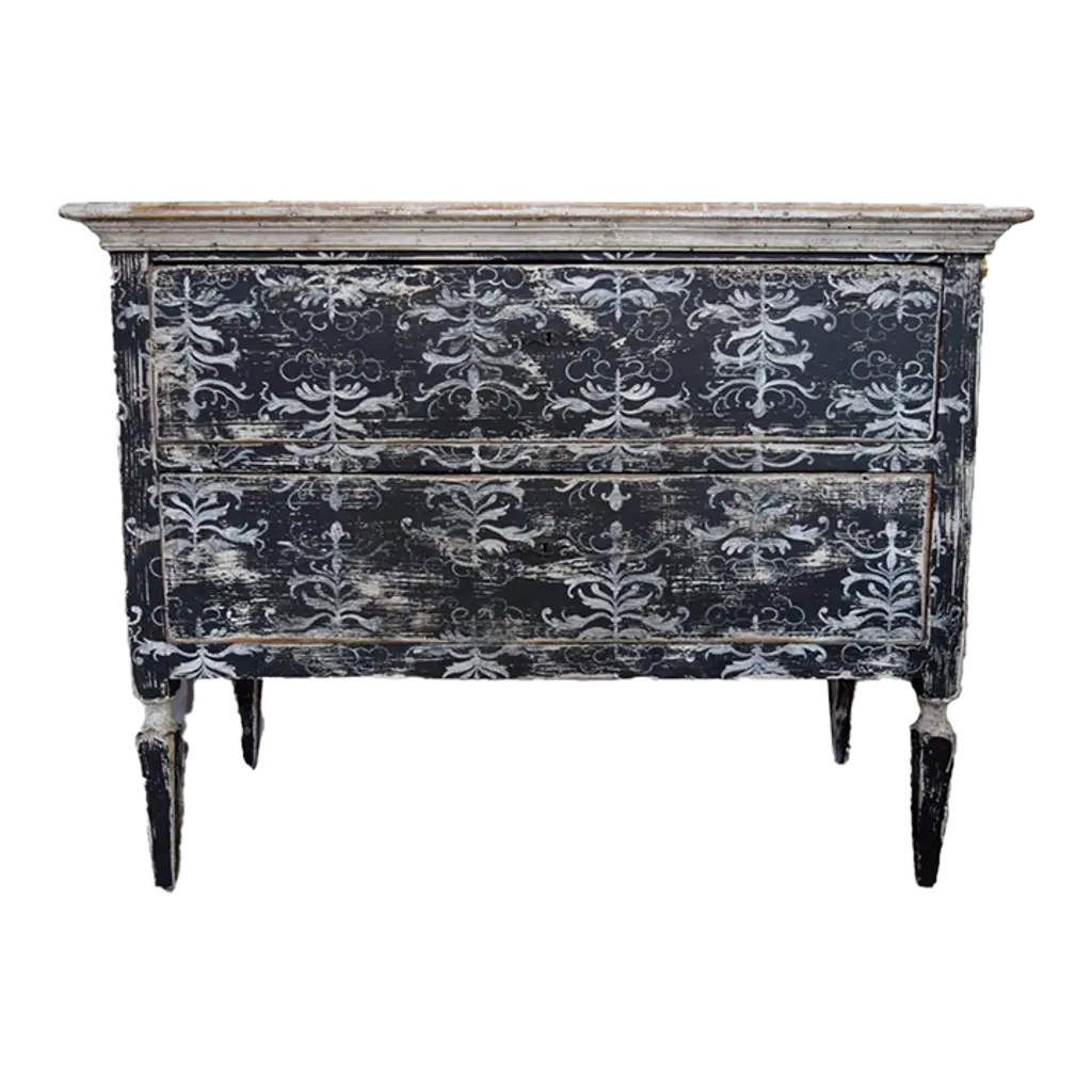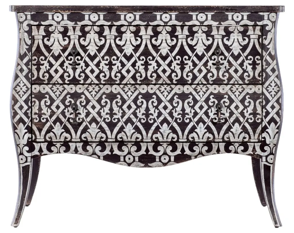 Reimagining a historical design, the Americana Bombay Chest features a striking contrast with a white fleur-de-lis pattern over its exterior. The two self-closing drawers have a beautifully finished interior. Crafted of Oak Veneers with metal alloy tear-drop pulls in an antique bronze finish.