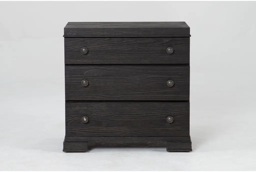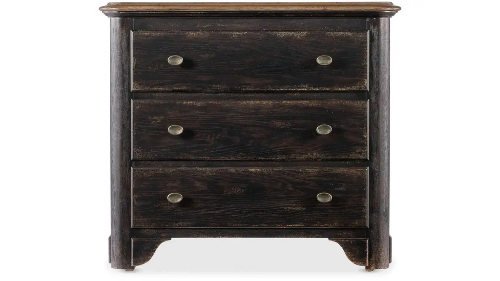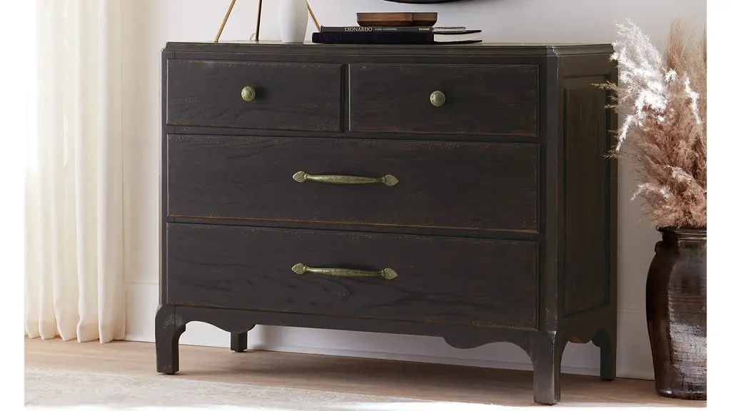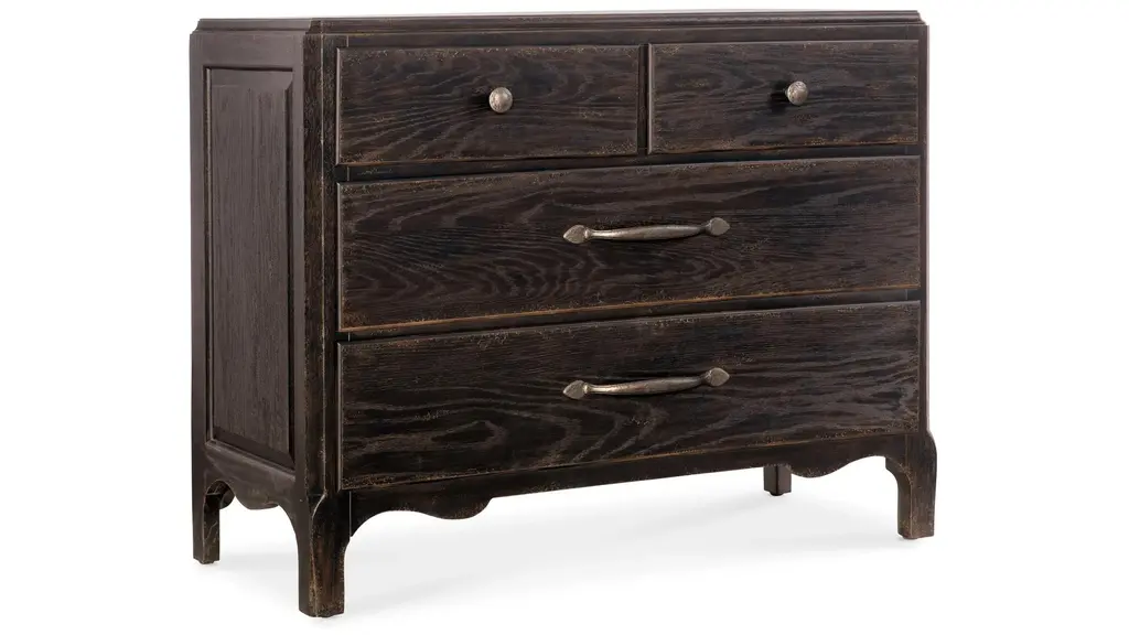 In a classic, charming design with a nostalgic flair, the Americana Bachelor's Chest is reminiscent of a simpler, more genteel time. It has a scalloped shaped base and is finished in a deep, dark molasses finish on Cathedral oak veneers. The four self-closing drawers have the warm honey interior finish. Metal alloy bar and knob pulls are in an antique bronze finish.