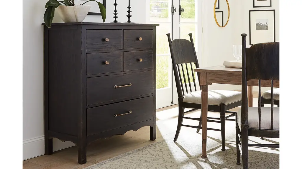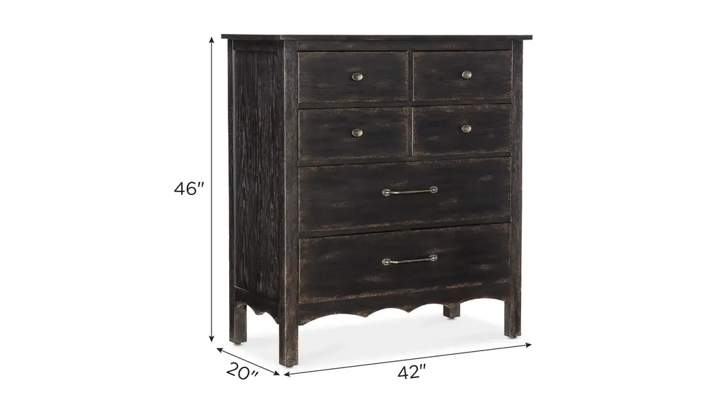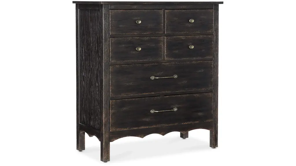 In a classic, charming design with a nostalgic flair, the Americana Chest is crafted of oak veneers with a solid-wood edge top, a scalloped-shape base and finished in the deep, dark molasses. The drawers are self-closing and finished on the interior in the warm honey color. The top drawers have a black removable felt liner and the bottom drawer is cedar-lined. Metal alloy knob pulls have an antique bronze finish.
