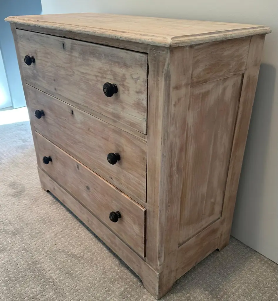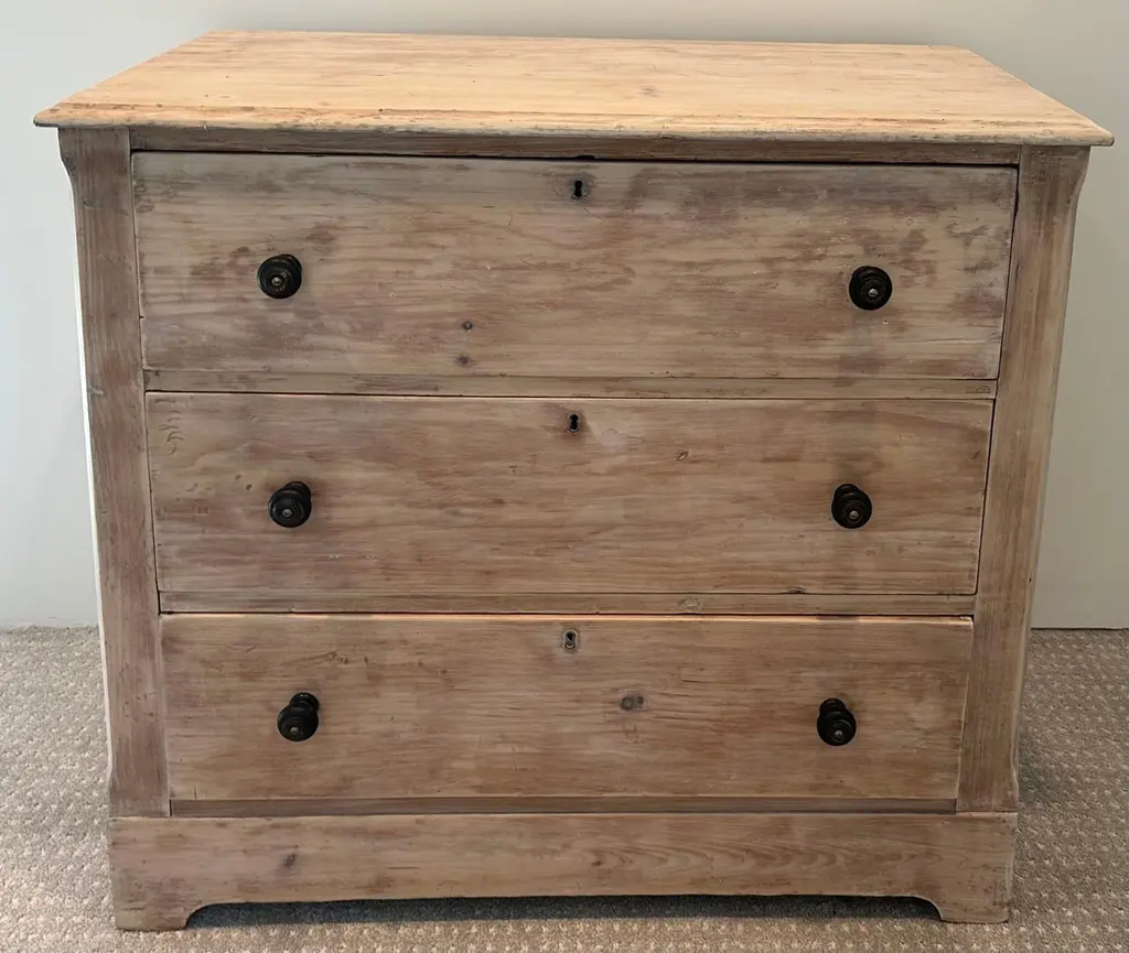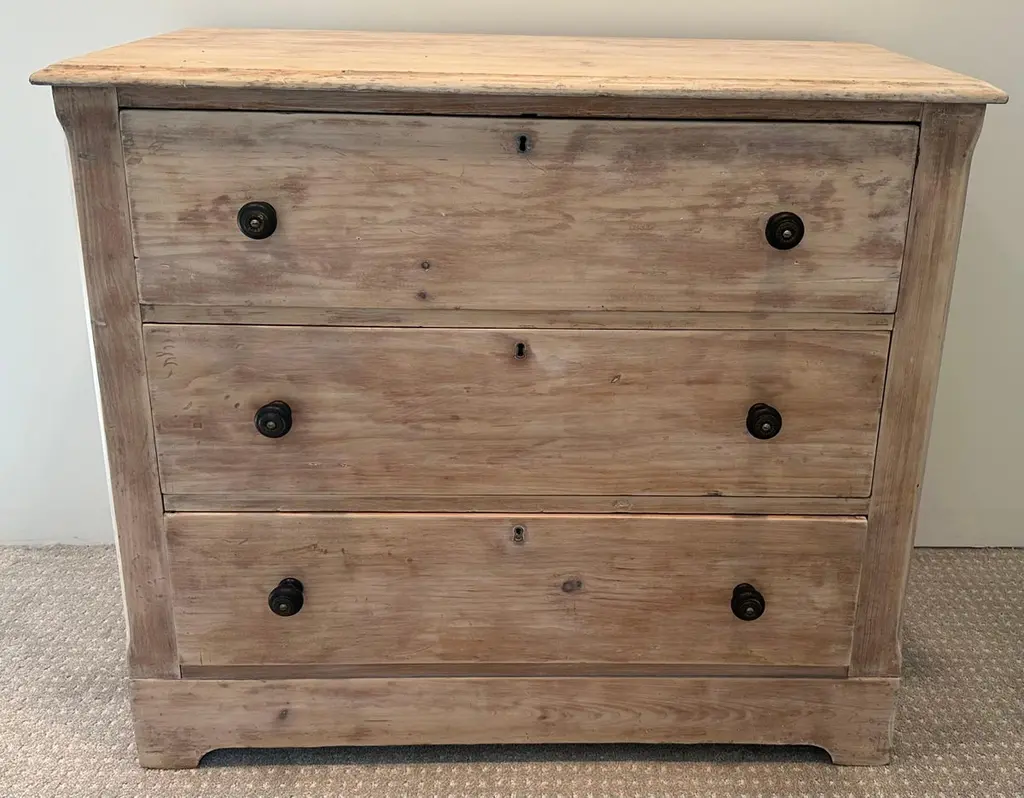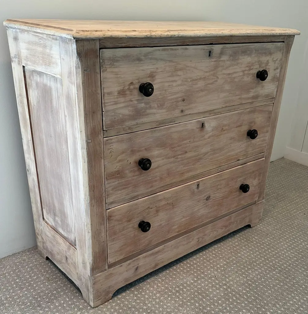 Charming and useful, this lovely rustic country style 3 wide drawer chest dates to the 19th century. The wood has been white washed to give it added interest and is accented perfectly by the darker metal iron knobs. This chest would make an excellent addition to a bedroom, nursery, or cottage/cabin style home!