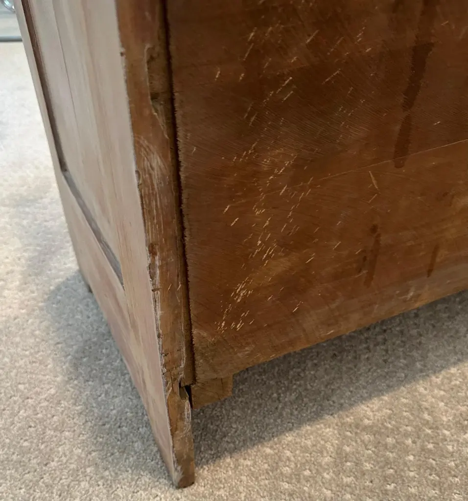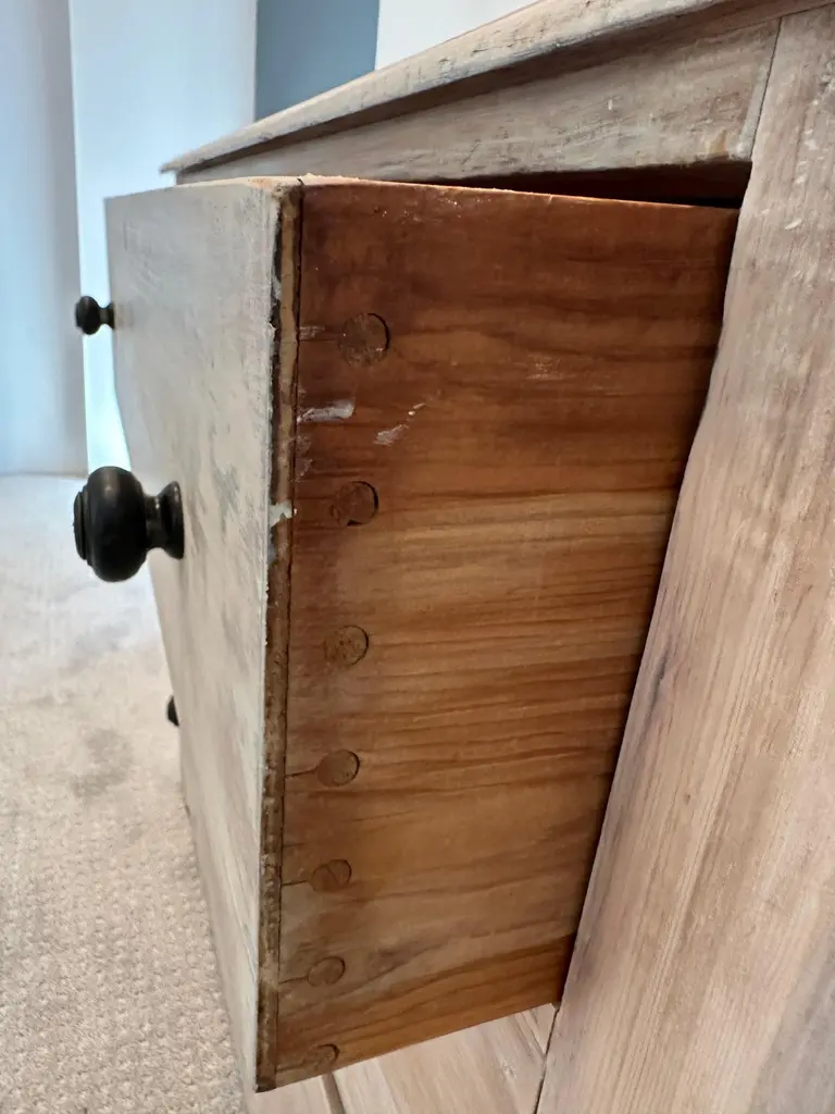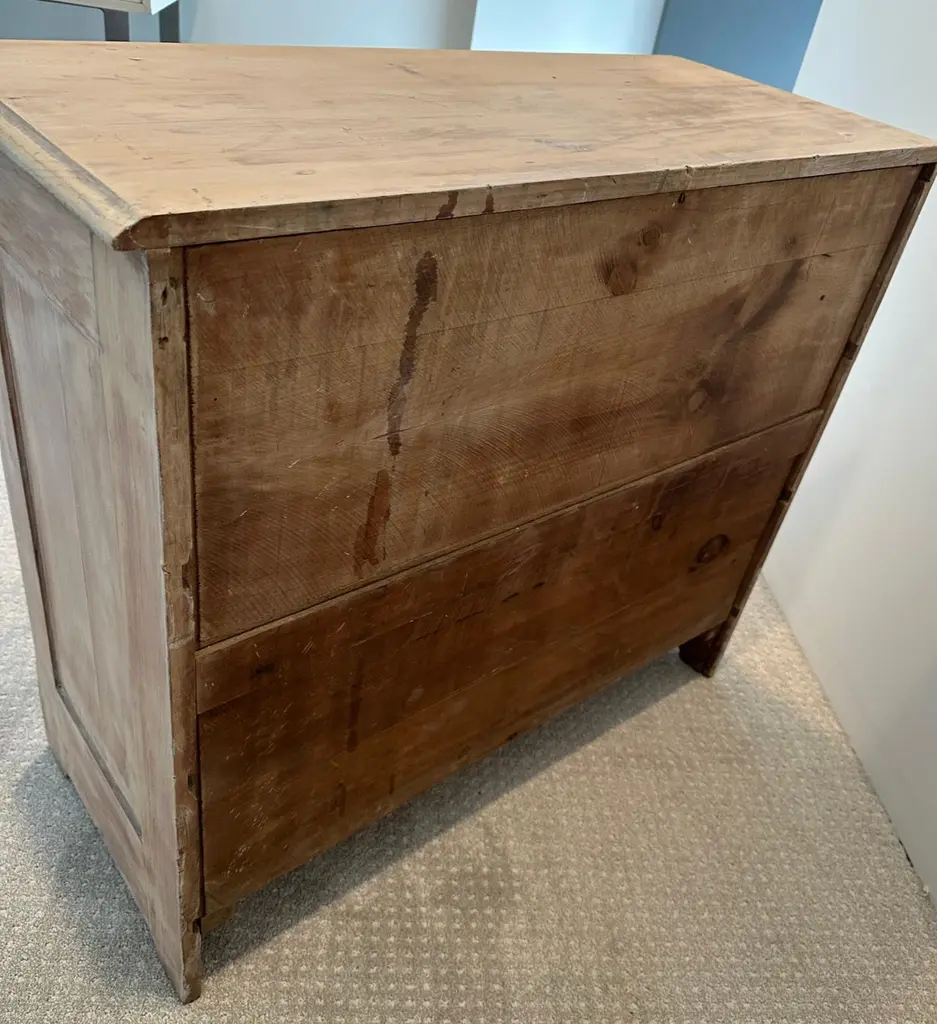 Charming and useful, this lovely rustic country style 3 wide drawer chest dates to the 19th century. The wood has been white washed to give it added interest and is accented perfectly by the darker metal iron knobs. This chest would make an excellent addition to a bedroom, nursery, or cottage/cabin style home!