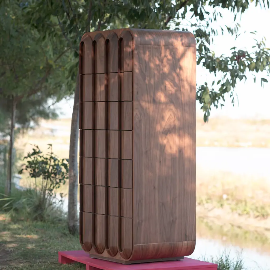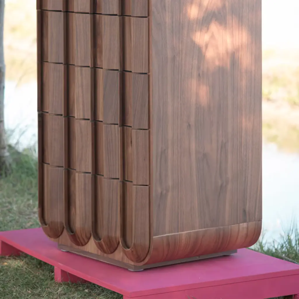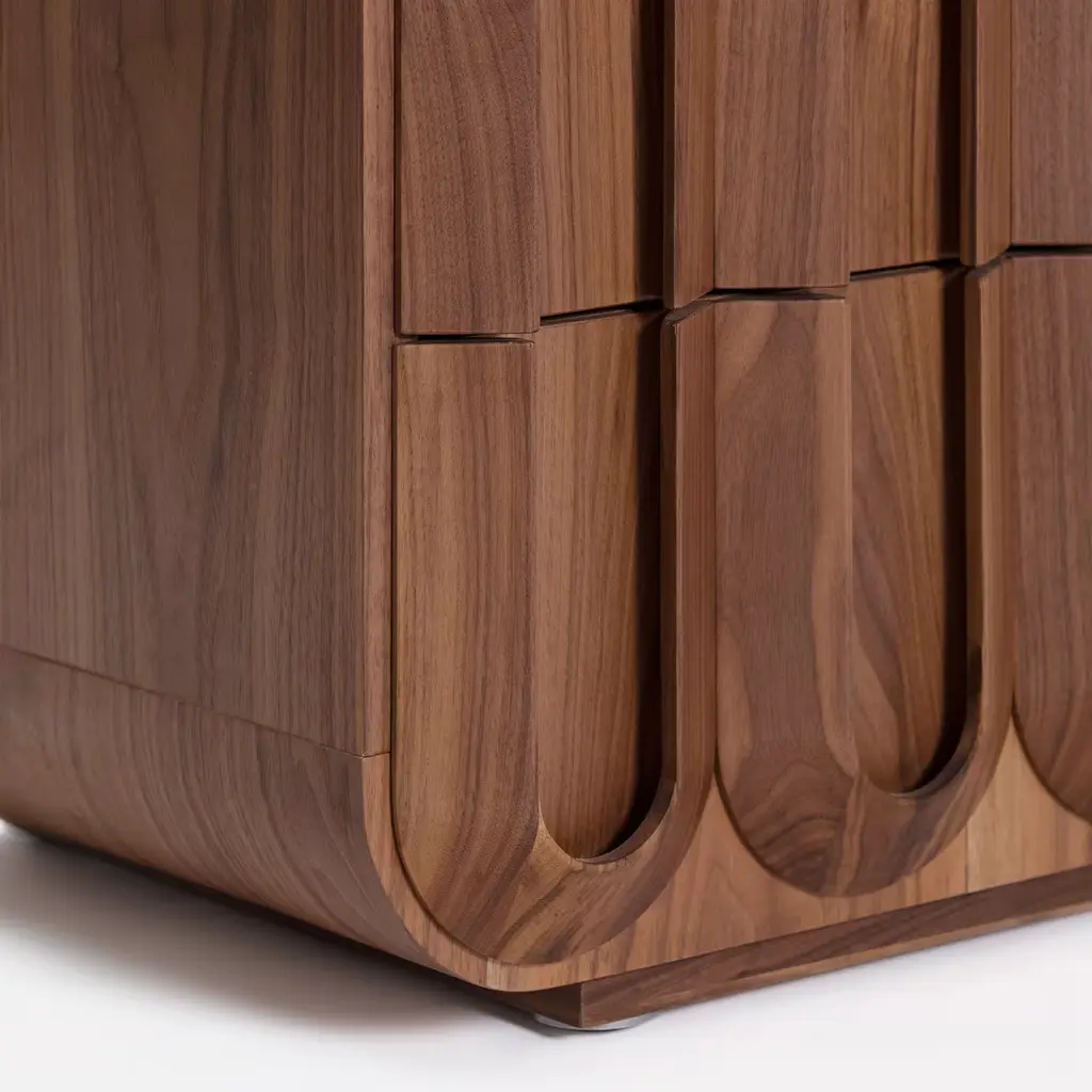A splendid display of traditional craftsmanship and a celebration of wood, this gorgeous chest of drawers will make for a singular addition to a warm and cozy bedroom decor. Handmade of Canaletto walnut, it features seven drawers characterized by a series of textured arches in solid wood, milled with exceptional mastery.