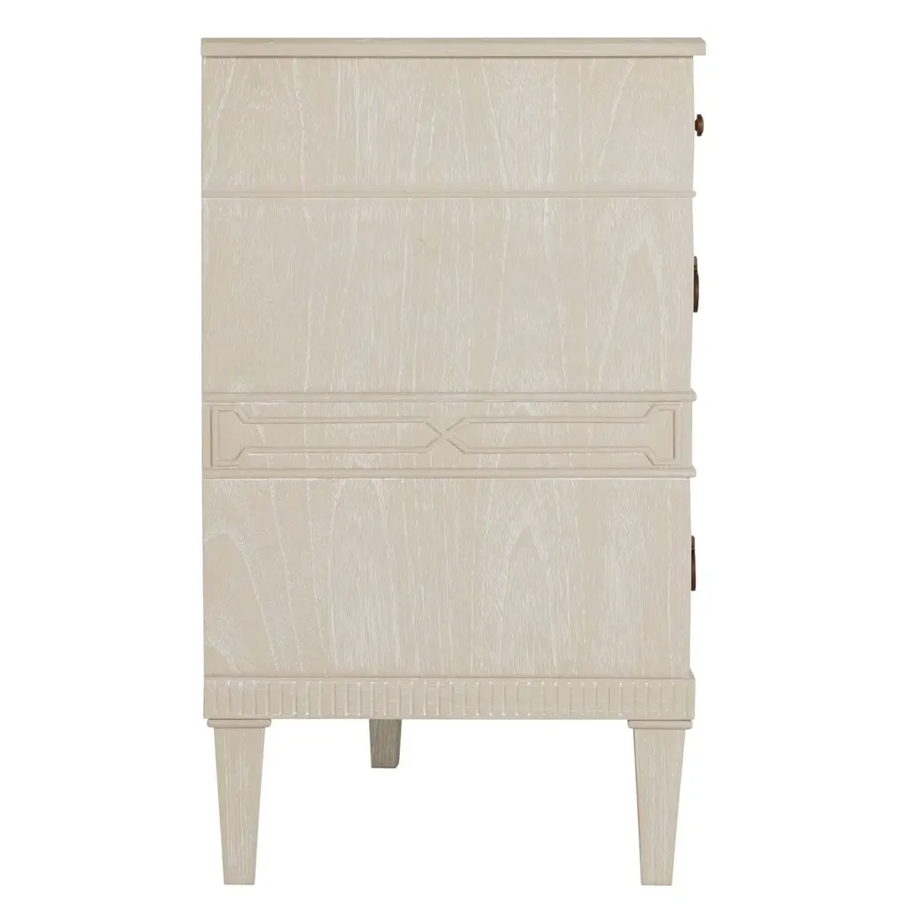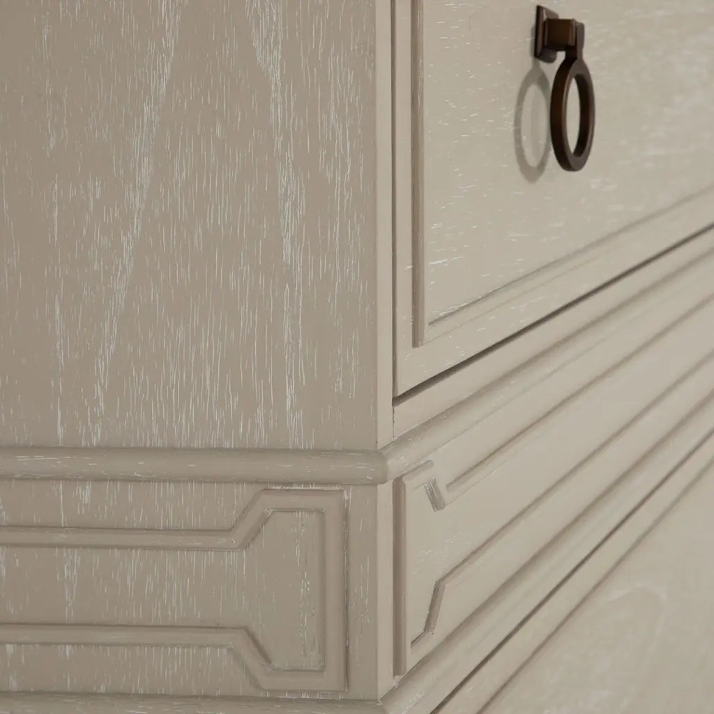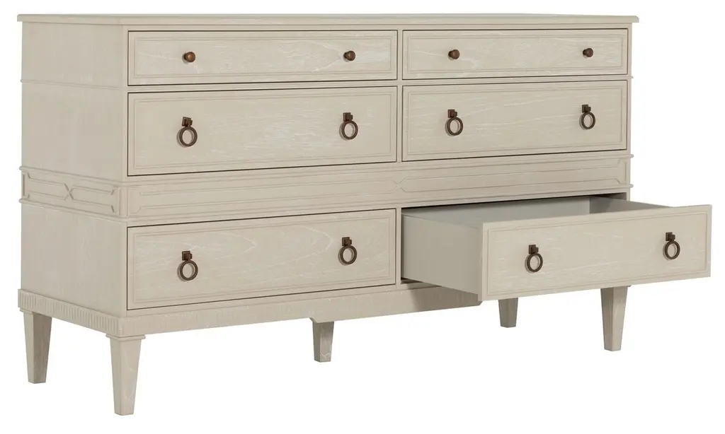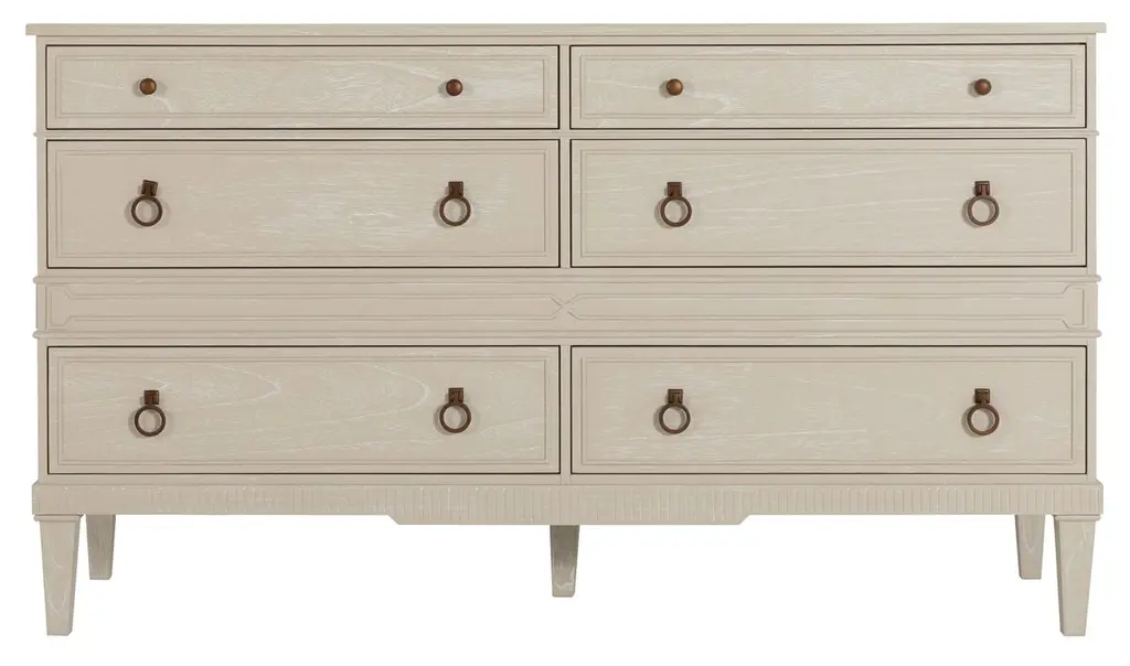 The Archie Dresser presents a harmonious blend of traditional design with modern flair, crafted from mindi wood. The subtle texture enhances the wood grain, while the metal accents add a refined touch. With six spacious drawers, this dresser offers ample storage for any bedroom or living space, seamlessly balancing form and function. Its timeless appeal and versatile design make it a standout addition to various decor styles.