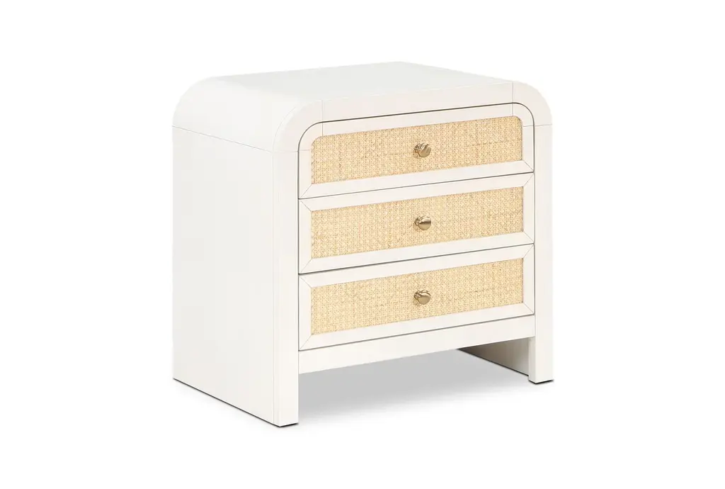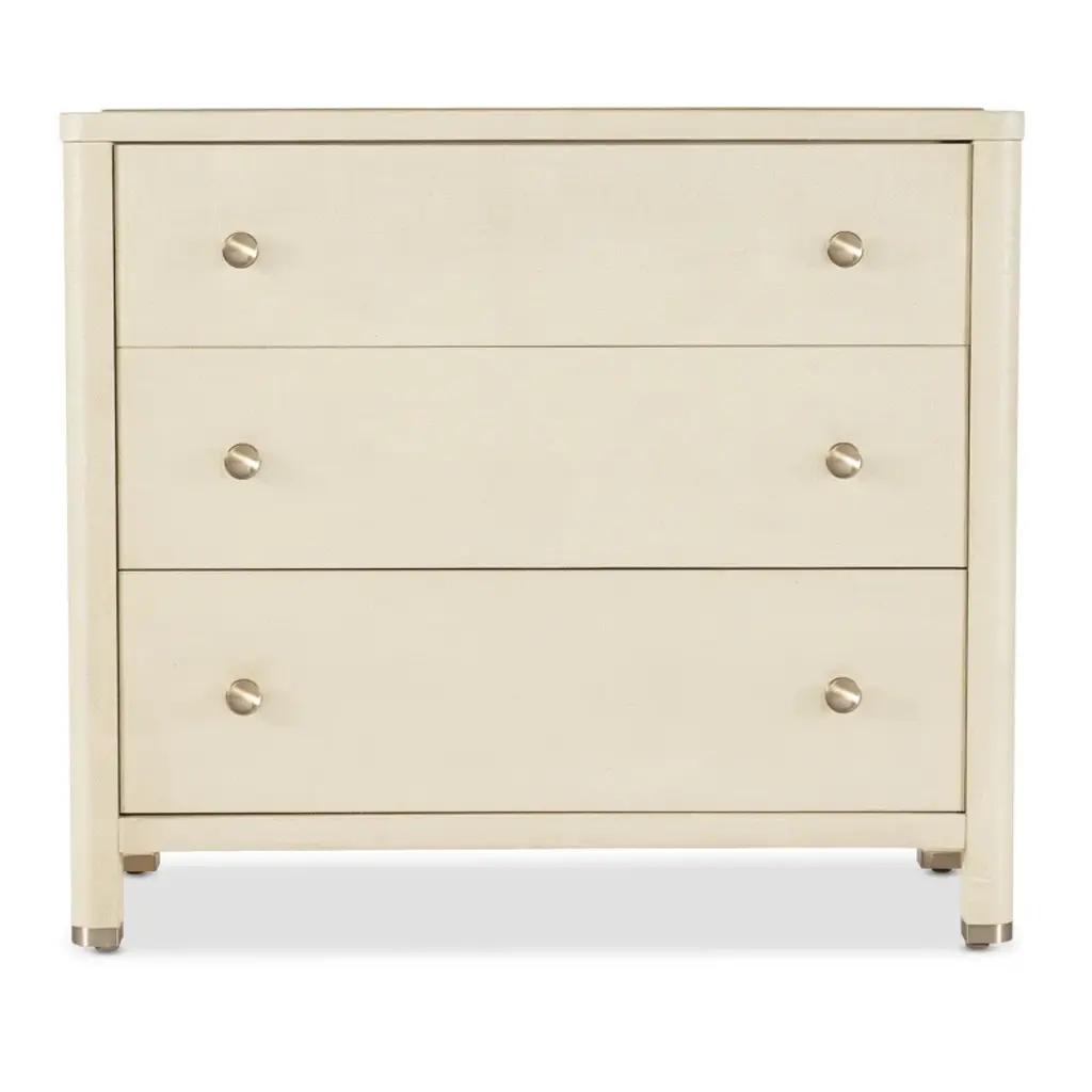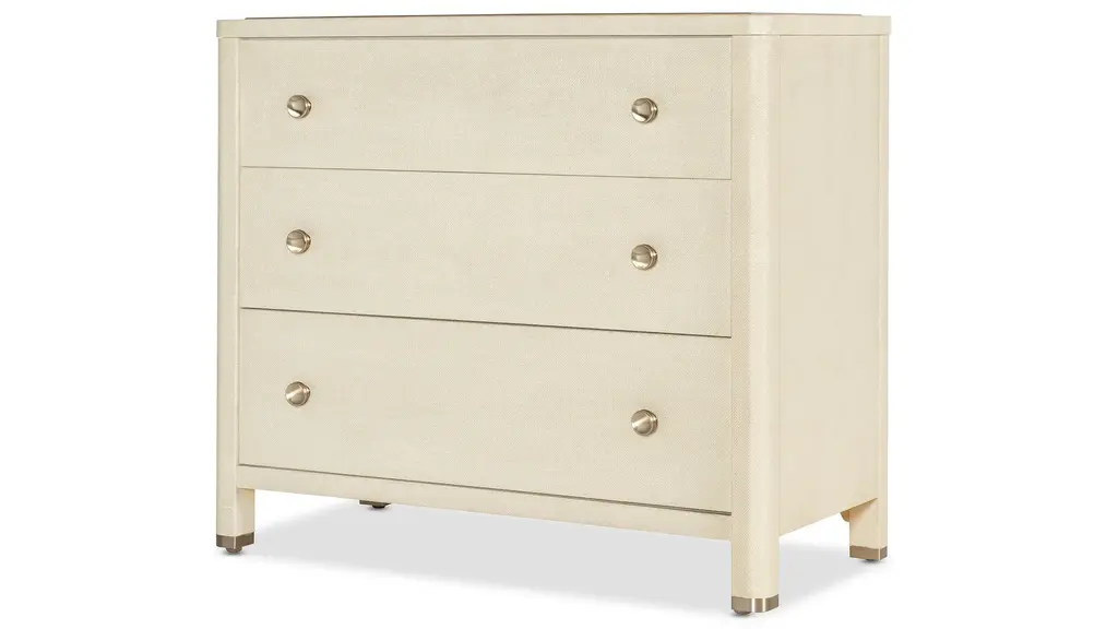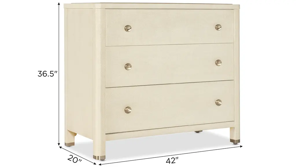 The Archives Three-Drawer Chest brings natural textures to your bedroom decor with its raffia-wrapped exterior and Flax finish. This chest offers three spacious drawers, complete with oak veneered sides and bottoms. The combination of raffia and woven cane details adds a unique touch of coastal elegance to your space.