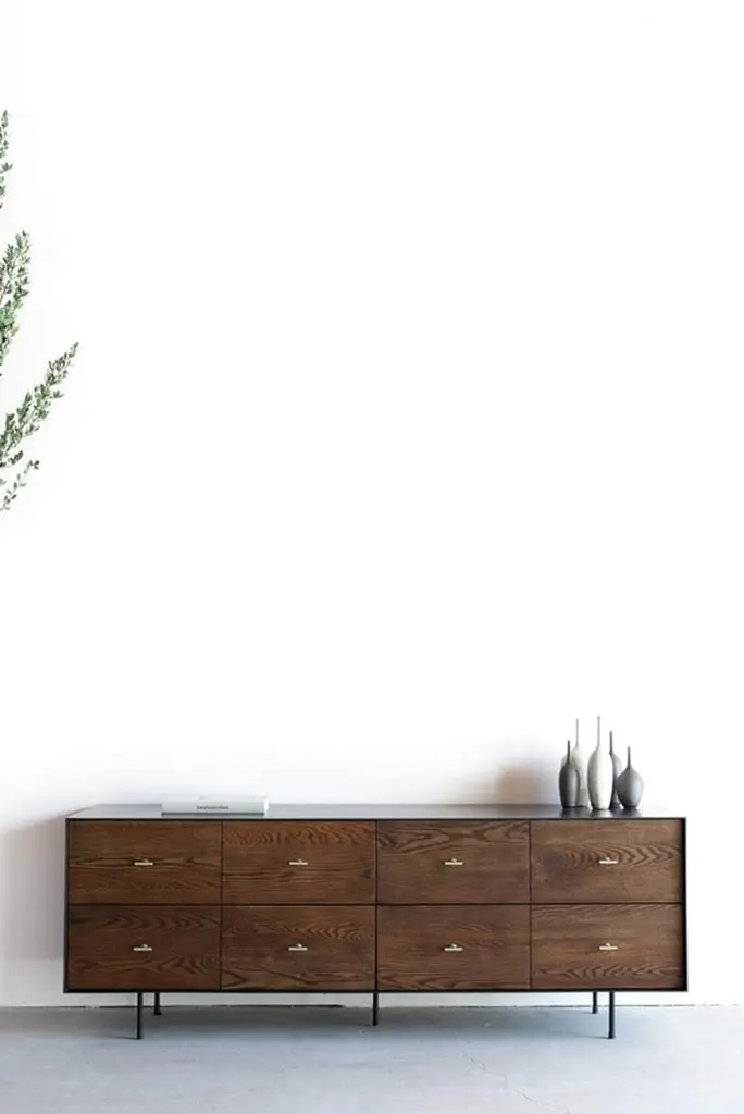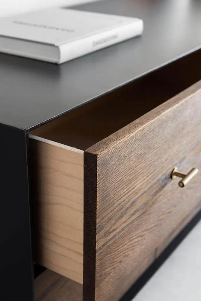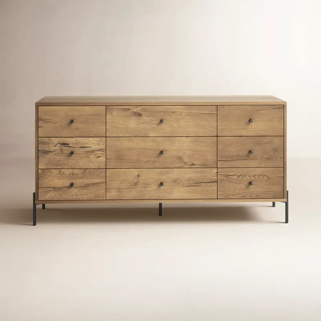 This Dresser is Custom Made in Los Angeles. Industrial steel casing is sheered to size and attached to a substrate. Wood is cut to size and joined to drawer face. Four drawers with brass pulls and soft close slides. OAK + INDUSTRIAL STEEL + BIRCH INTERIOR + BRASS,POLY + HARDWAX OIL FINISHCUSTOMIZE THIS PIECEFor all furniture, protection from heat and moisture is crucial to the longevity of the piece. To help prevent scratches, use adhesive felt pads, coasters, placemats, and avoid sliding objects across the surface of the piece when possible.Lacquer + Paint + Metal Surfaces - Dry dust with a clean microfiber or feather duster. Wipe with a slightly damp microfiber towel and mild cleaner as needed. Wipe dry promptly. We recommend that you clean with ammonia-free Windex or a mild surface cleaner. Please stay away from bleach, alcohol, or petroleum based cleaners. You may use a general purpose wood cleaner.Avoid using furniture polish as over time it can accumulate and leave a residue.Wax + Oil Finish - Dry dust with a clean microfiber or feather duster. Wipe with a slightly damp microfiber towel. Wipe dry immediately. Clean with ammonia-free Windex or a mild surface cleaner. Stay away from bleach, alcohol, or petroleum based cleaners. Our natural wax and oil finishes will dull over time. Wax or teak oil may be reapplied as needed using a soft white cloth. Raw Wood Dry dust with a clean microfiber or feather duster. Use a damp microfiber towel or soft brush as needed. Do not use any product containing wax or oil to clean.Outdoor Furniture - Outdoor furniture may require frequent oiling. A cover is strongly recommended for all outdoor furniture. Avoid prolonged exposure to moisture and/or direct sunlight. If exposed to rain, allow cushions to air dry completely before putting them back on the frame. Leather Care - Dry dust with a clean microfiber or feather duster. Wipe with a slightly damp microfiber towel. Do not use cleaning products on the leather. The recommended leather conditioner is Skidmore’s Original Leather Cream. Marble + Stone - Dry dust with a clean microfiber or feather duster. Wipe with a slightly damp microfiber towel. Wipe dry immediately. For daily cleaning we recommend using Orange Glo and/or Method Stone Cleaner on the marble. All marble and stone surfaces are protected with a sealer. To maintain the overall appearance and protection of the marble or stone, reseal with Miracle 511 Seal & Enhance. It is important to use coasters and clean up moisture immediately on marble and stone surfaces.Additional information:Available in 4 DoorDimension: 72"W + 20"D + 35"H (6 Drawer)