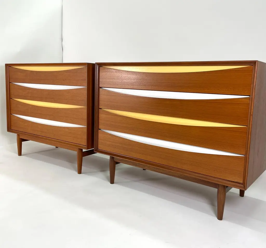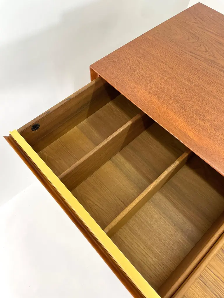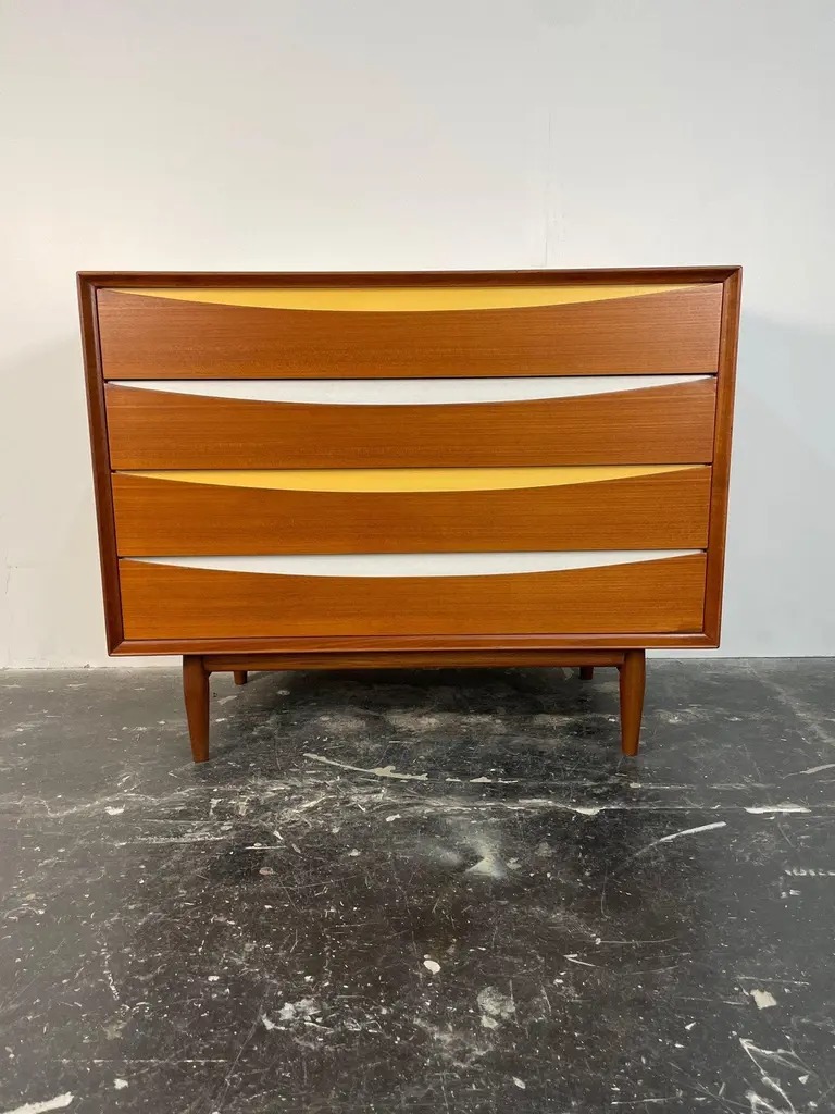 An iconic design by Arne Vodder Triennale 4-drawer dresser was produced by Sibast Mobler, circa 1950. Constructed in teak, the 4-drawer dresser is a classic piece of Danish Modern furniture. The drawers are alternating yellow and white. The drawer faces are both architectural and functional with ellipse-shaped finger reveals. The Triennale 4 Drawer Dresser by Arne Vodder for Sibast is a stunning piece of furniture designed with both functionality and aesthetics in mind. Crafted by the renowned Danish designer Arne Vodder, this dresser exemplifies mid-century modern design principles with its clean lines, minimalist form, and exquisite craftsmanship.This is a gorgeous low dresser. The pop of color works so well in a modern home, a bedroom or a living room. Teak and mahogany and premium veneers, the dresser boasts durability and longevity. Its sleek silhouette features 4 spacious drawers, providing ample storage space for clothing, accessories, or other belongings, while maintaining a clutter-free appearance.The dresser's distinctive design is characterized by its elegant tapered legs, subtle curves, and seamless integration of handles, which contribute to its timeless appeal. The attention to detail and precision in construction are evident in every aspect of the piece, showcasing the mastery of both design and craftsmanship.Whether placed in a bedroom, living room, or hallway, the Arne Vodder Triennale 4 Drawer Dresser adds a touch of sophistication and functionality to any space. Its versatility, quality, and iconic design make it a cherished addition to any modern interior aesthetic, seamlessly blending style with practicality.The piece is signed with Danish Control logos on the inside top drawer. This dresser has been completely restored by us and is in excellent condition. This is hands down the highest quality Danish dressers of the period. Circa 1950's.