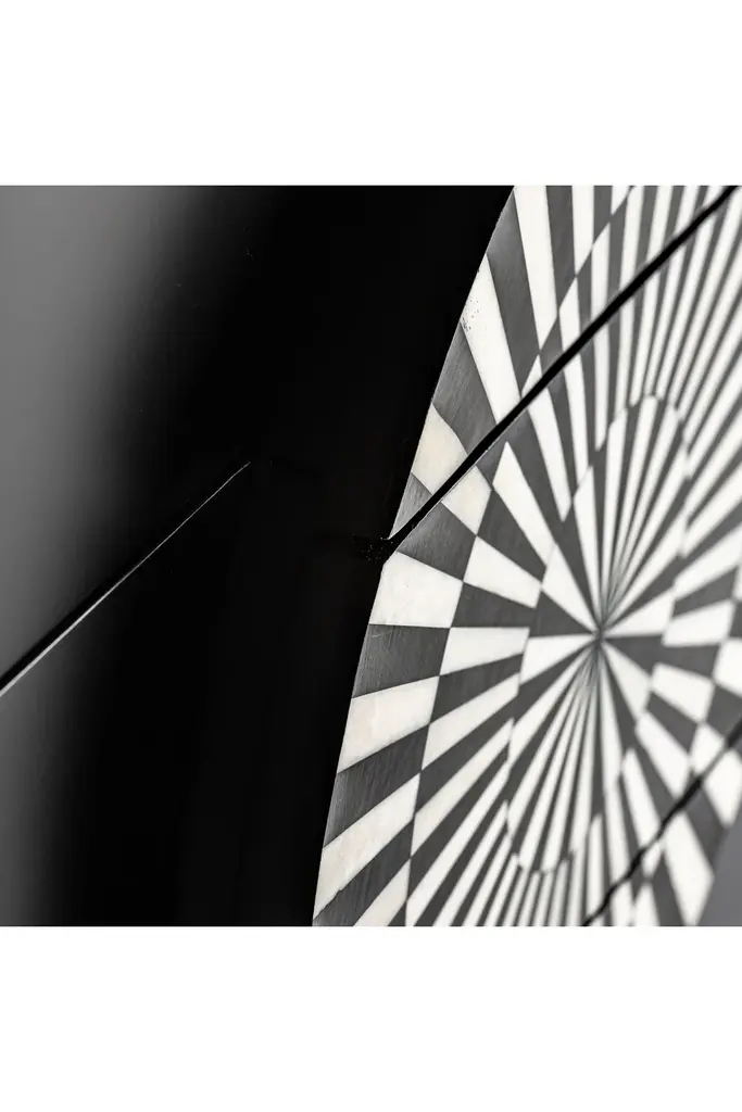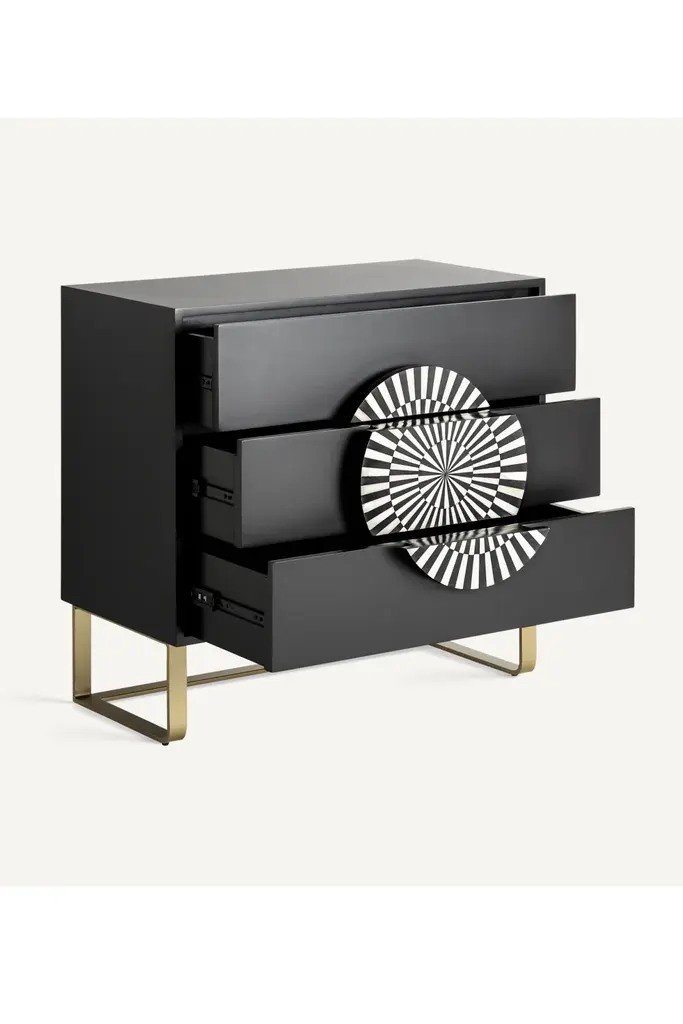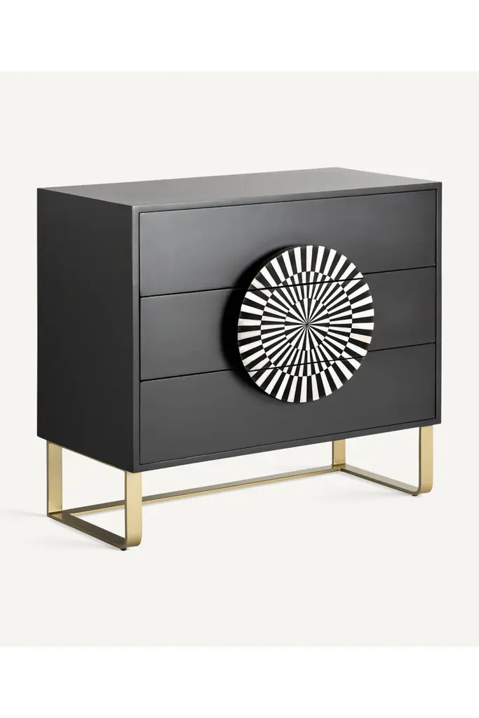 Get inspired by the golden era with the Gatsby Chest of Drawers from Vical Home. Crafted from iron and detailed in bone, this two-tone black and white design captures the essence of Art Deco style. The Gatsby art deco chest of drawers not only serves as storage space but also as a piece that transports you back to a time of splendor and glamour. Make a bold statement with Gatsby in your home.