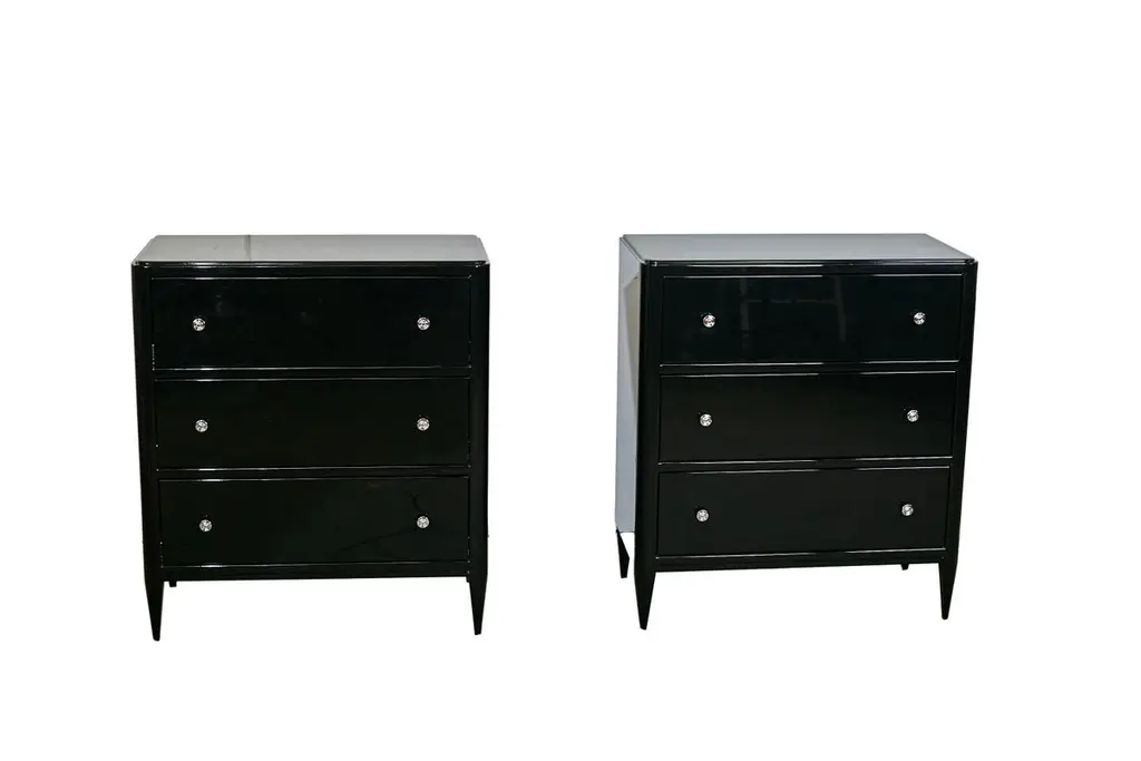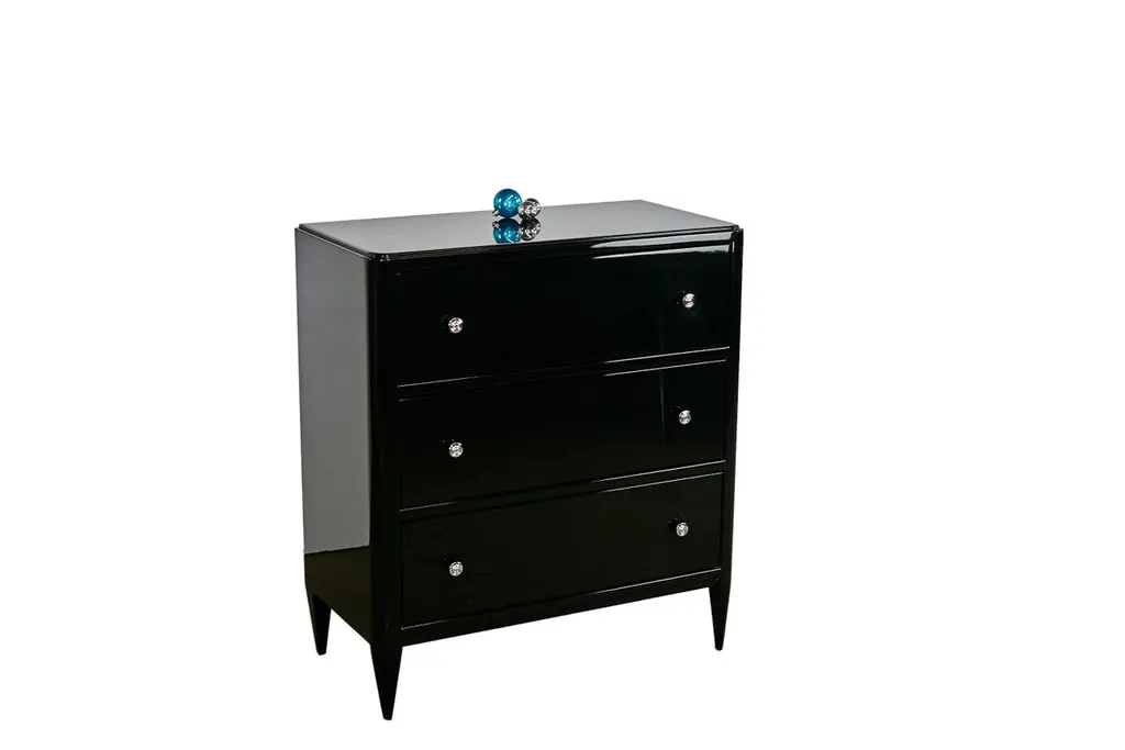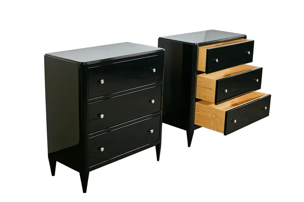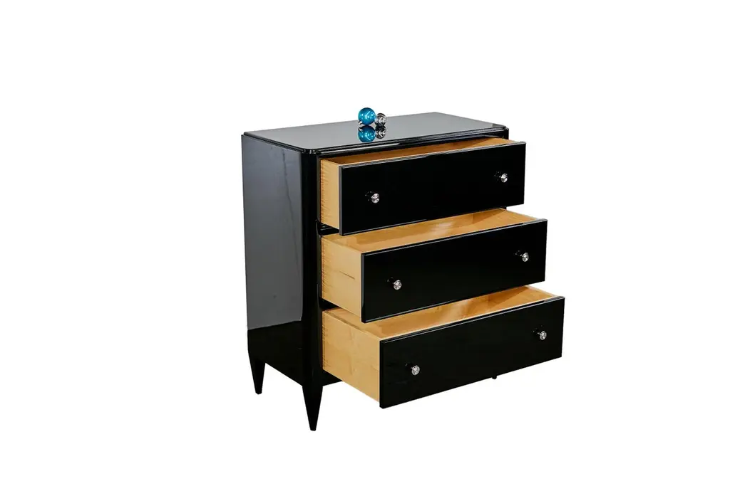 Beautiful little chest of drawers with very elegant piano lacquer and chrome handles. The chest of drawers has three drawers and is equipped with round chrome handles. The surface has been sealed with a high-gloss varnish. The black surface has been varnished and finished with black piano lacquer.As with all of our furniture, you are purchasing the highest quality here. The entire piece of furniture is covered with a multi-layer structure of various varnishes and primers and varnished in several layers. A piece of history and craftsmanship to which we were able to restore the old shine of the 1920s with a lot of love and perfection.Style: Art DecoPlace of origin: GermanyPeriod: Mid-20th centuryMaterials and techniques: Chrome, lacquer, piano lacquerCondition: New. Varnished in high gloss.The illustrations may differ from the purchased item in the following points: Grain, color, size and veneer image.We look forward to your ideas!The price refers to a single chest of drawers only. The illustrations may differ from the purchased item in the following points: Grain, color, size and veneer image. Please do not hesitate to contact us in this regard.