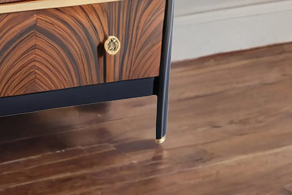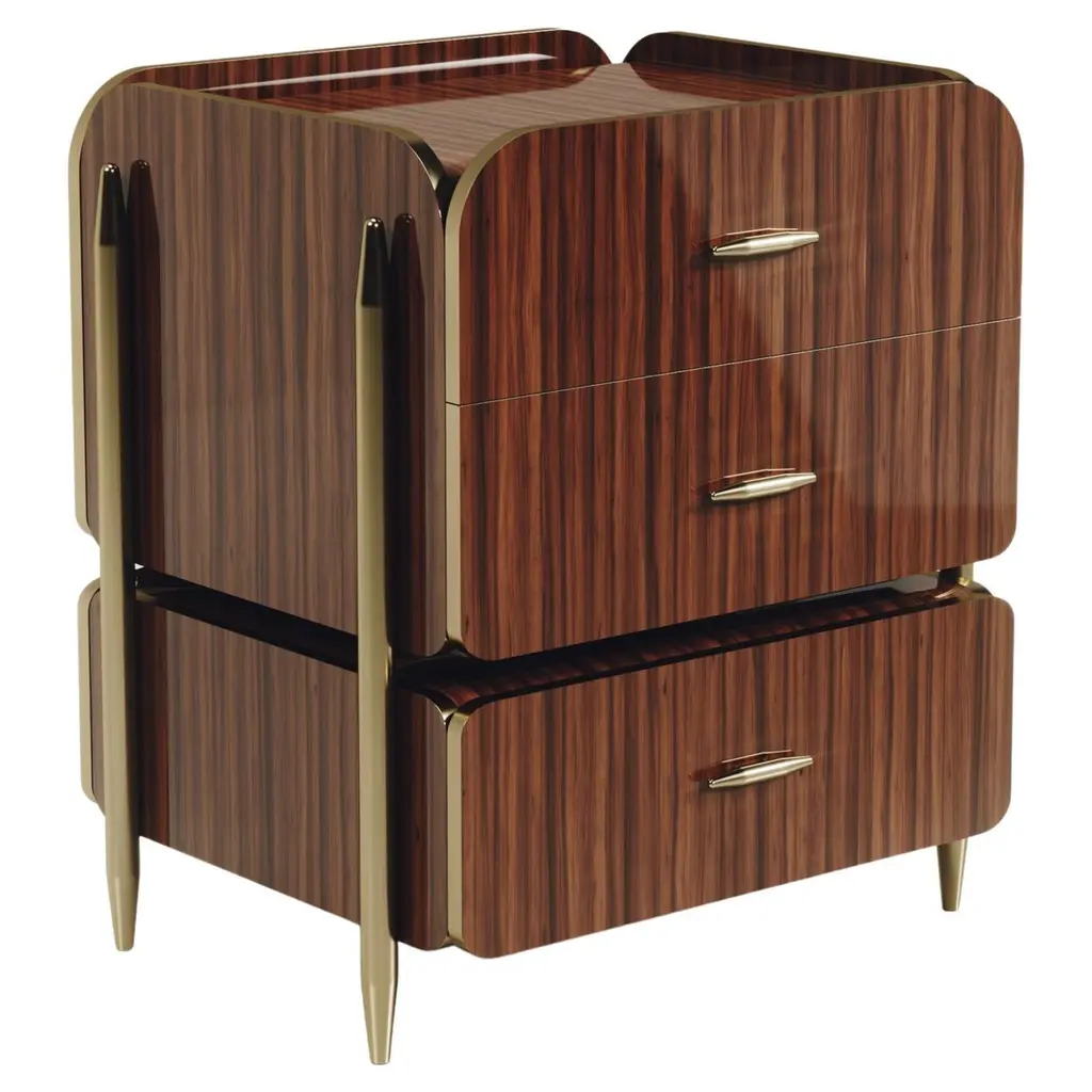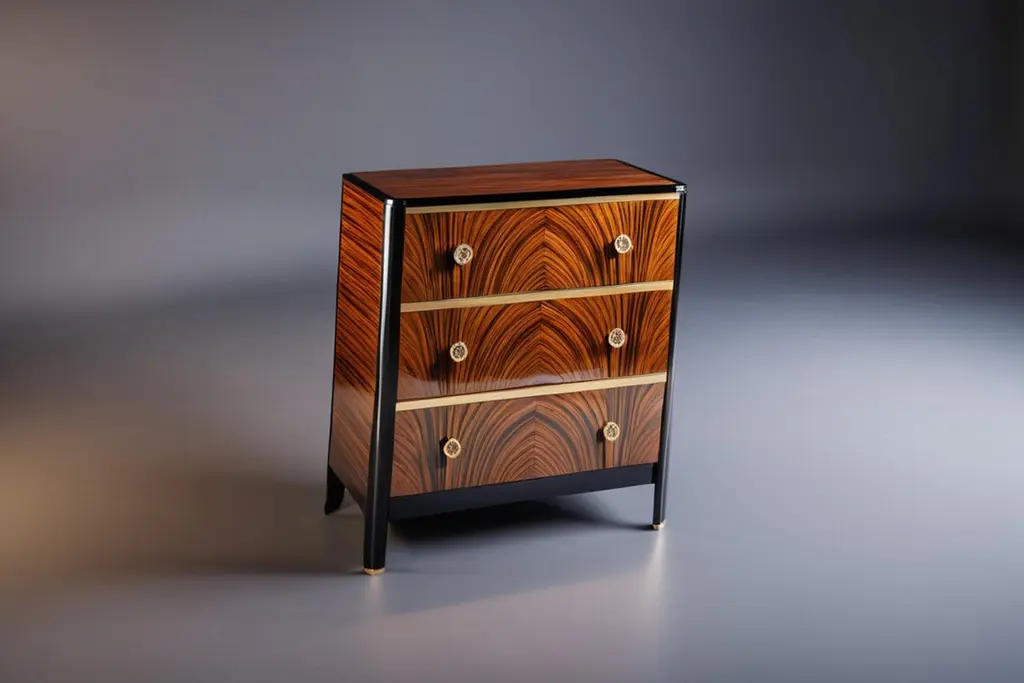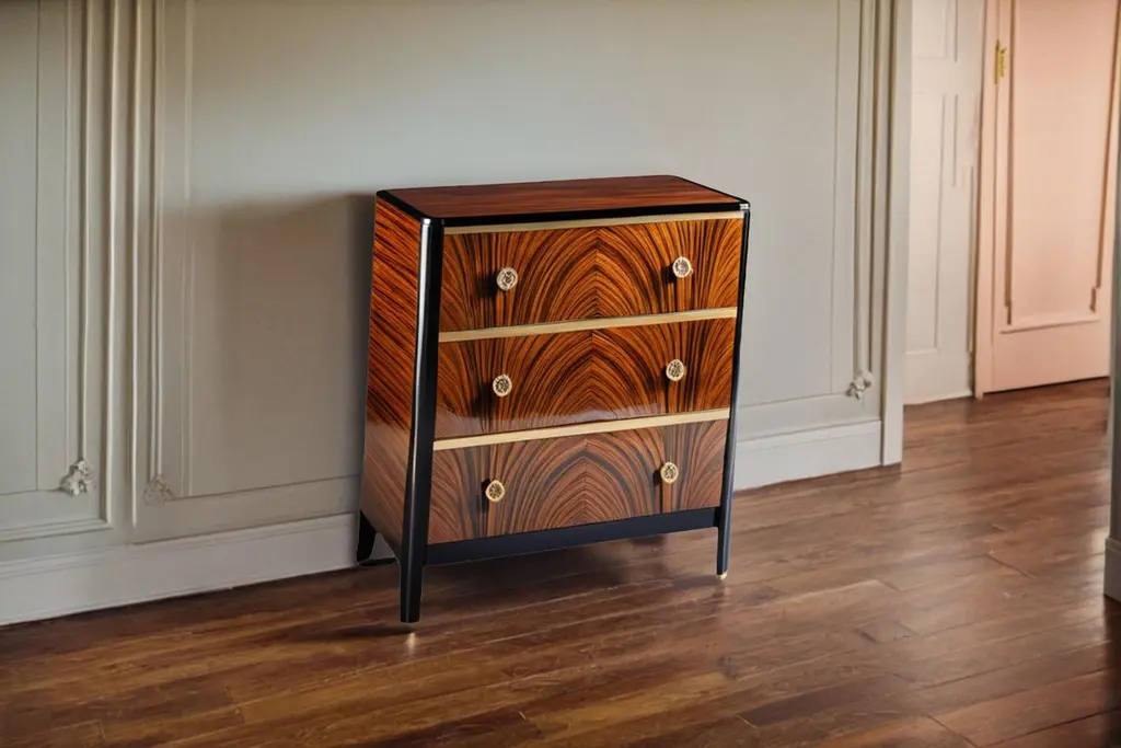 Beautiful little chest of drawers with very elegant macassar veneer and brass handles. The chest of drawers has three drawers and is equipped with round brass handles. The surface was sealed with a high-gloss varnish. The black surface was painted and refined with black piano lacquer.As with all of our furniture, you are purchasing the highest quality here. The entire piece of furniture is covered with a multi-layer structure of various varnishes and primers and has a multi-layer finish. A piece of history and craftsmanship that we were able to give the old splendor of the 1920s with a lot of love and perfection.Style: Art DecoPlace of origin: GermanyPeriod: mid-20th centuryMaterials and techniques: makassar, molded glue, solid wood, veneered, lacquered, piano lacquerCondition: New. Painted in high gloss.If you would like the chest of drawers in a different size, paint color or wood, please contact us!We look forward to your ideas!The illustrations differ from the purchased item in the following points: grain, color and veneer appearance.